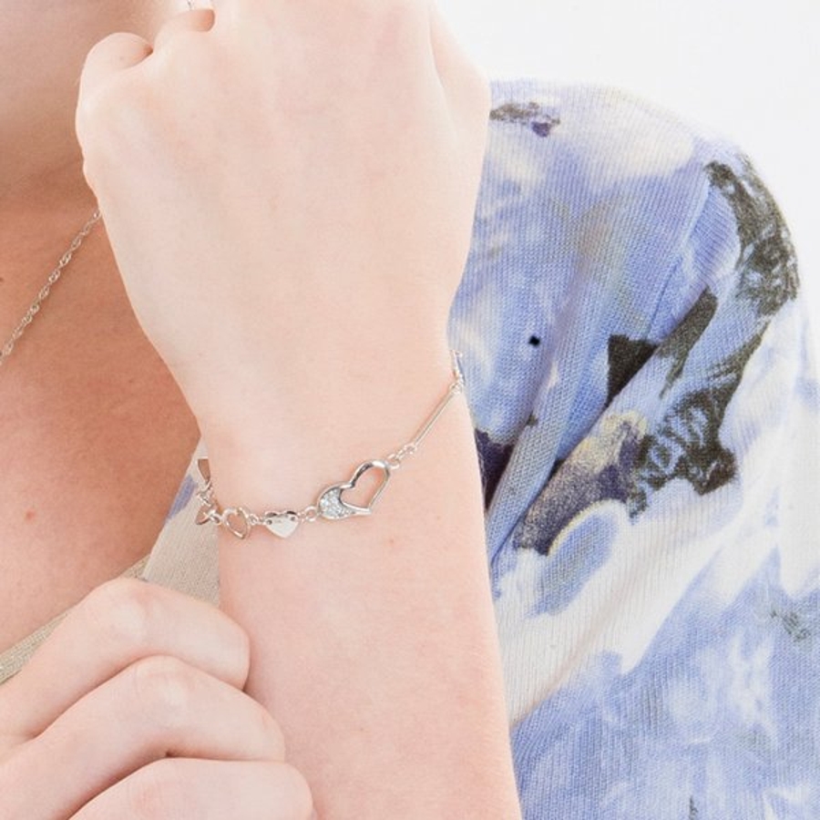 手元を繊細に彩るシルバーブレスレットに女性に人気のあるハート。