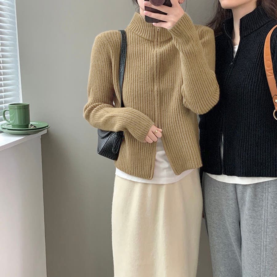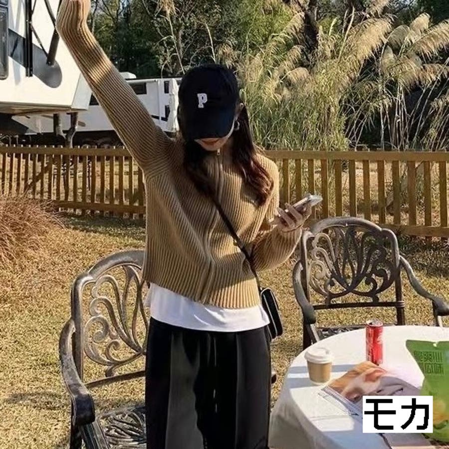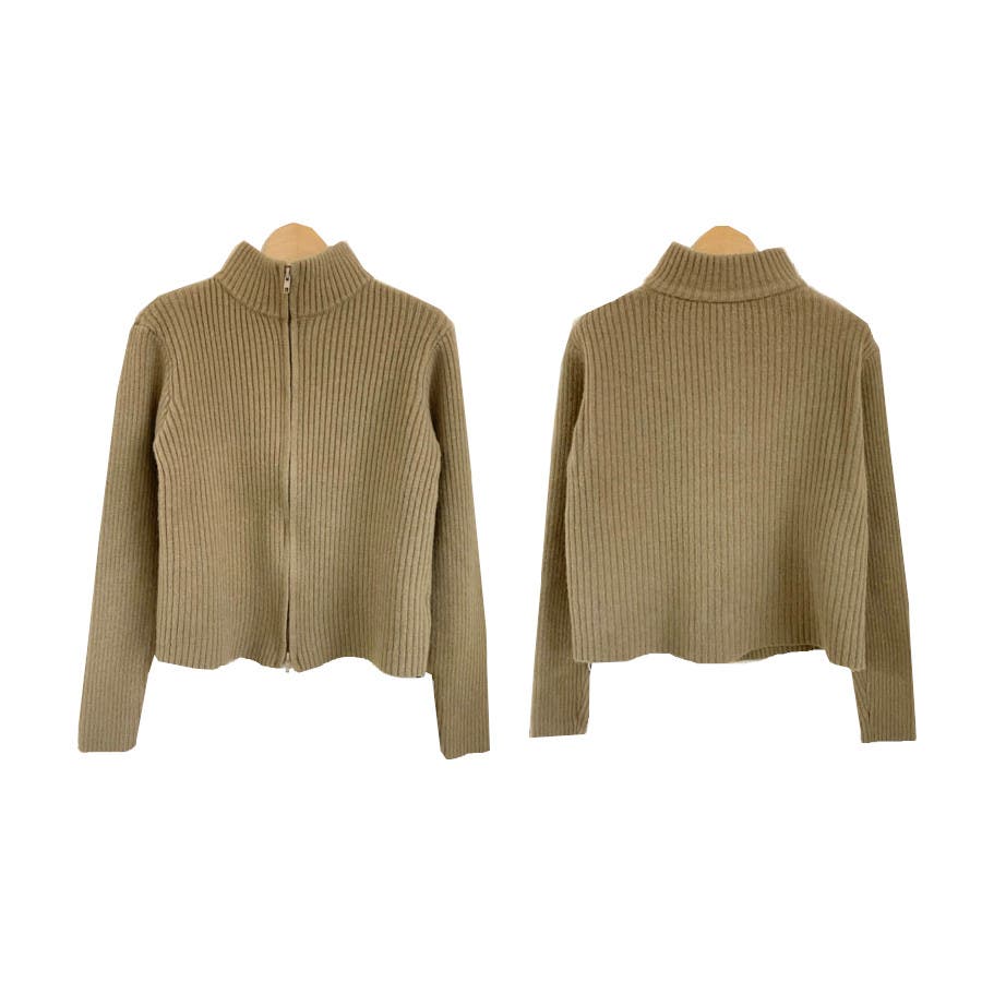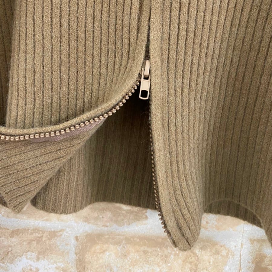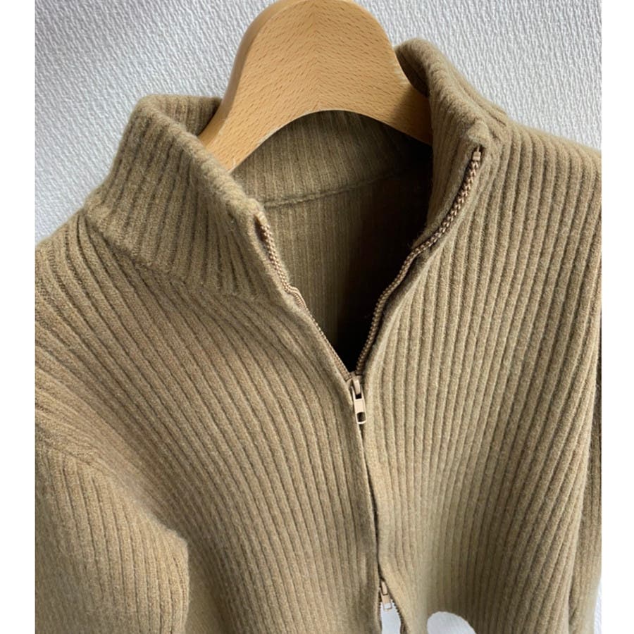 程よい厚みのニット素材でハイネックタイプのジップカーデなのでジップの開け方で雰囲気を変えられるのも◎