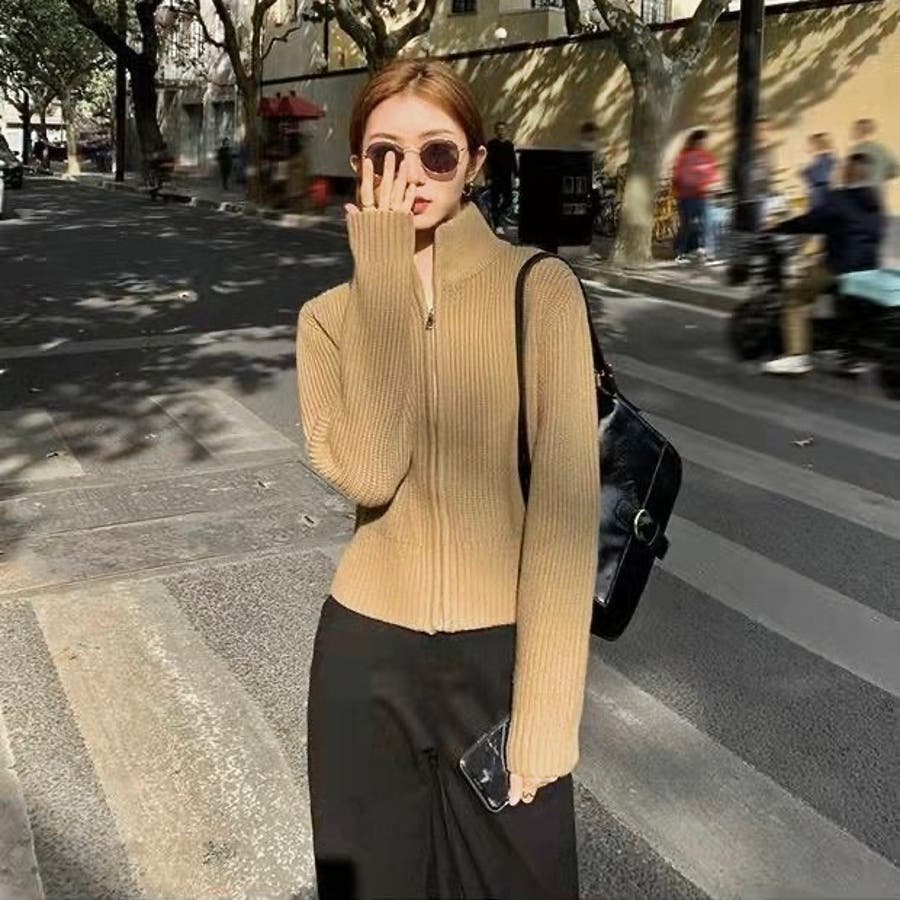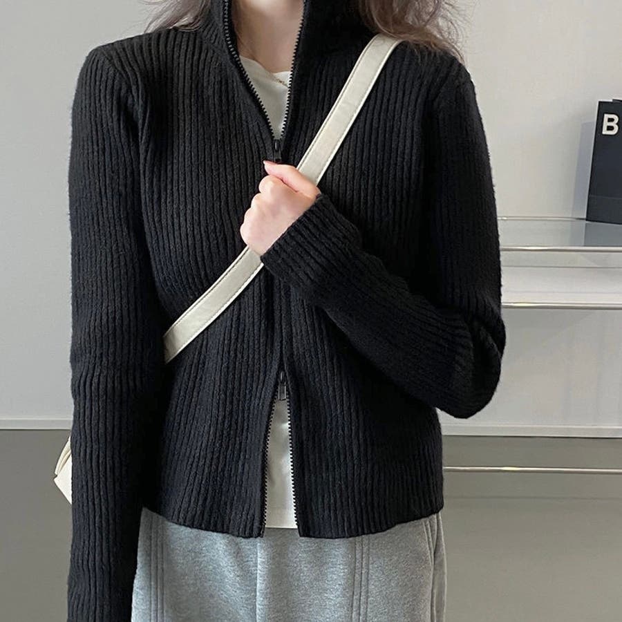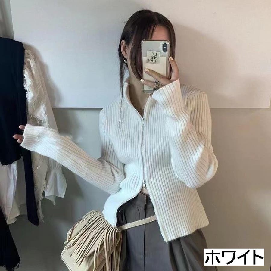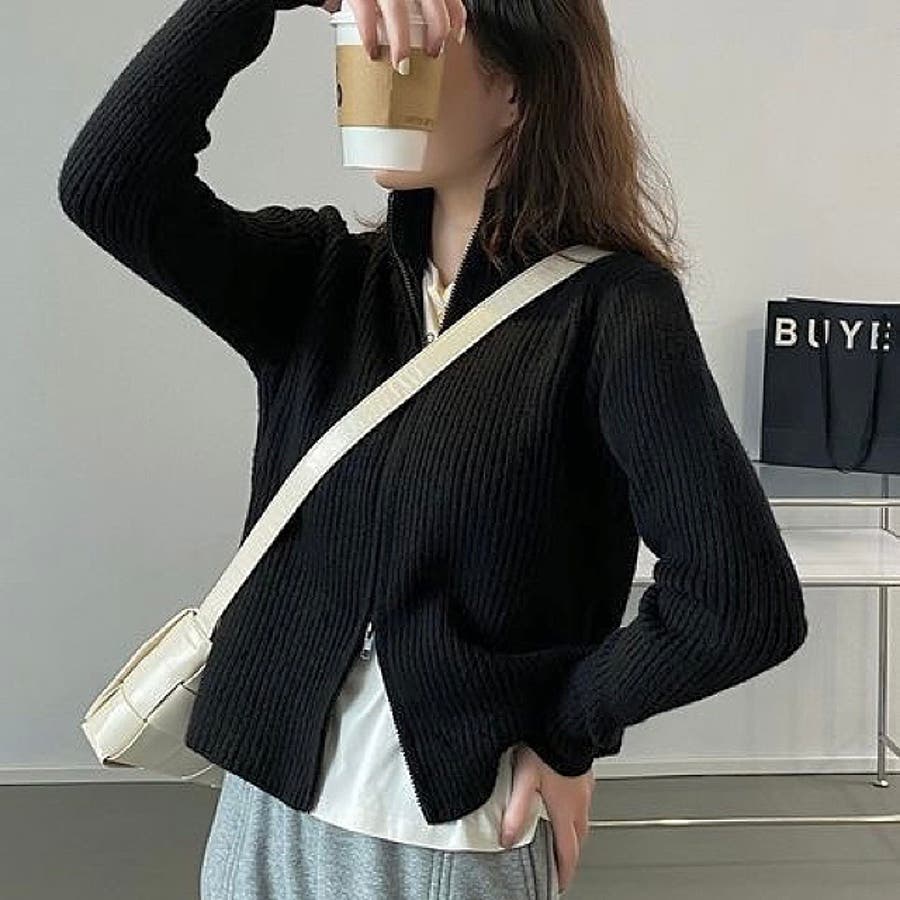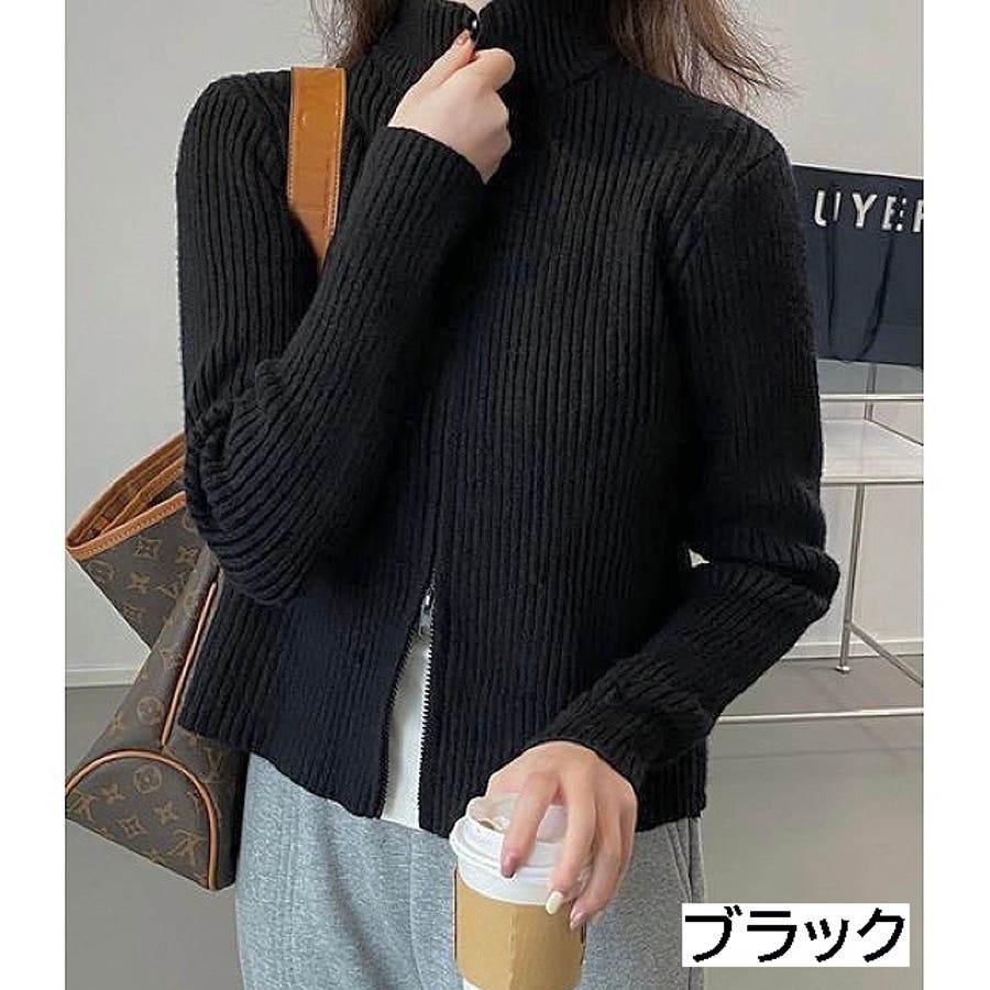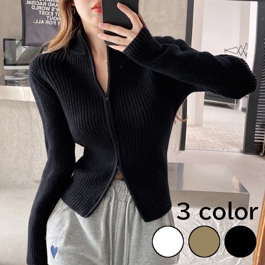 程よい厚みのニット素材でハイネックタイプのジップカーデなのでジップの開け方で雰囲気を変えられるのも◎