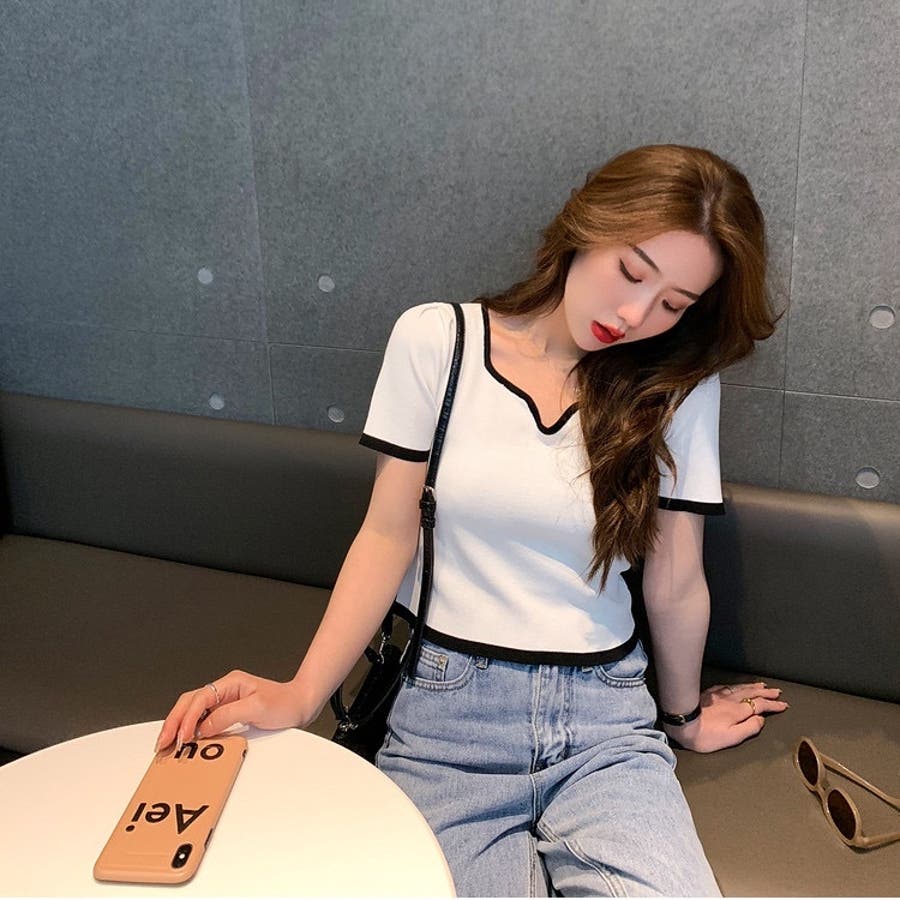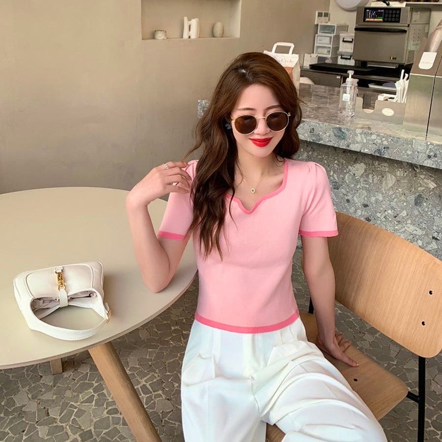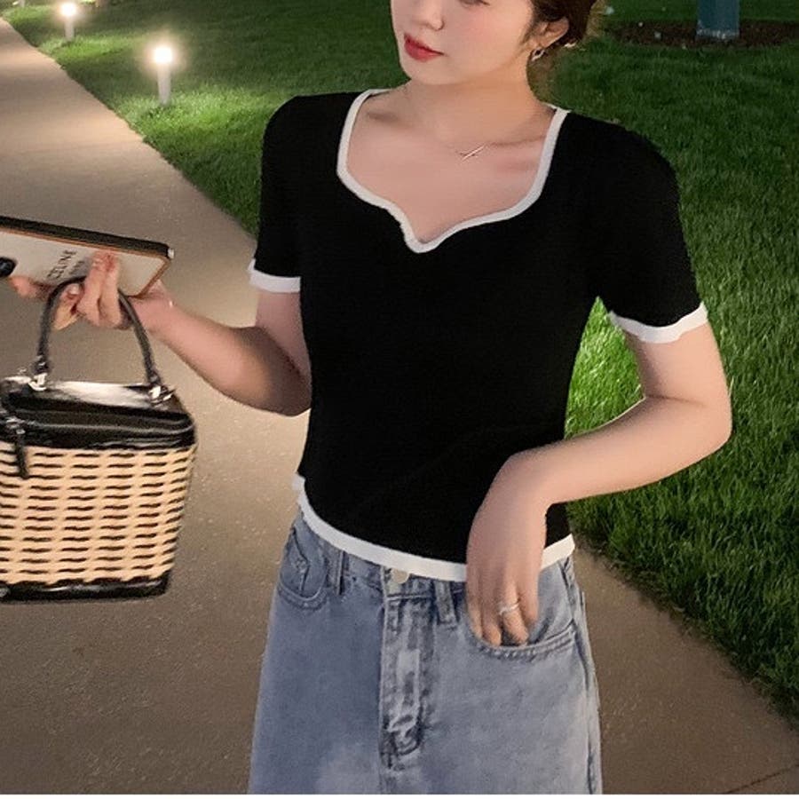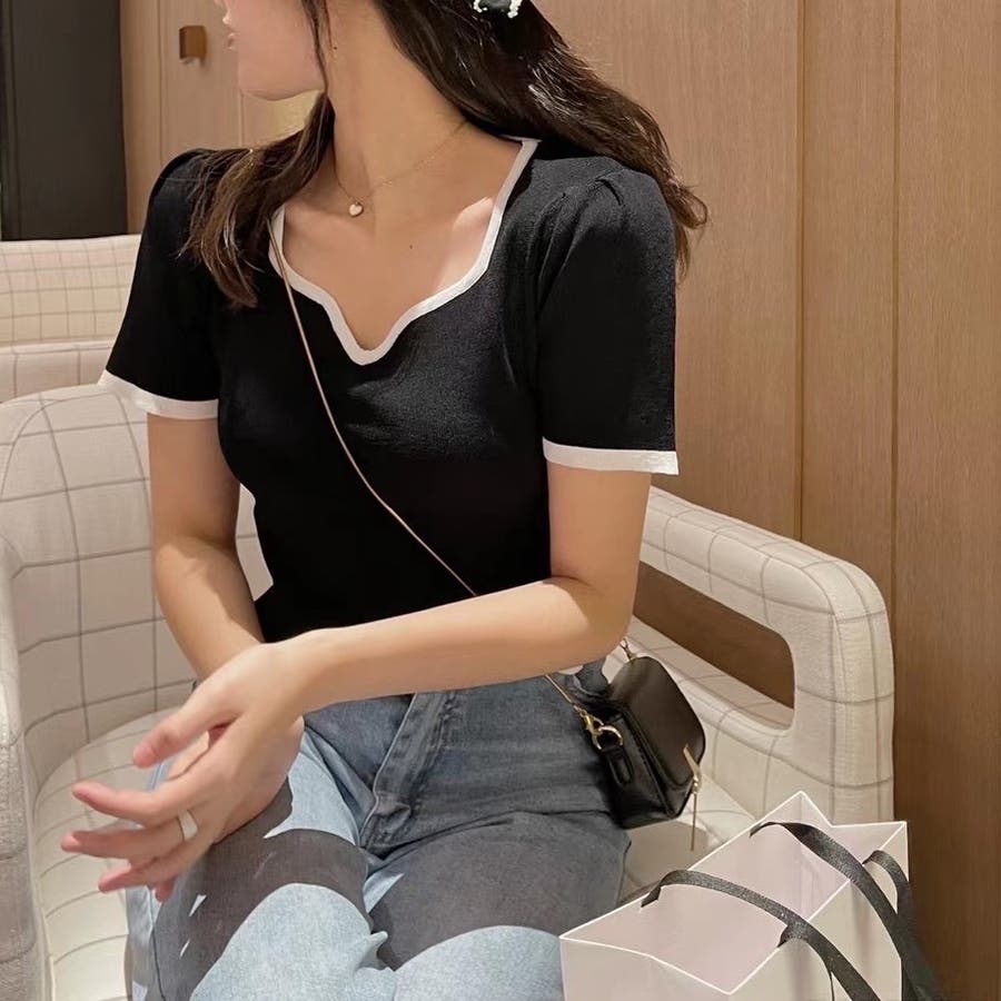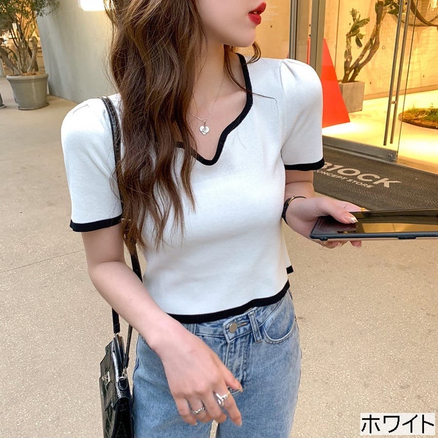 変形Vネック配色ニット V開き 半袖