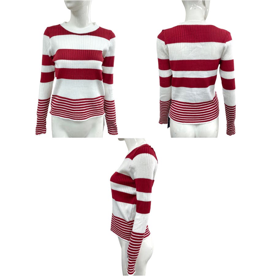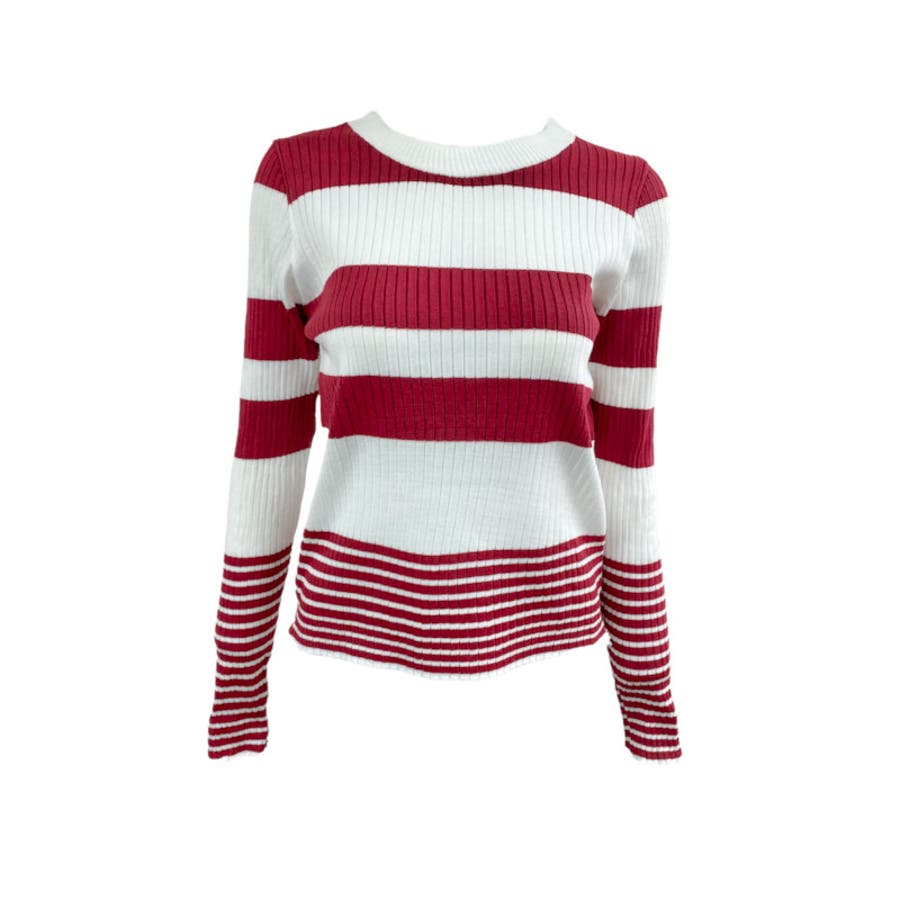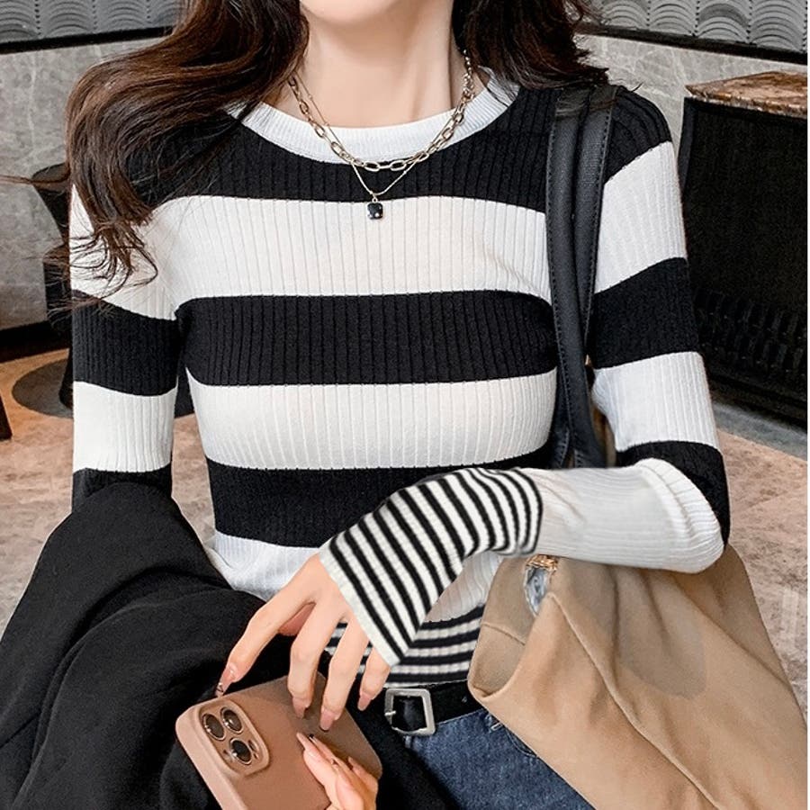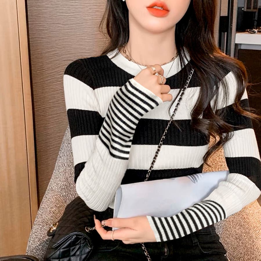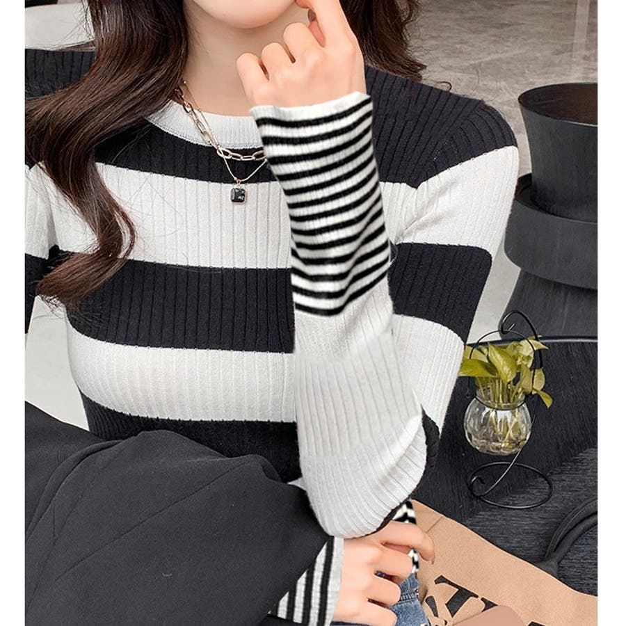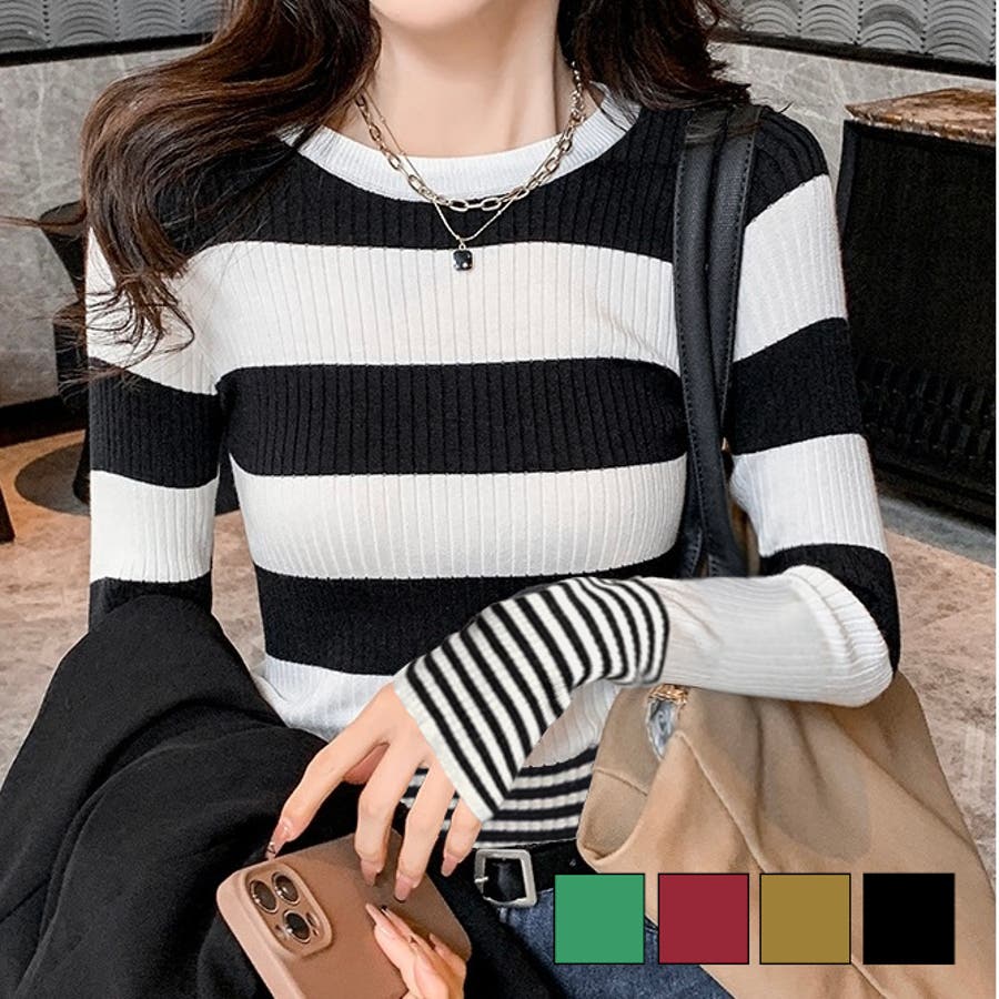 トップス ニット セーター 大人 カジュアル 韓国ファッション 長袖 マルチボーダー ランダムボーダー カラフル オフィスカジュアル 丸首 クルーネック 秋 冬 春
