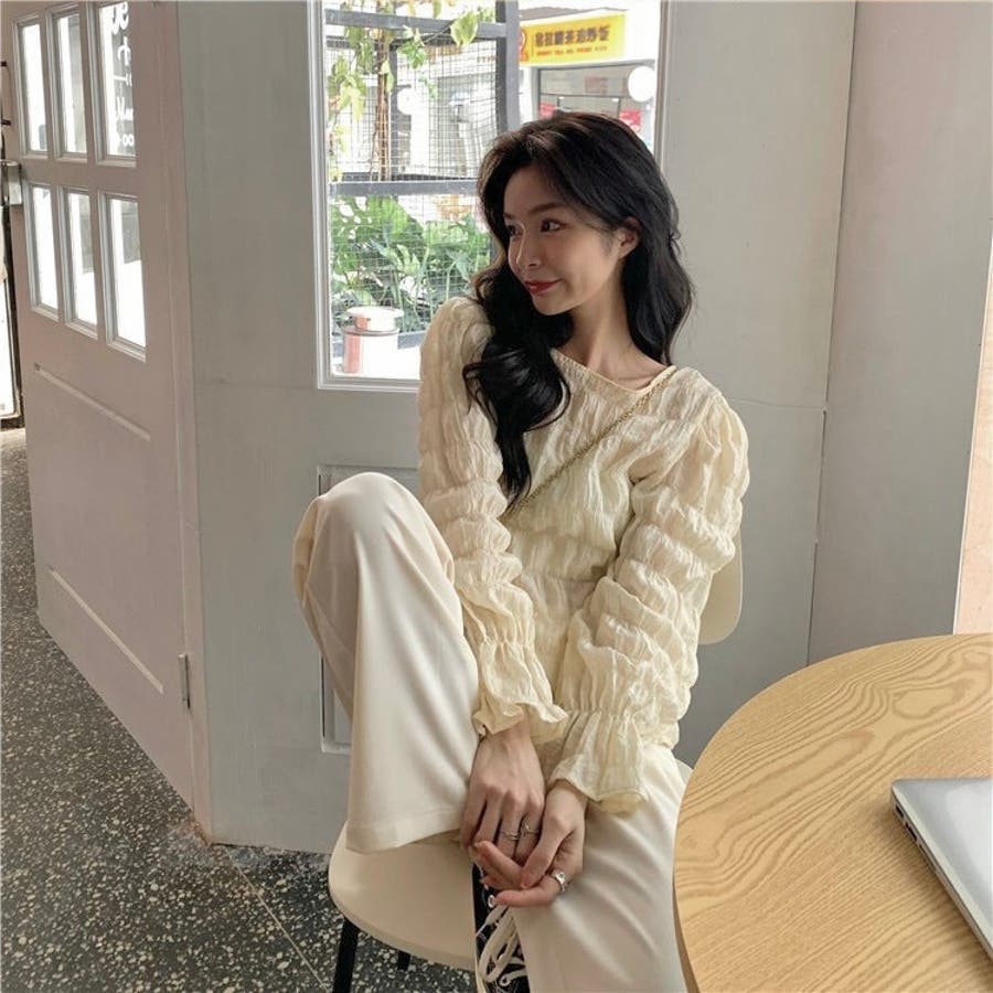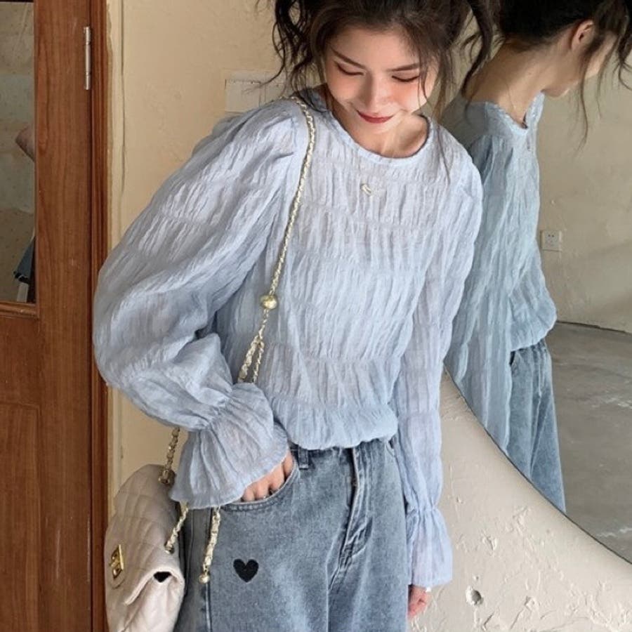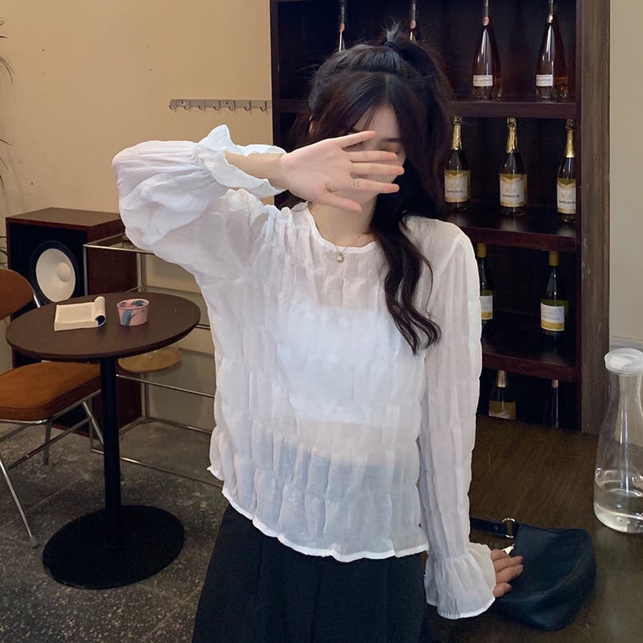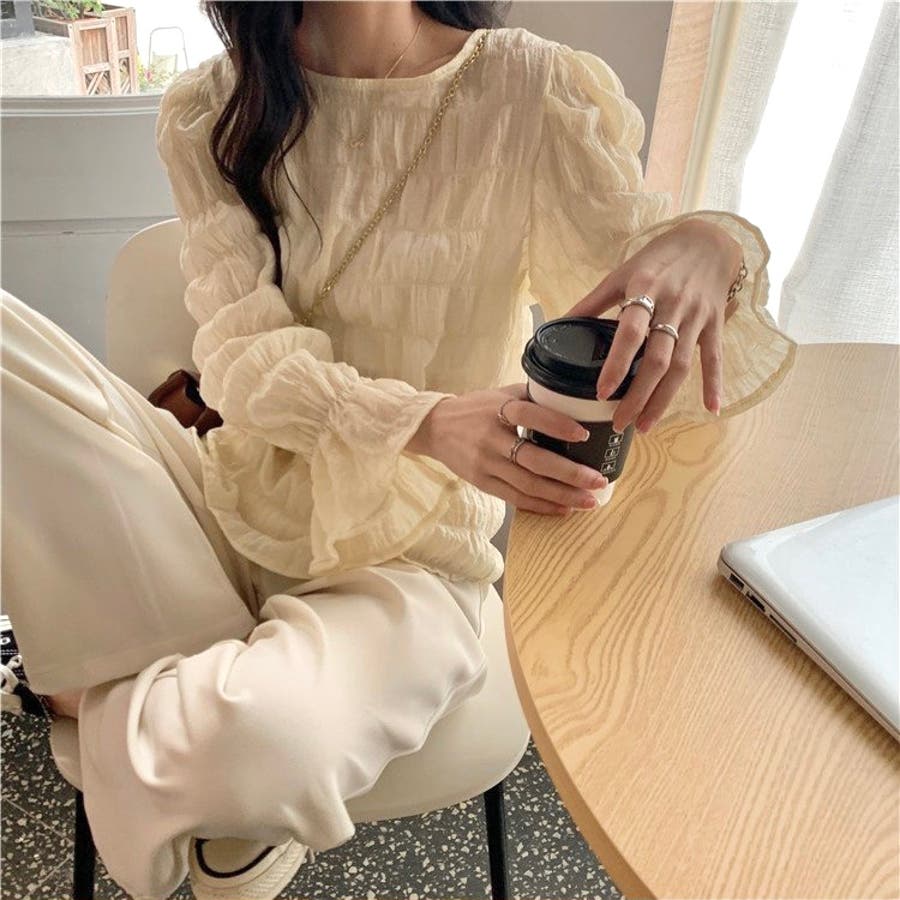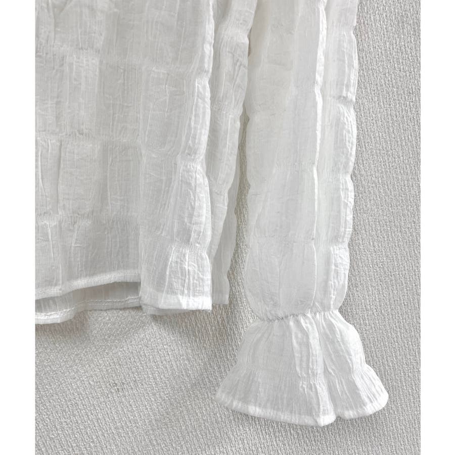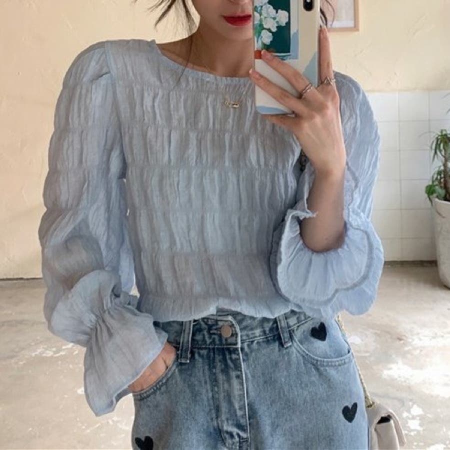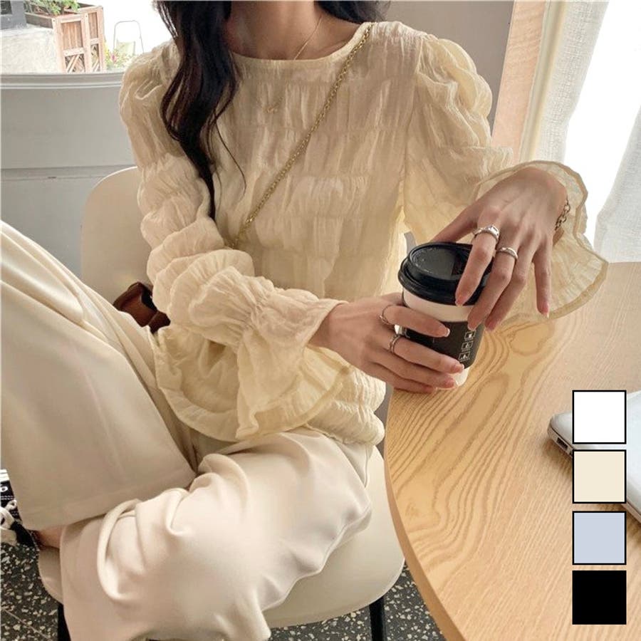 トップス ブラウス シャツ 透け感 シアー くしゅくしゅ 凹凸 表面感 ボリューム袖 フレアスリーブ 大人 カジュアル きれいめ 韓国ファッション オフィスカジュアル 長袖 無地 シースルー ガーリー 春 夏 秋