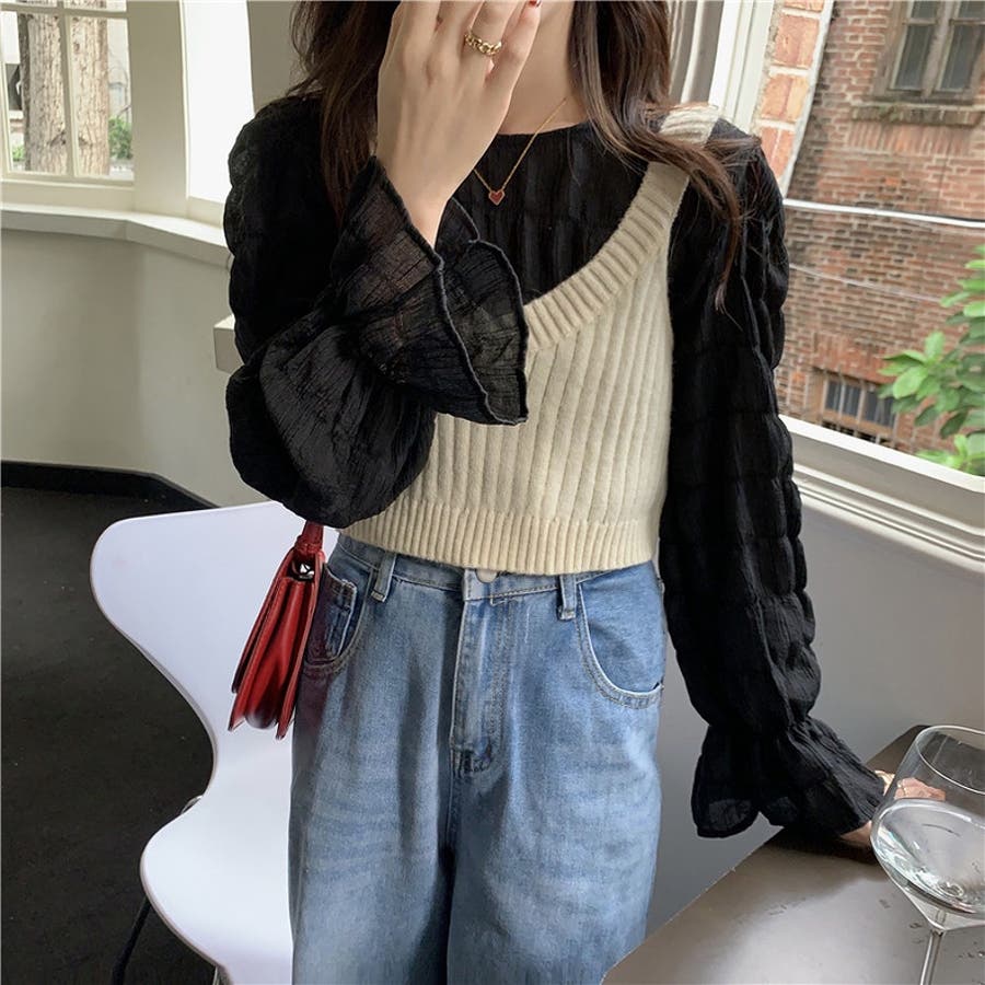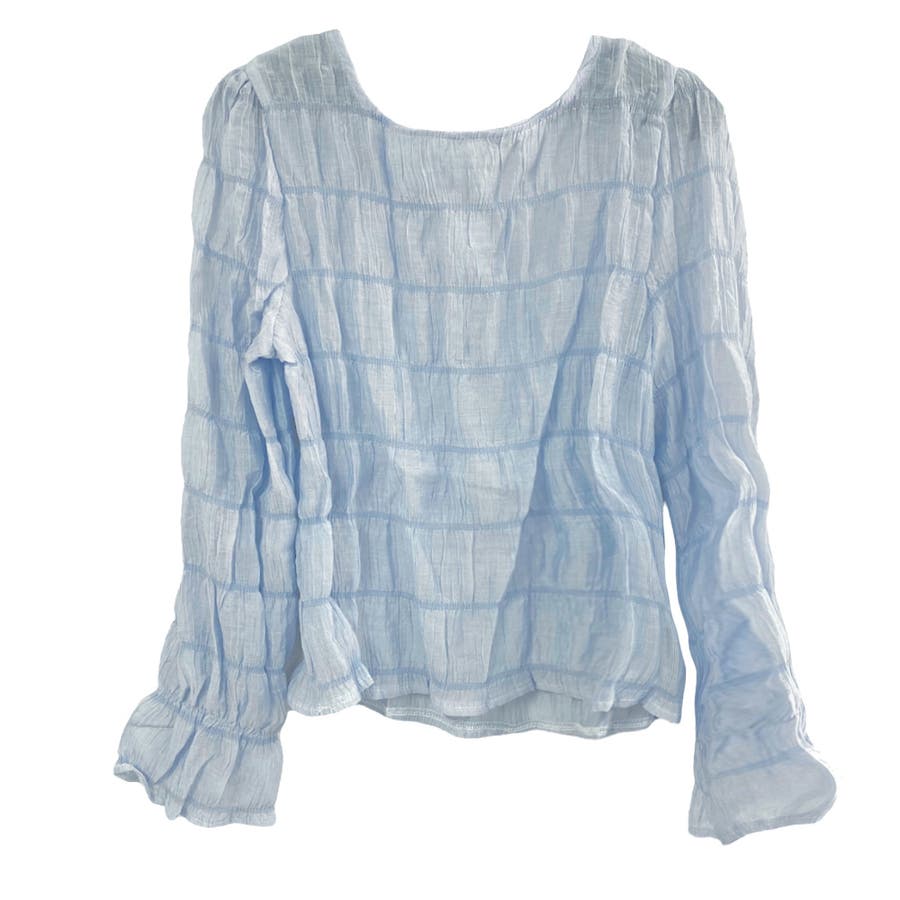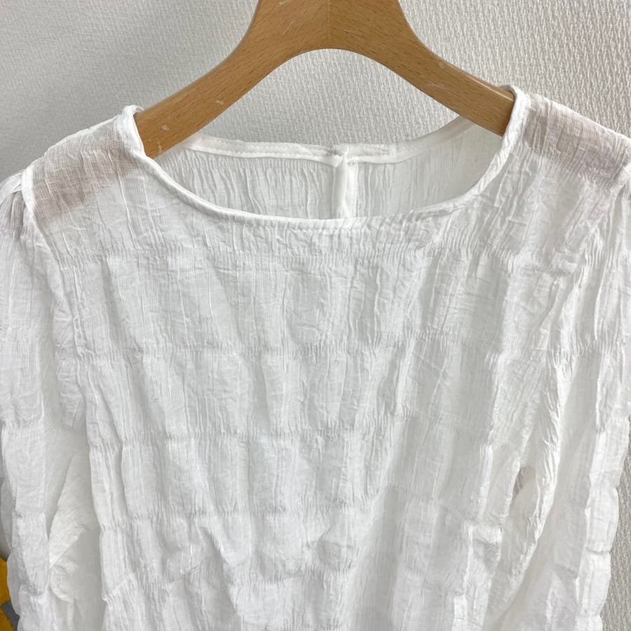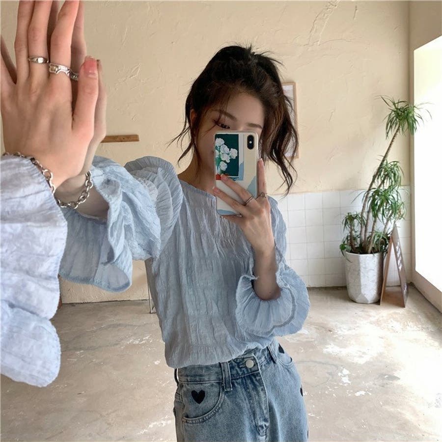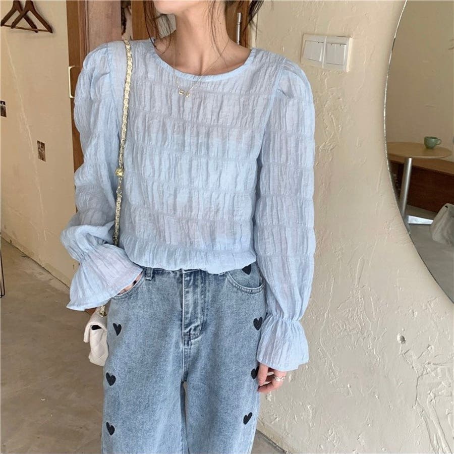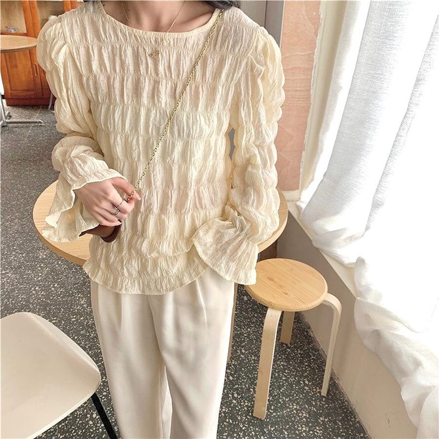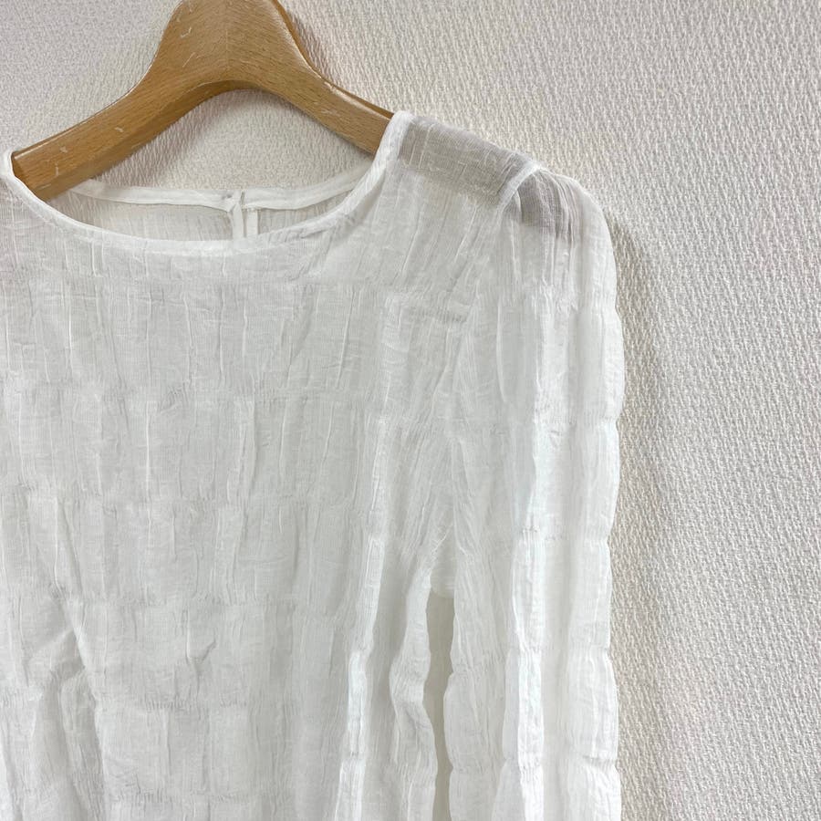 トップス ブラウス シャツ 透け感 シアー くしゅくしゅ 凹凸 表面感 ボリューム袖 フレアスリーブ 大人 カジュアル きれいめ 韓国ファッション オフィスカジュアル 長袖 無地 シースルー ガーリー 春 夏 秋