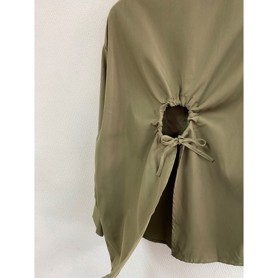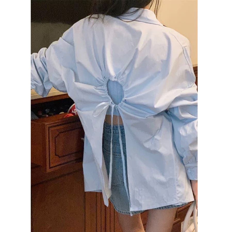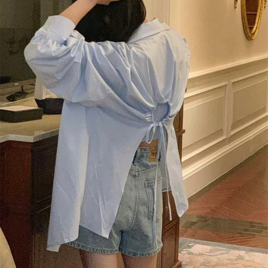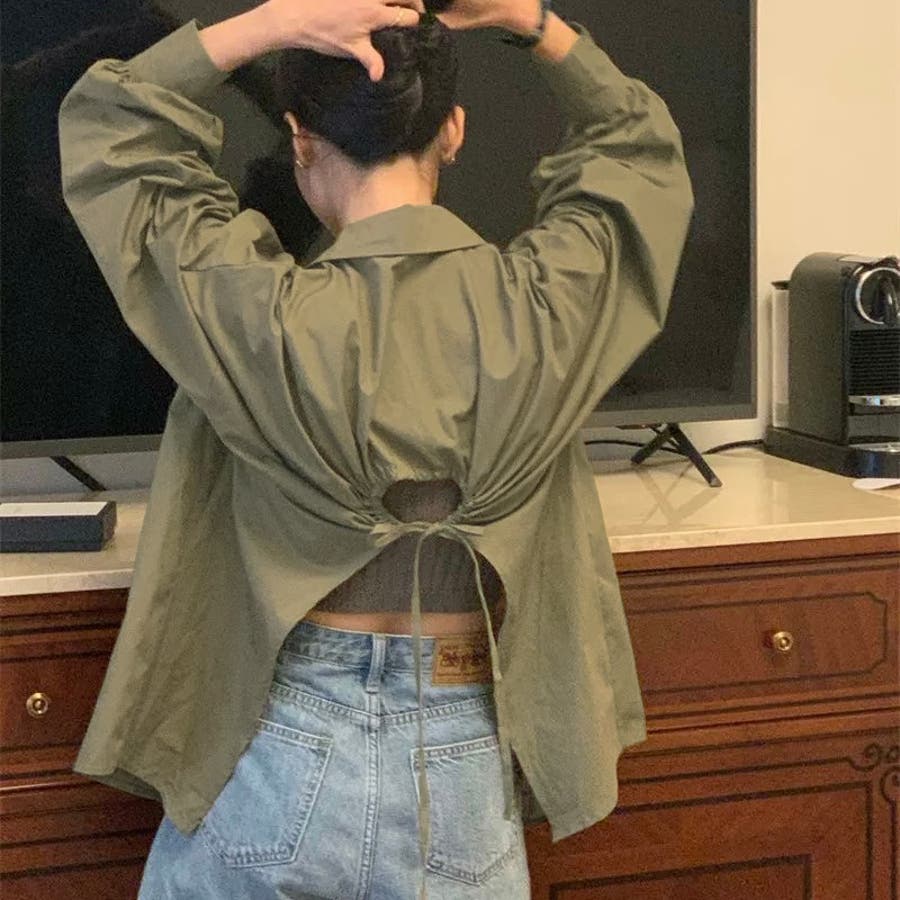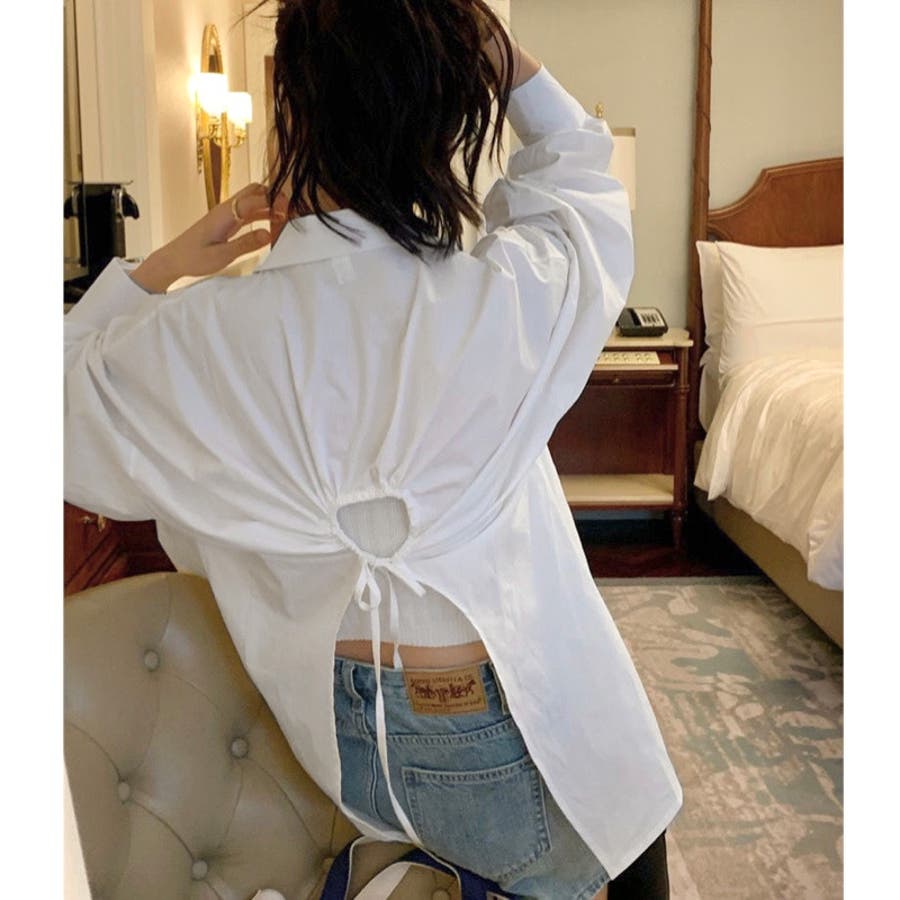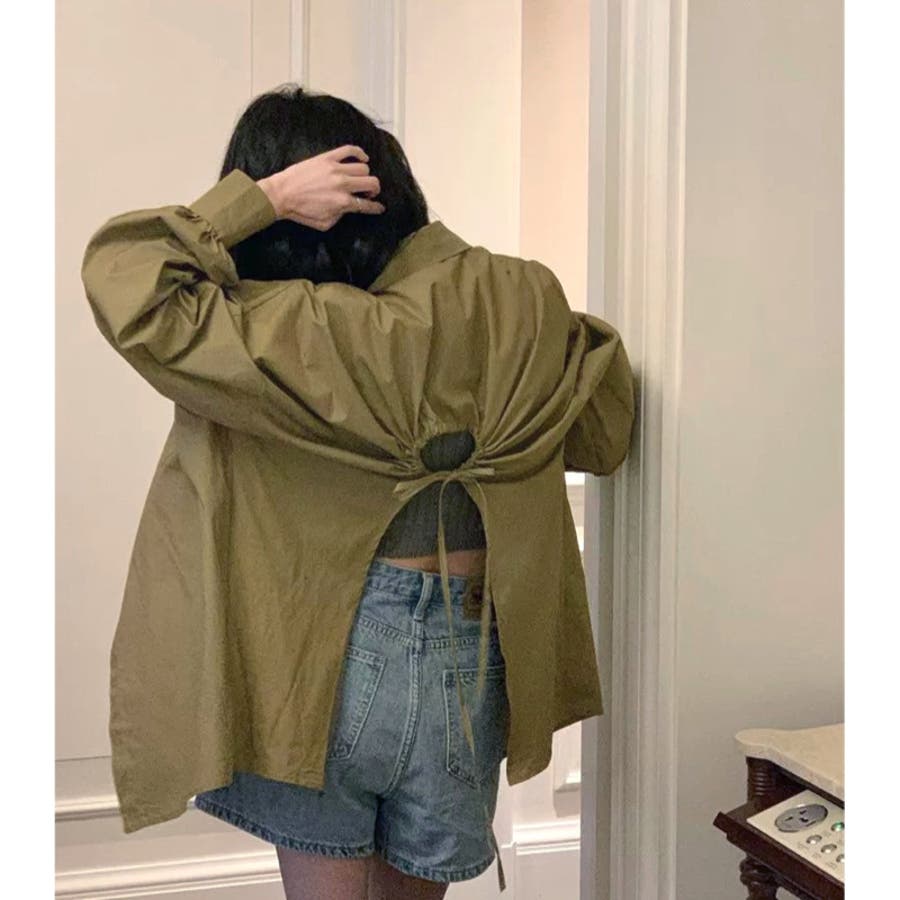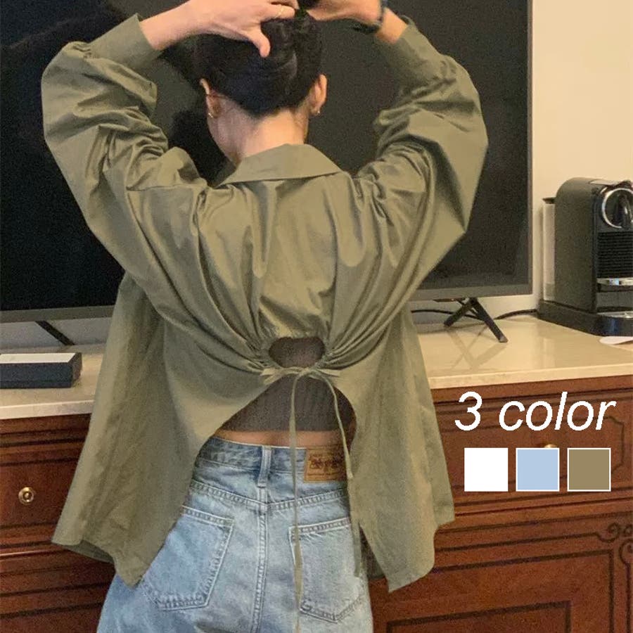 大人 カジュアル きれいめ 韓国ファッション 韓国コーデ オフィスカジュアル 開き見せ 肌見せ ヘルシー バックデザイン ゆったり オーバーサイズ 長袖 無地 ブラウス シャーリング ドローストリング 絞り 20代 30代 40代 春 夏 秋