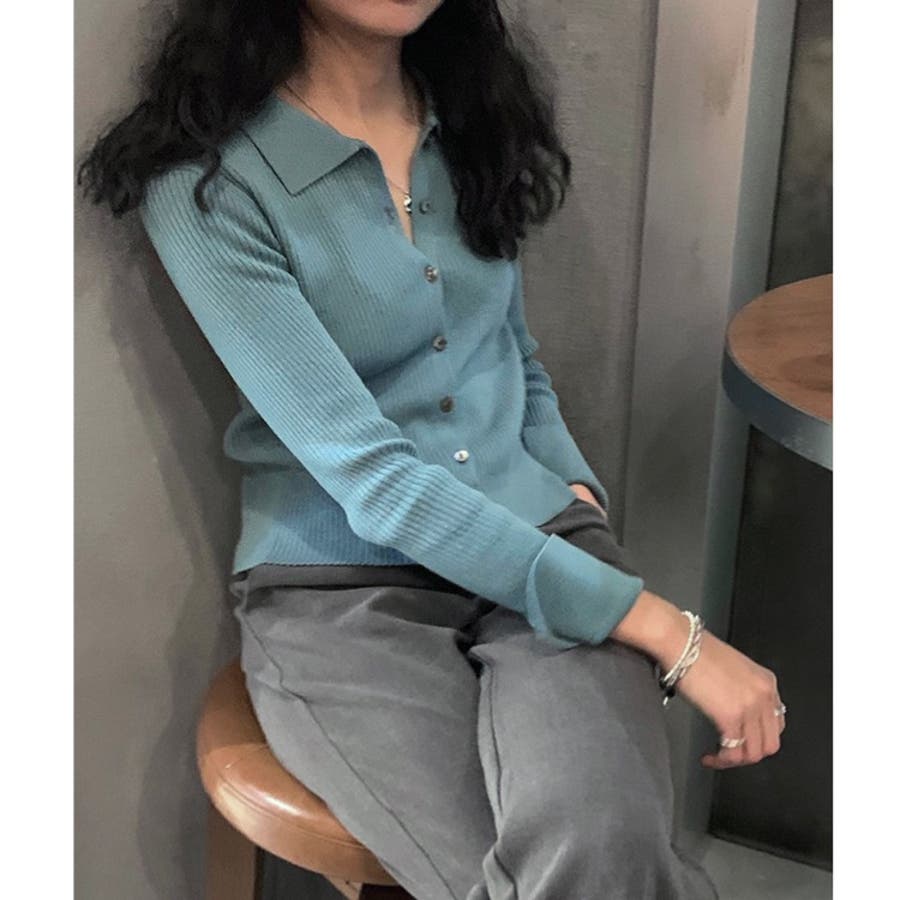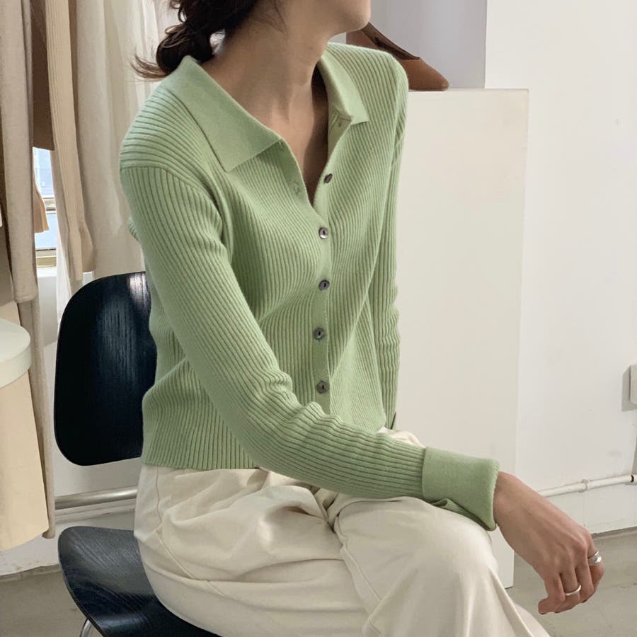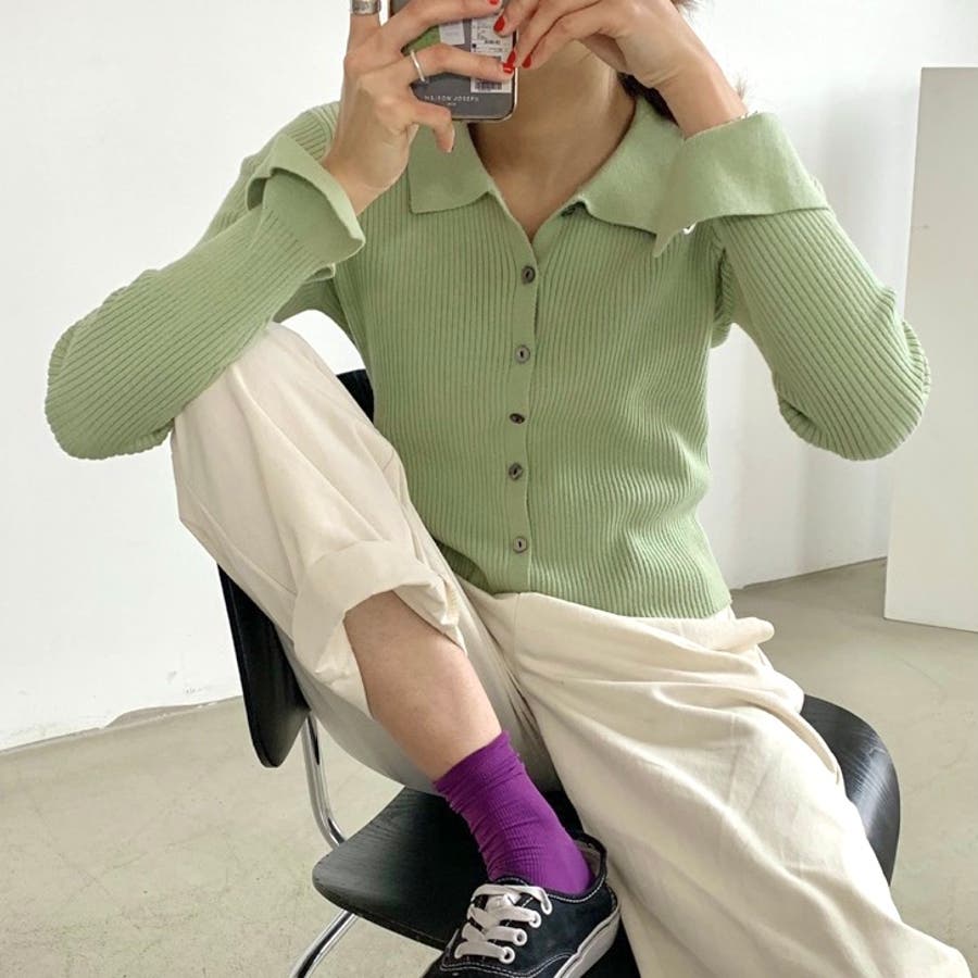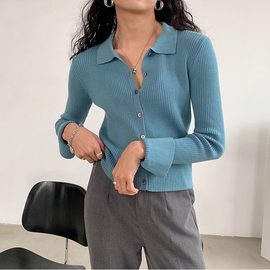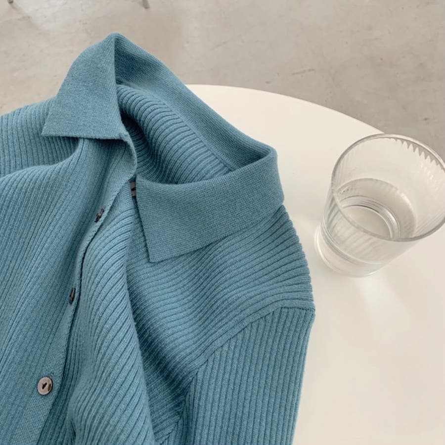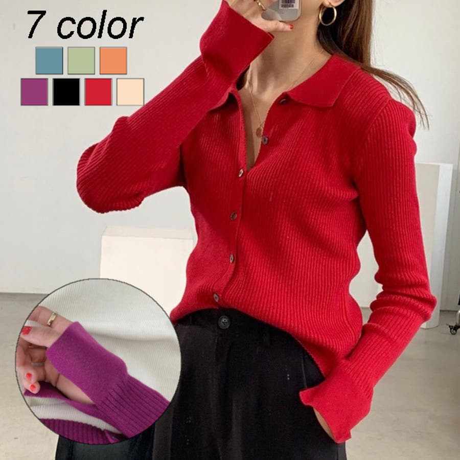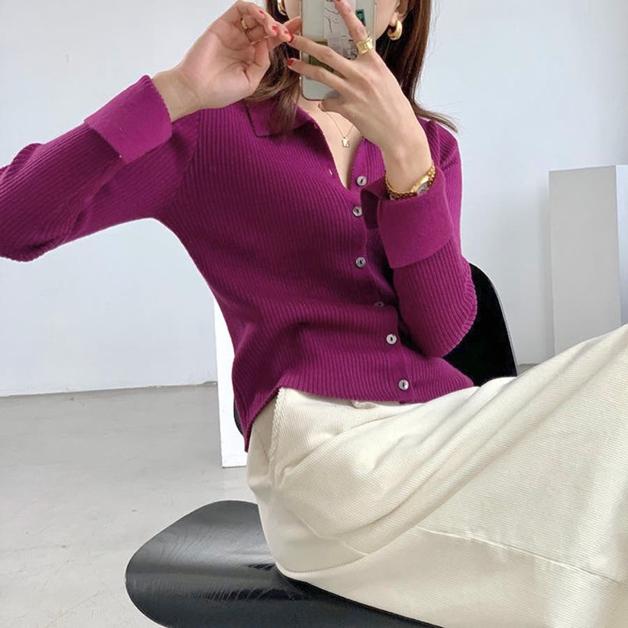 大人 カジュアル きれいめ 韓国ファッション 韓国コーデ オフィスカジュアル ポロシャツ トップス 無地 前開き 長袖 シンプル ベーシック ハイゲージ もちもち 20代 30代 40代 春 秋 冬 カーデ カーディガン