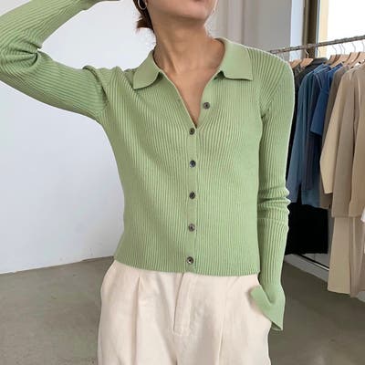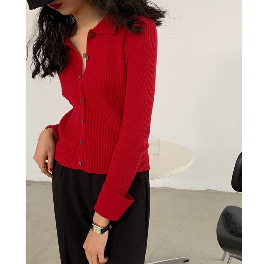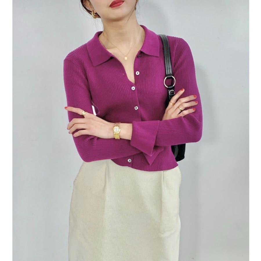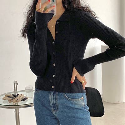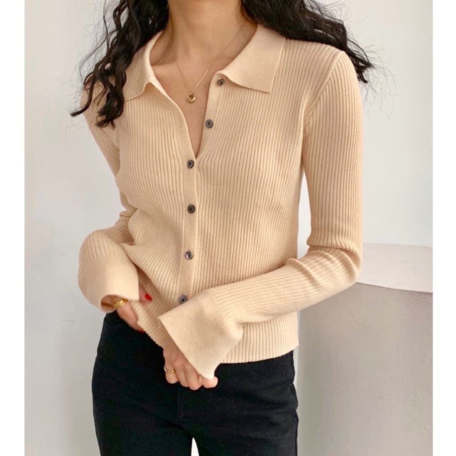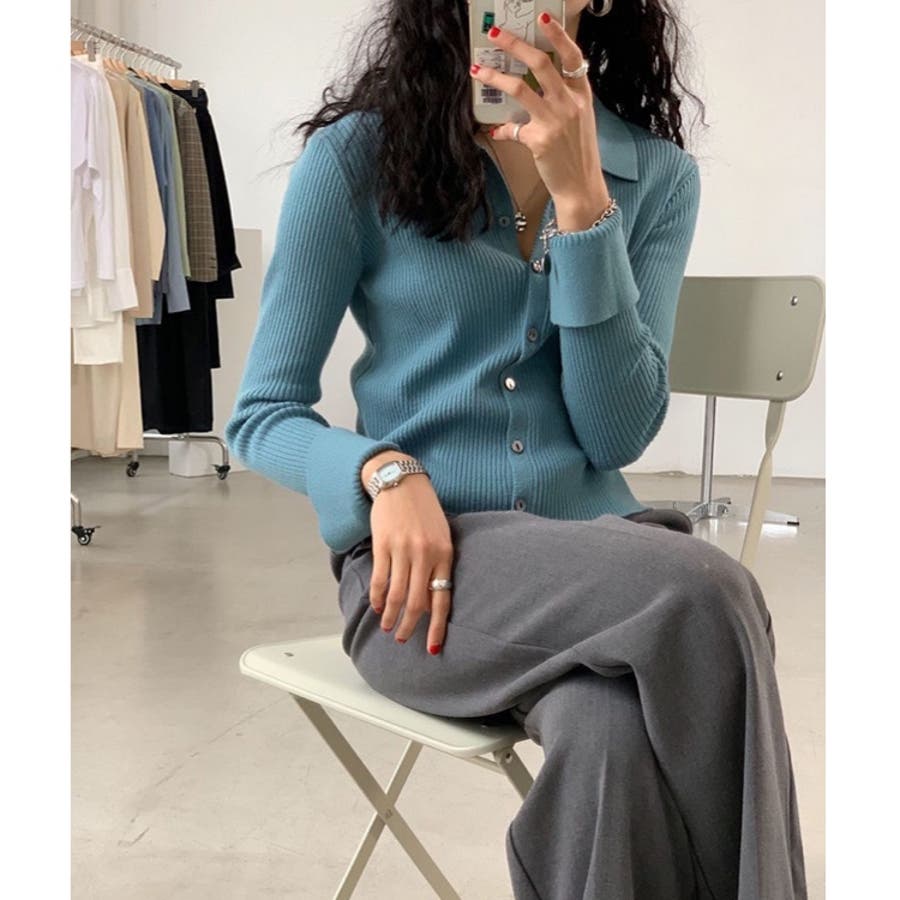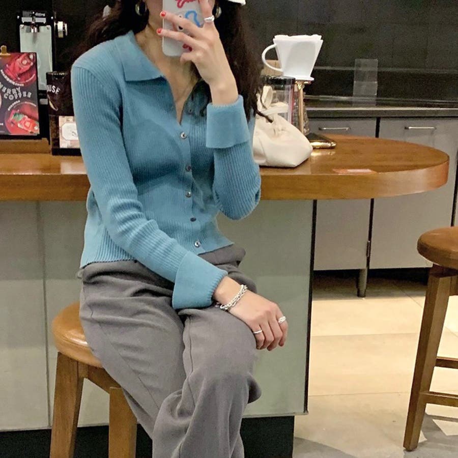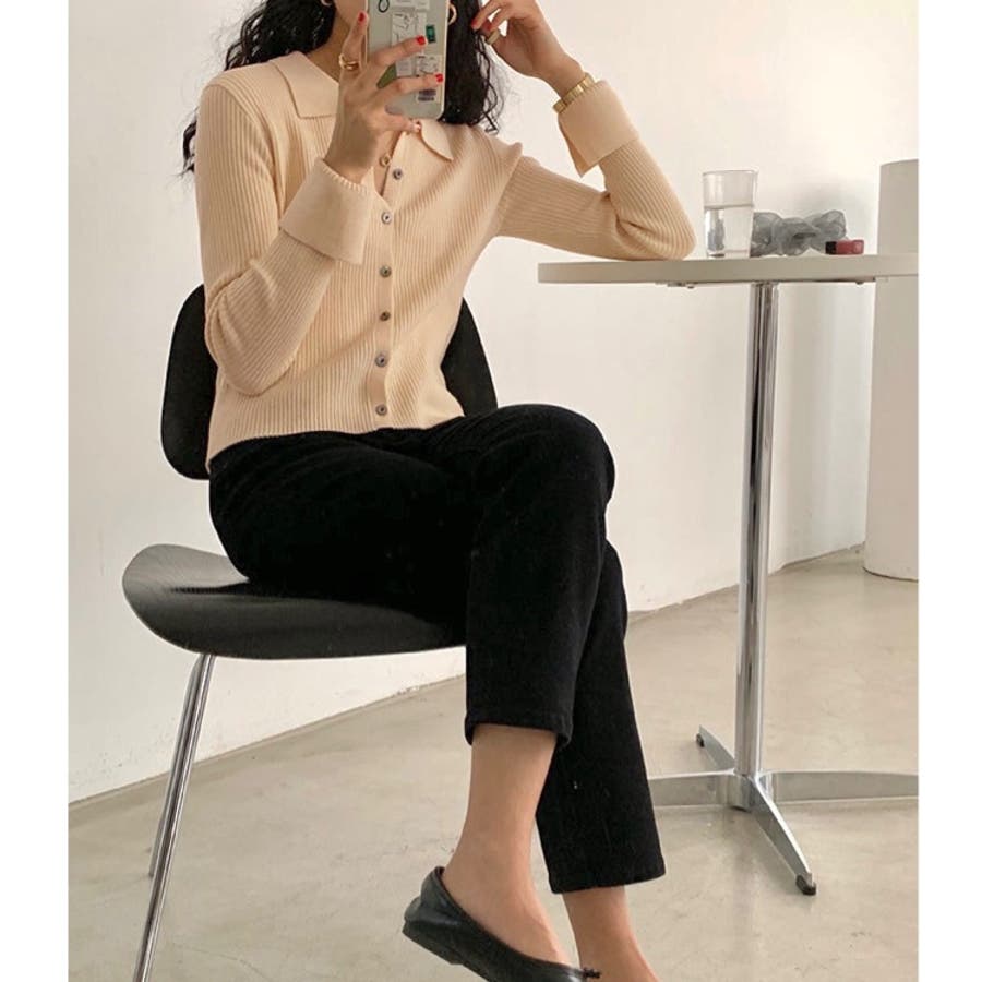 大人 カジュアル きれいめ 韓国ファッション 韓国コーデ オフィスカジュアル ポロシャツ トップス 無地 前開き 長袖 シンプル ベーシック ハイゲージ もちもち 20代 30代 40代 春 秋 冬 カーデ カーディガン