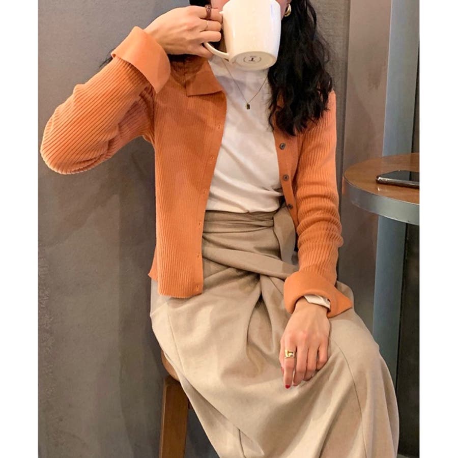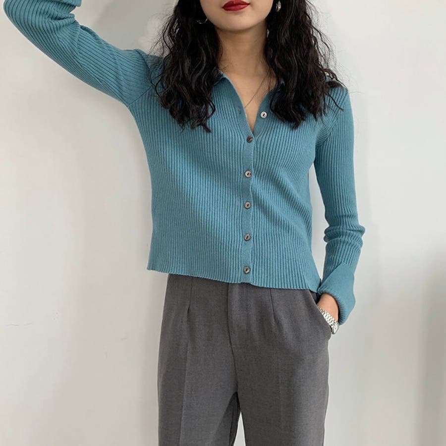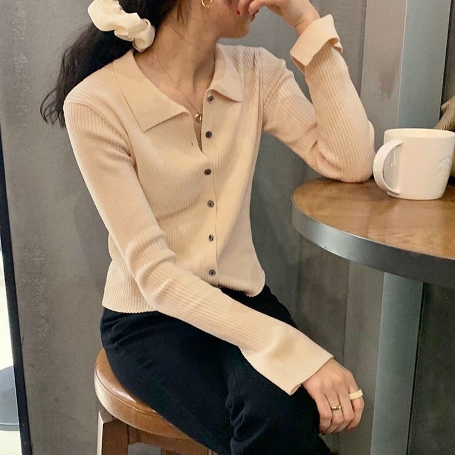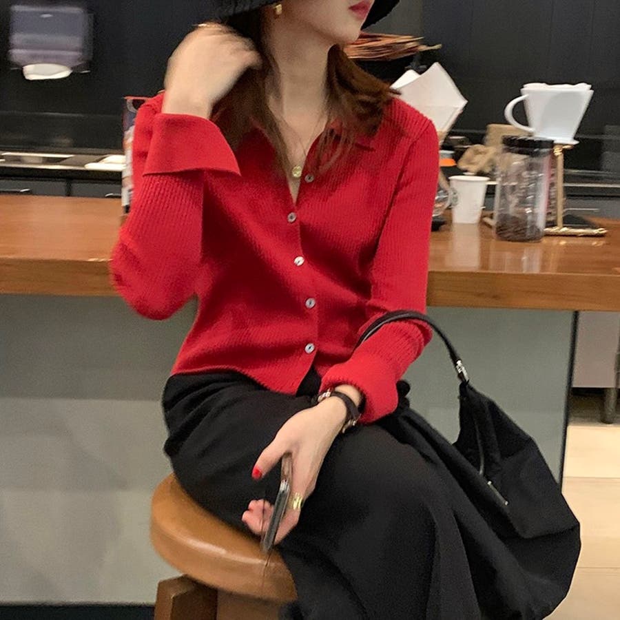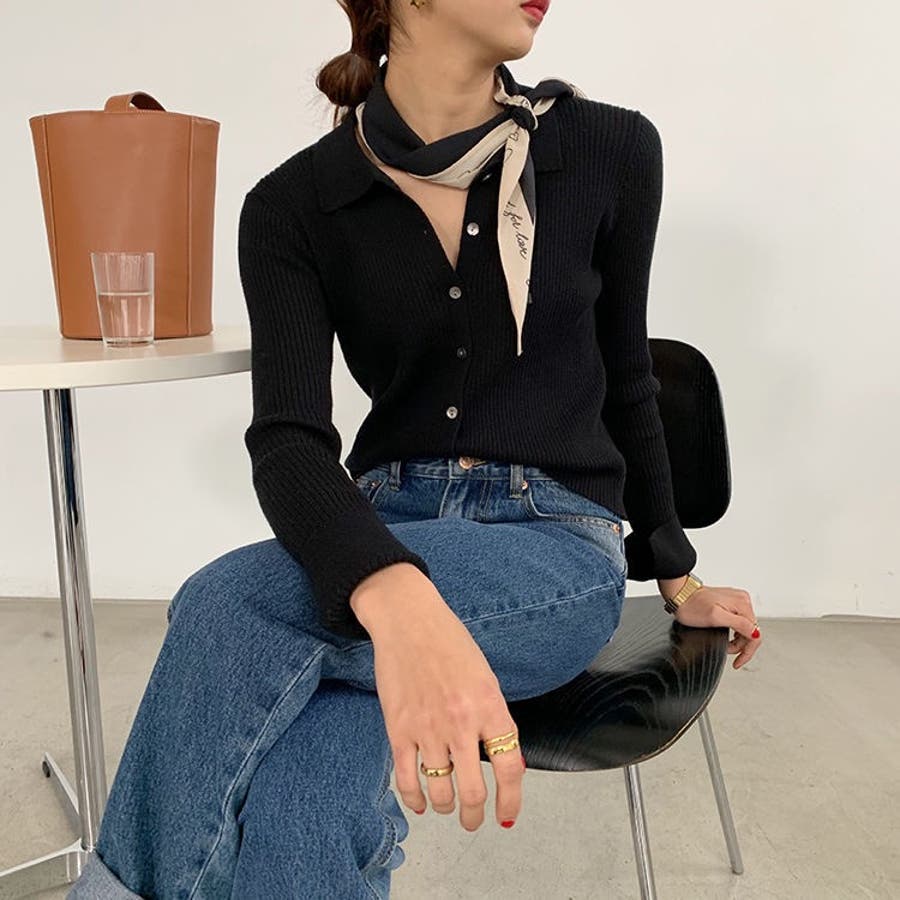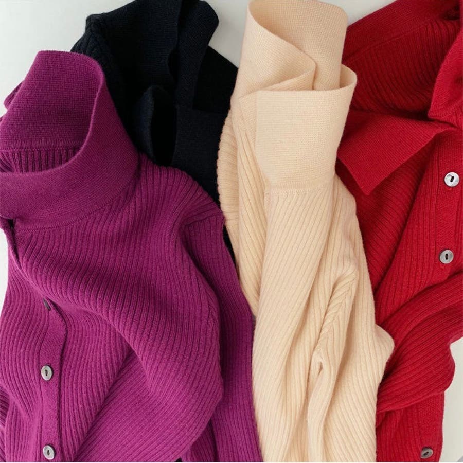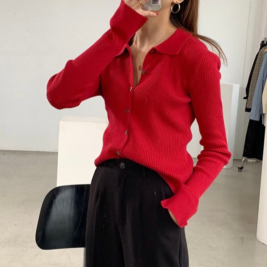 大人 カジュアル きれいめ 韓国ファッション 韓国コーデ オフィスカジュアル ポロシャツ トップス 無地 前開き 長袖 シンプル ベーシック ハイゲージ もちもち 20代 30代 40代 春 秋 冬 カーデ カーディガン