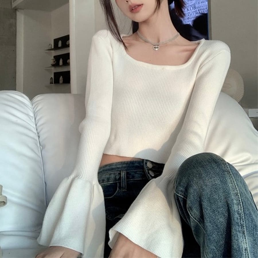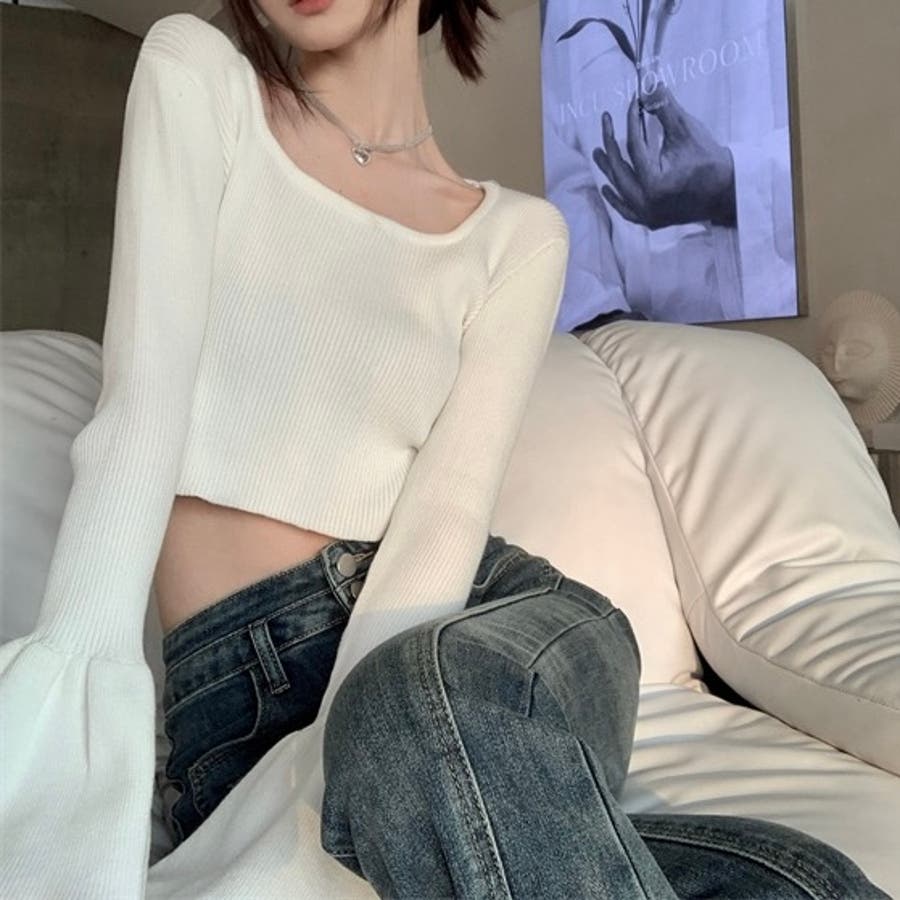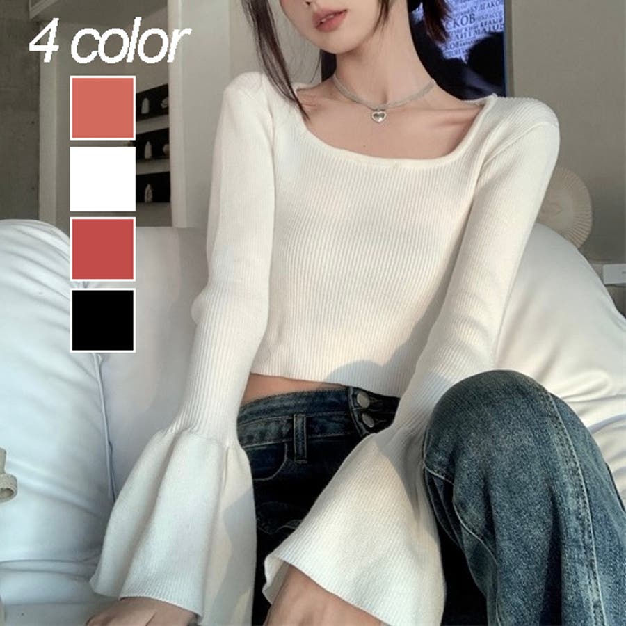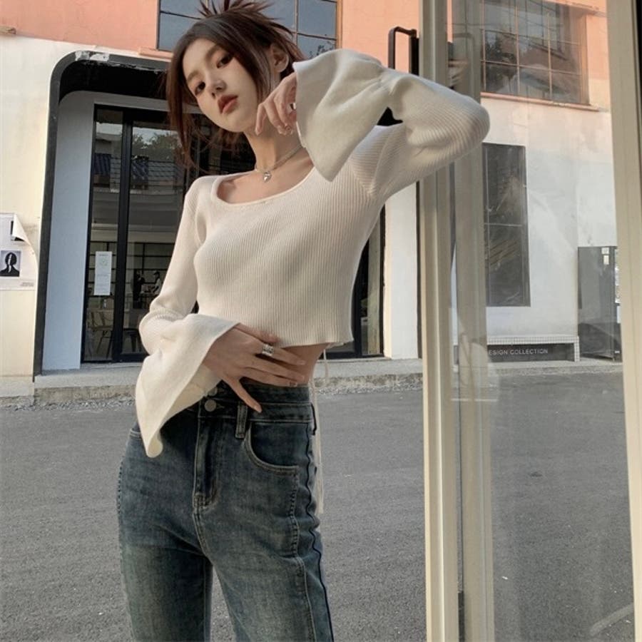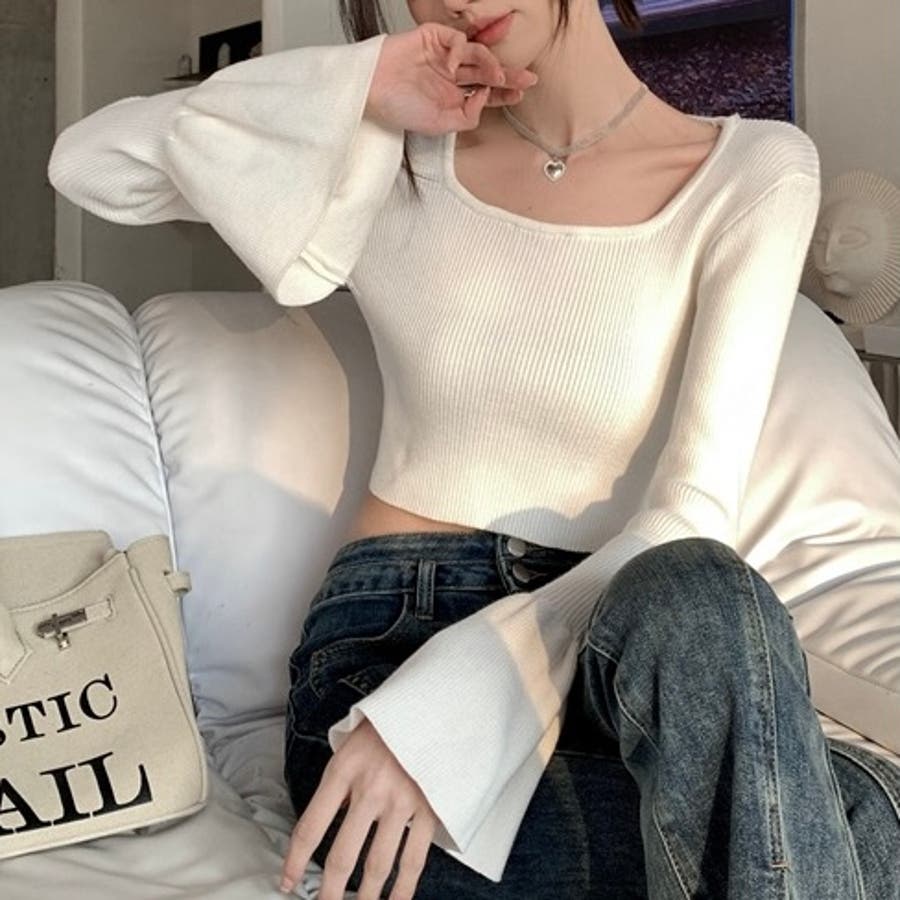 大人 カジュアル きれいめ 韓国ファッション 韓国コーデ オフィスカジュアル 肌見せ へそ出し ショート丈 フレア袖 ベルスリーブ 無地 長袖 ラウンドネック 春服 夏服 秋服 10代 20代 30代 40代 春 夏 秋