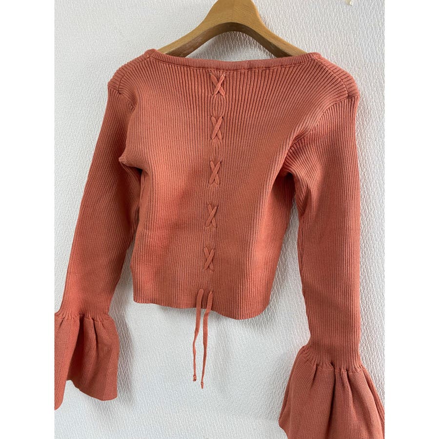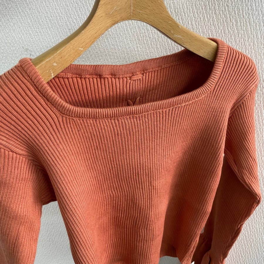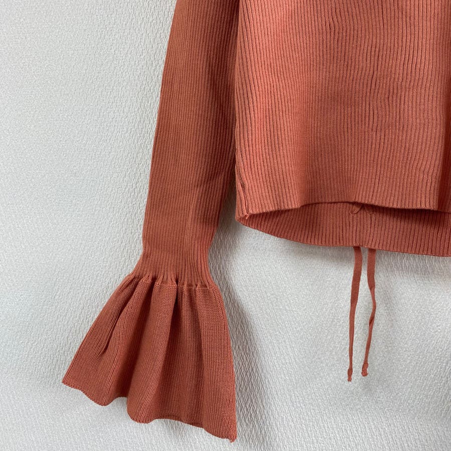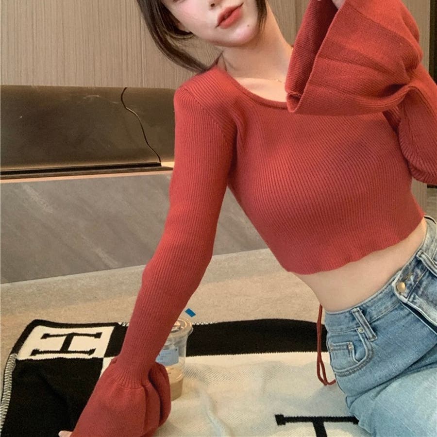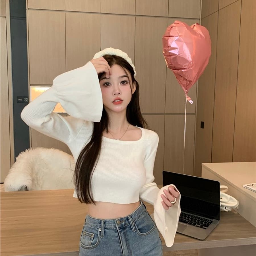 大人 カジュアル きれいめ 韓国ファッション 韓国コーデ オフィスカジュアル 肌見せ へそ出し ショート丈 フレア袖 ベルスリーブ 無地 長袖 ラウンドネック 春服 夏服 秋服 10代 20代 30代 40代 春 夏 秋