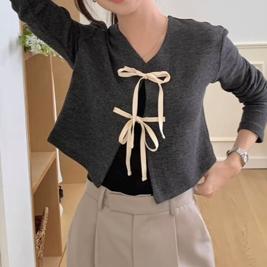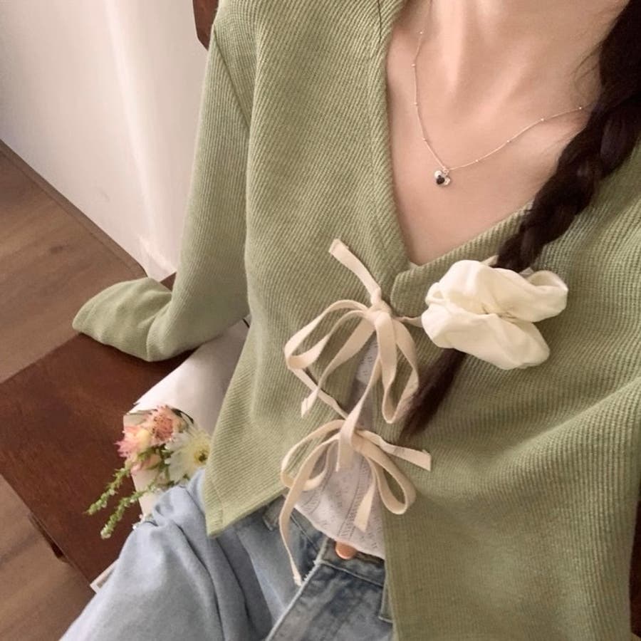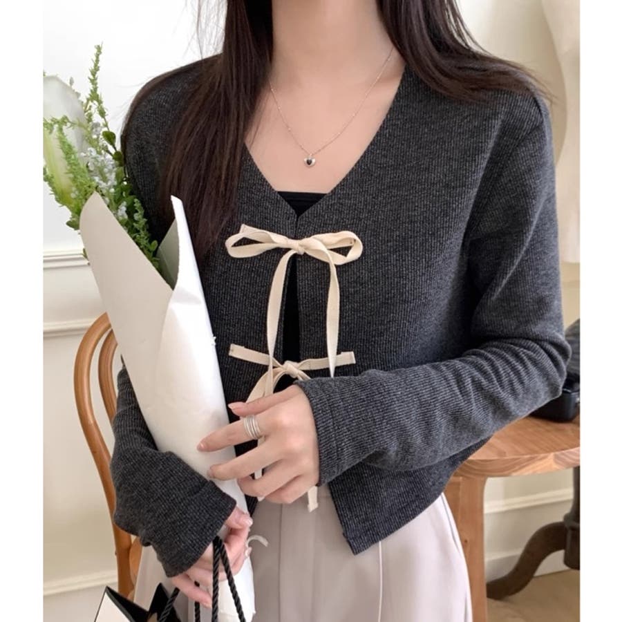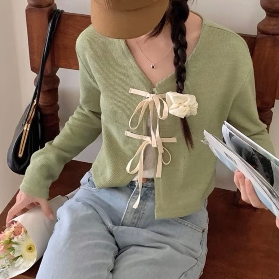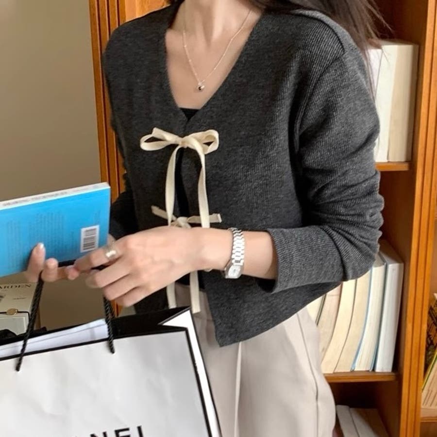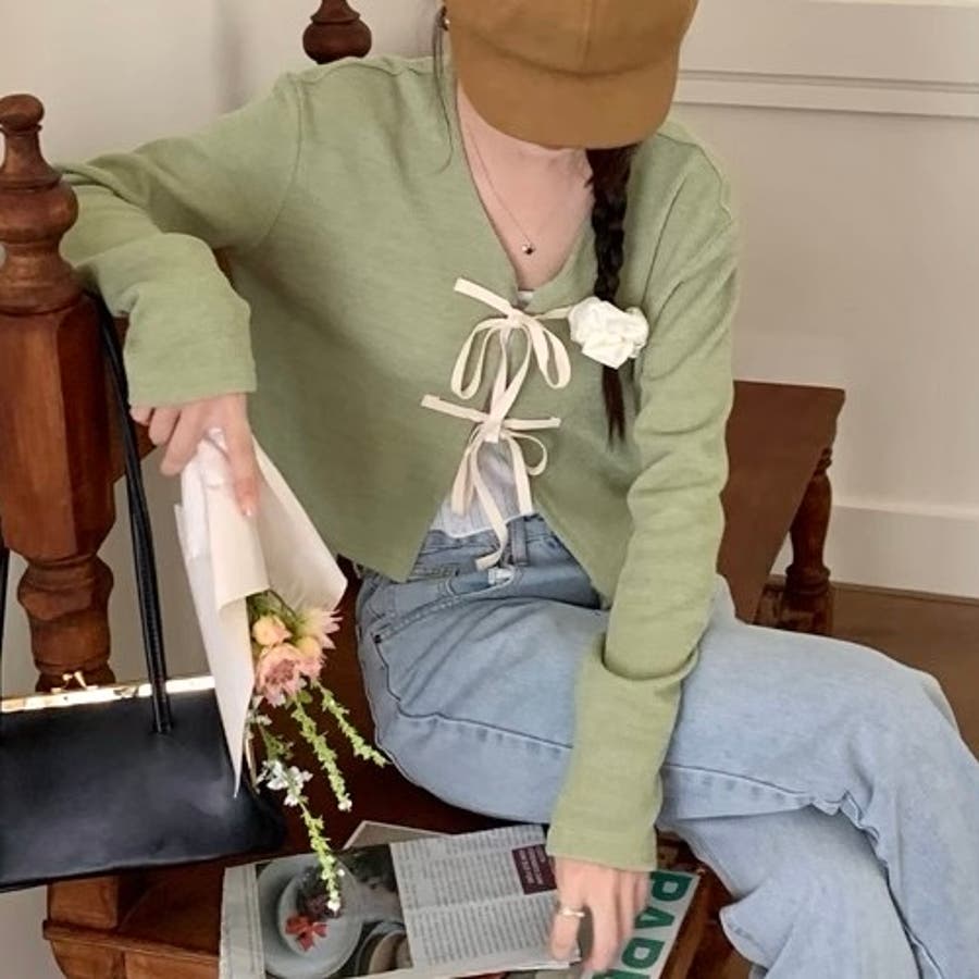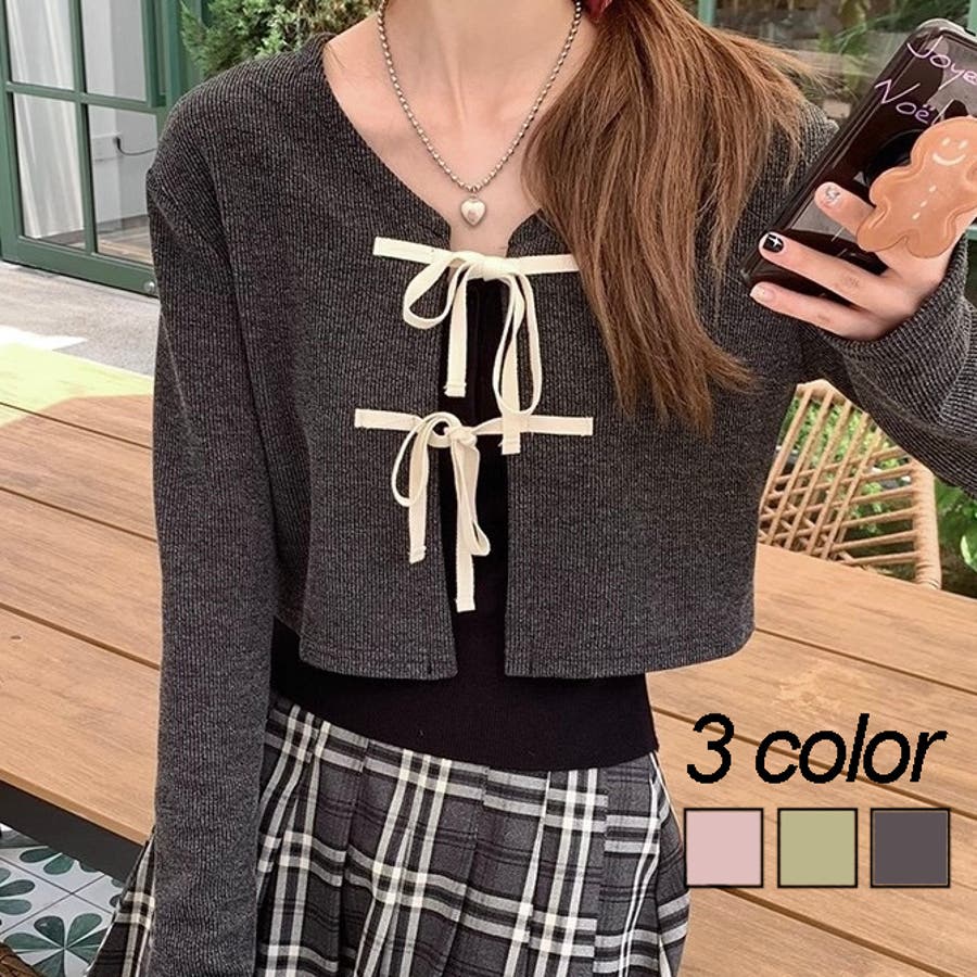 配色フロントリボンカーディガン