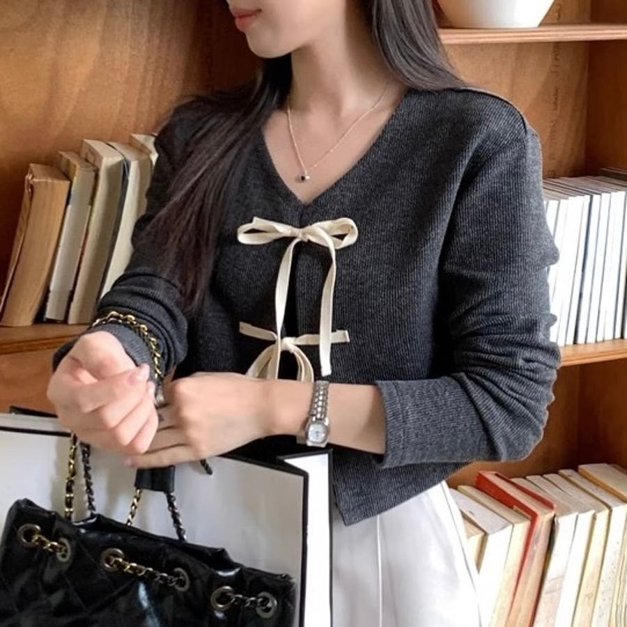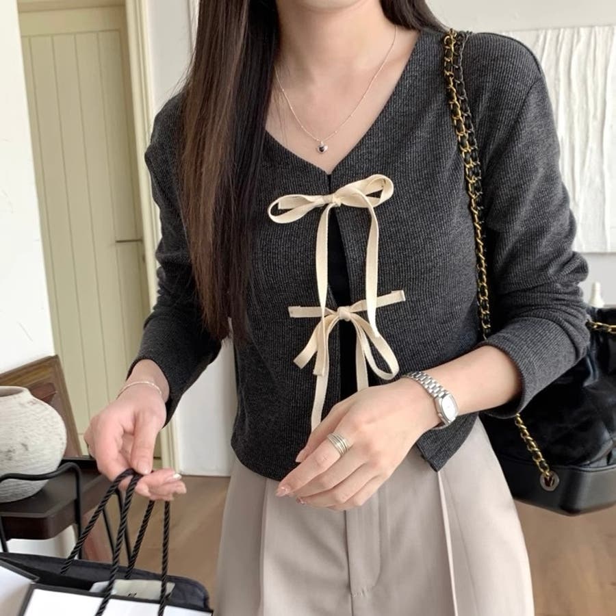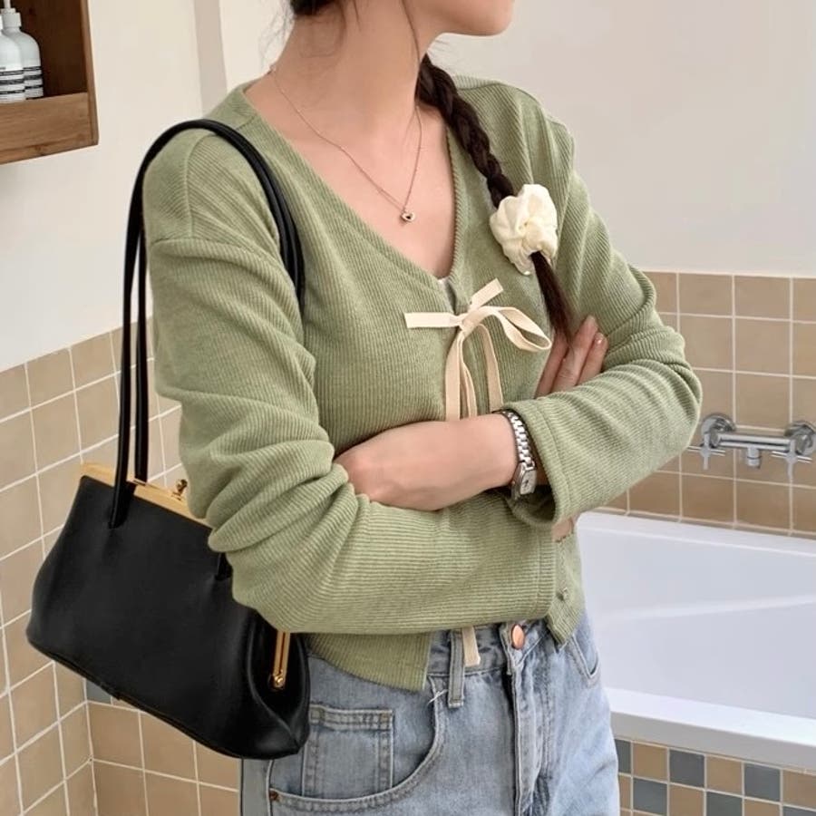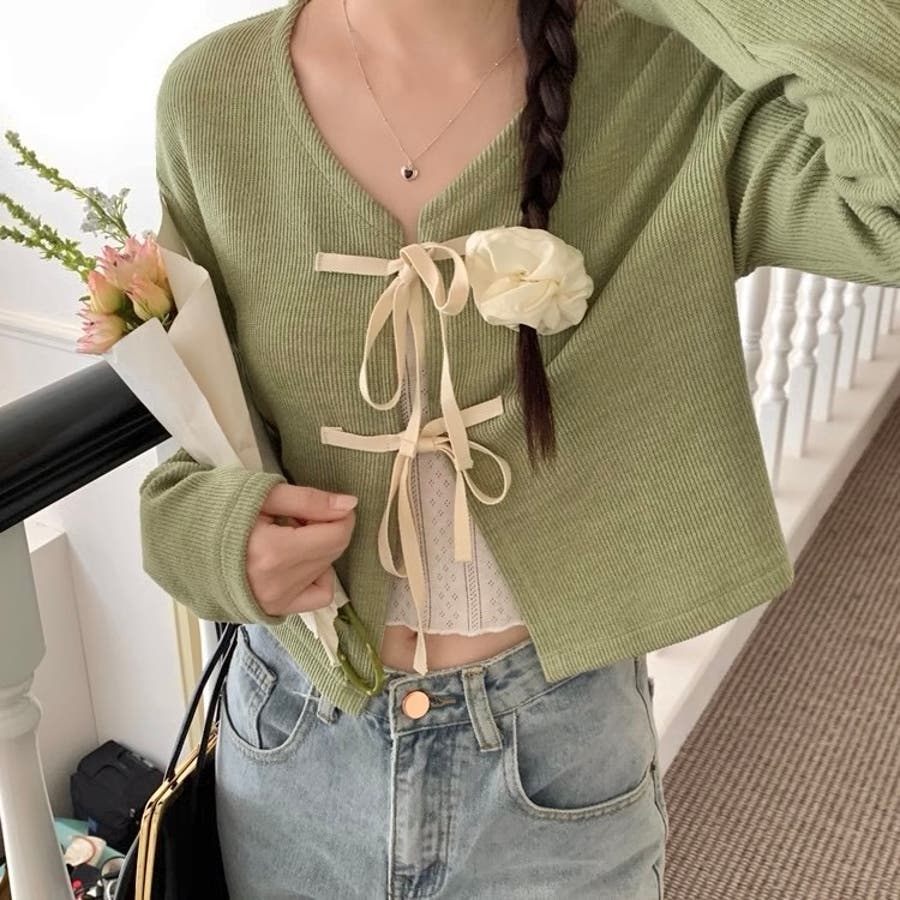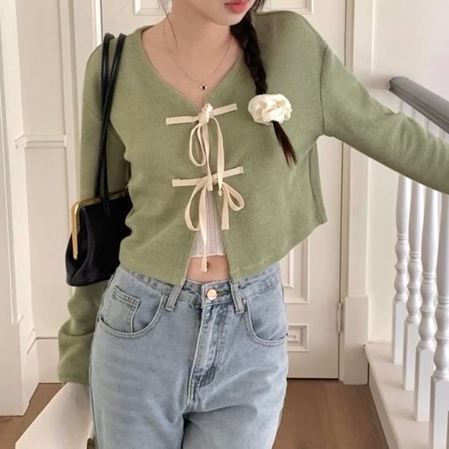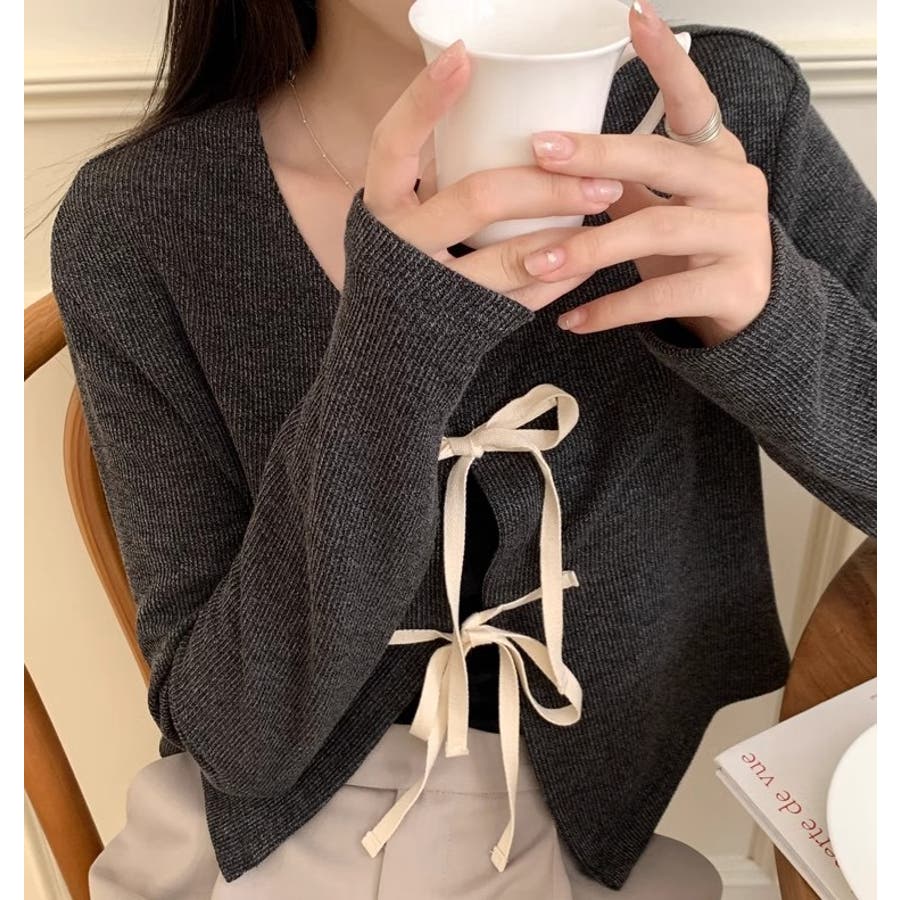 配色フロントリボンカーディガン