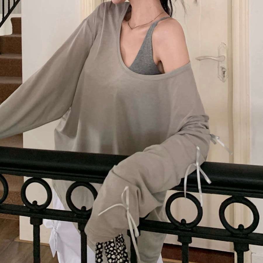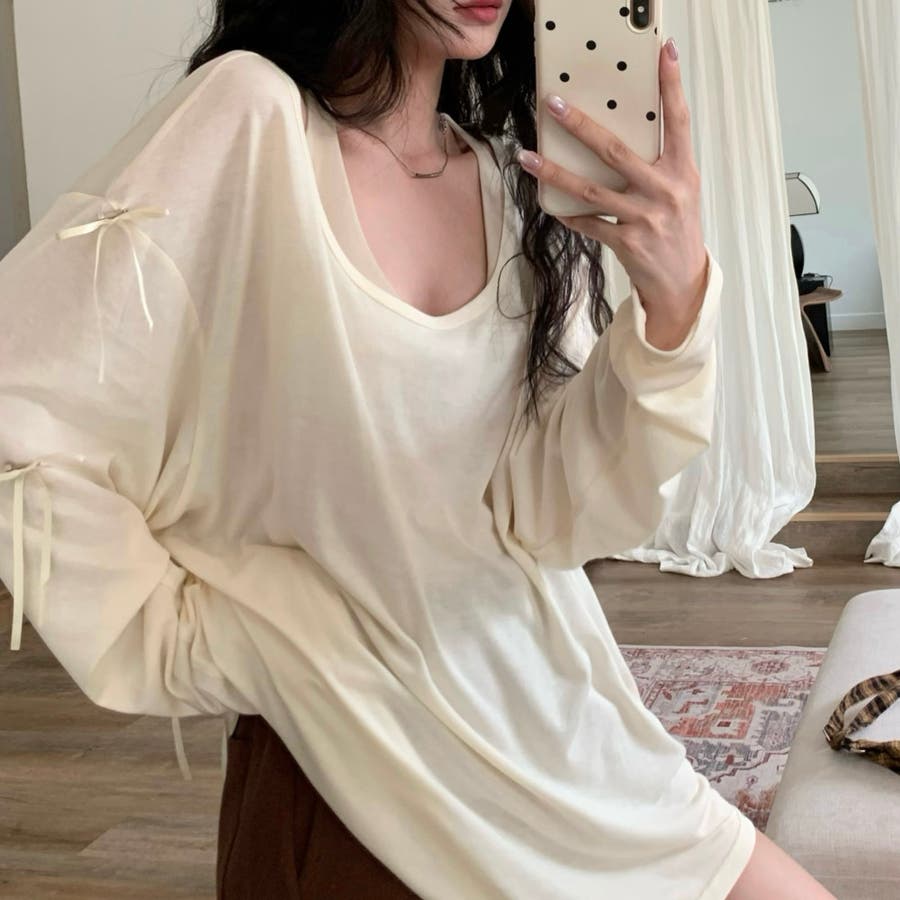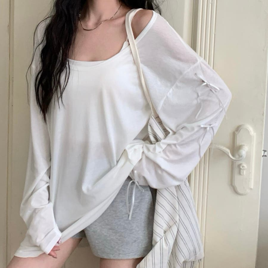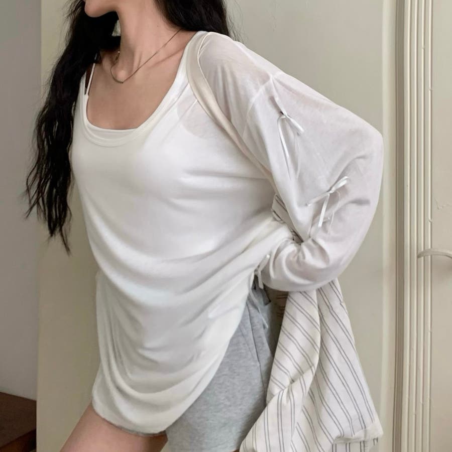 大人 カジュアル きれいめ 韓国ファッション 韓国コーデ Y2K オフィスカジュアル トップス 透け感 シアー感 Uネック 長袖 ロンT 無地 春服 夏服 秋服 10代 20代 30代 40代 春 夏 秋