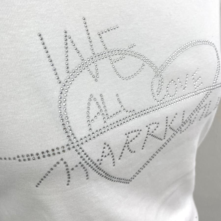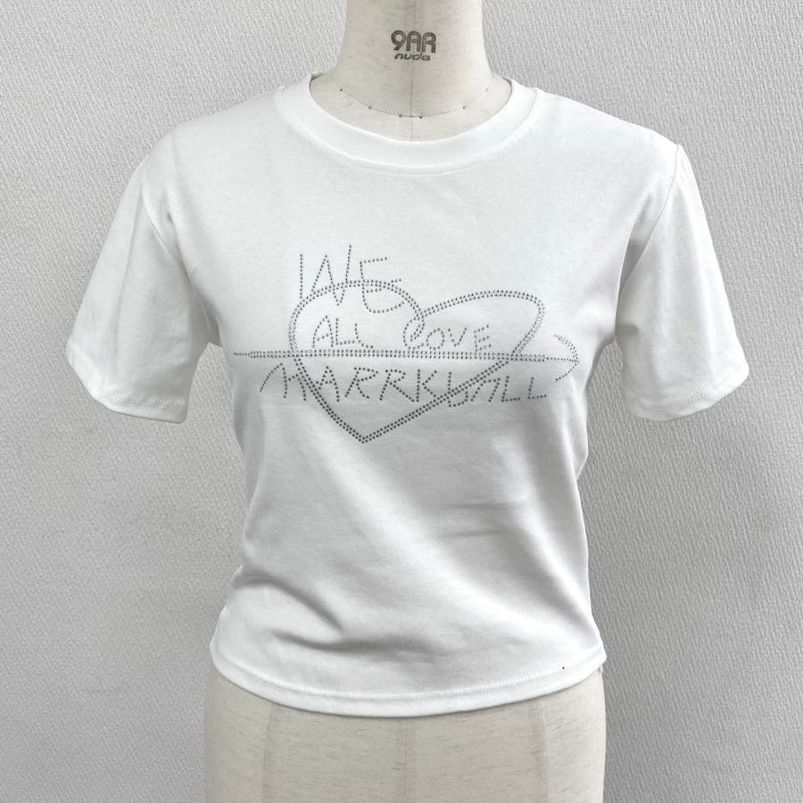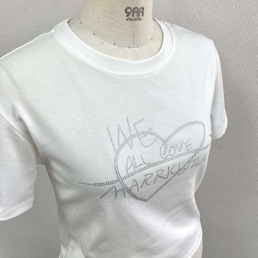 【ホワイト】ラインストーンハートロゴコンパクトTシャツ