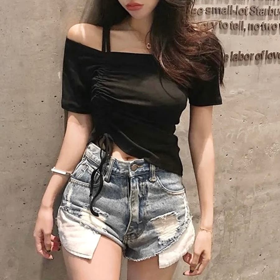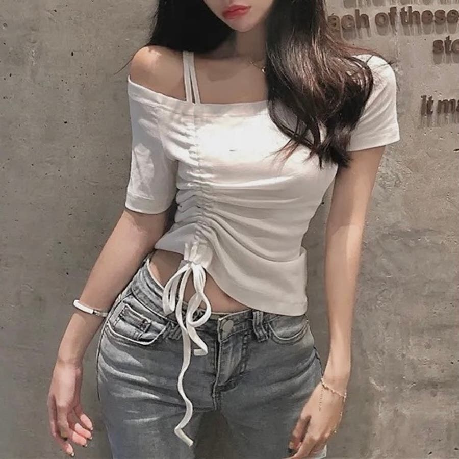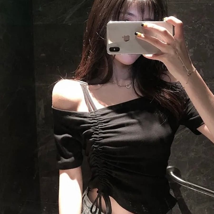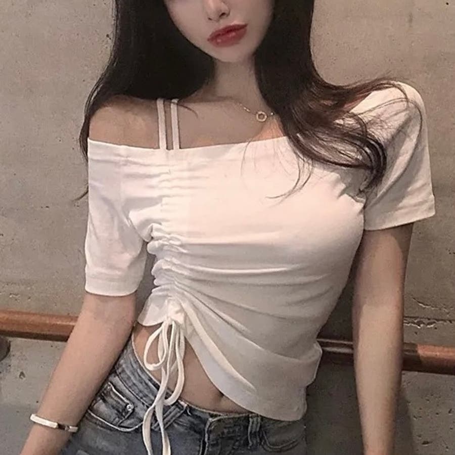 大人 カジュアル きれいめ 韓国ファッション 韓国コーデ Y2K オフィスカジュアル トップス 肌見せ 肩見せ 肩開き 無地 半袖 くしゅくしゅ 春服 夏服 秋服 10代 20代 30代 40代 春 夏 秋