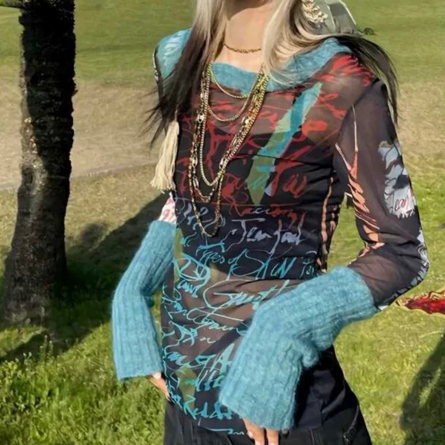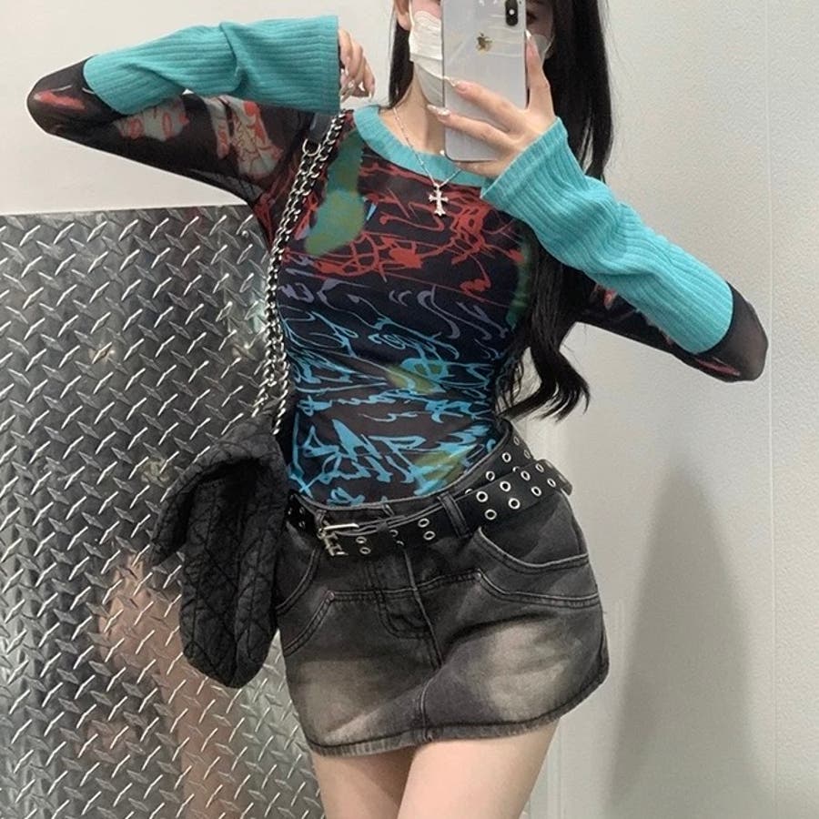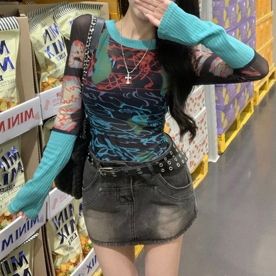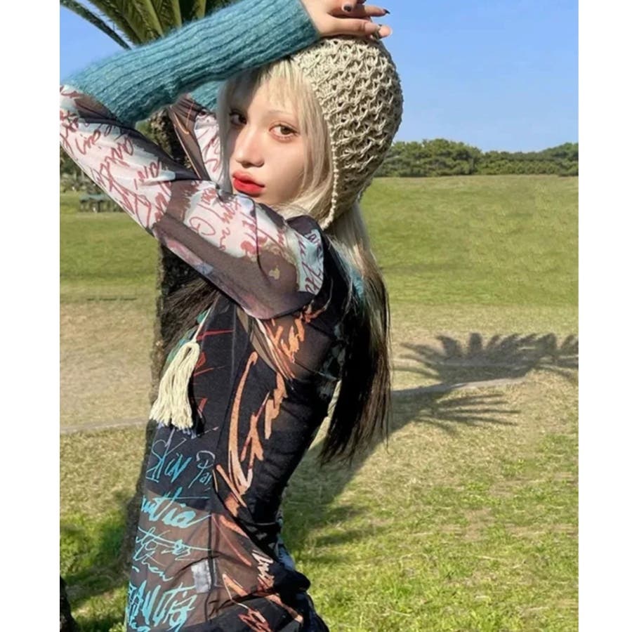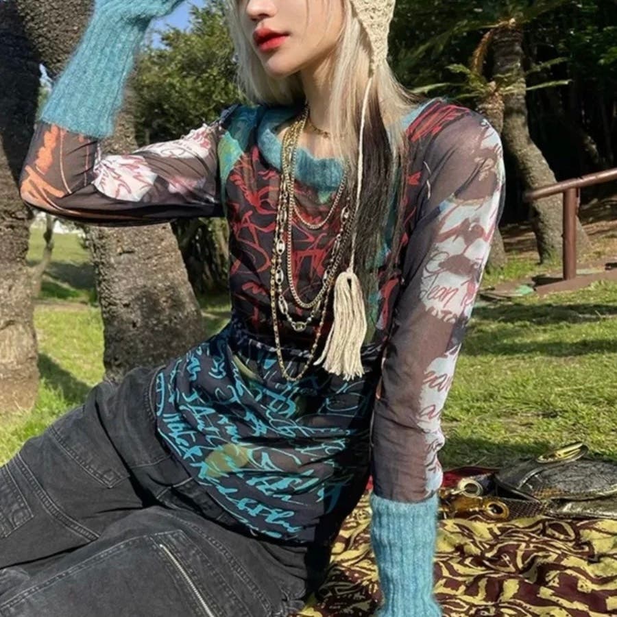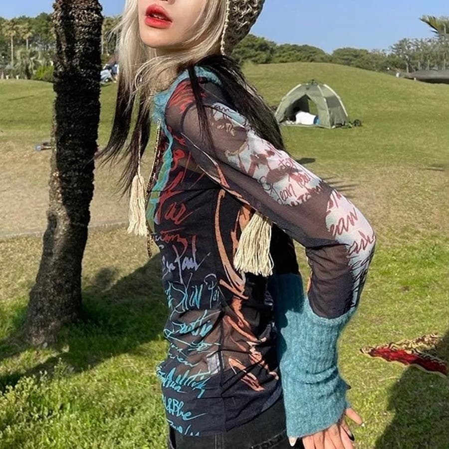 大人 カジュアル きれいめ 韓国ファッション 韓国コーデ ロンT トップス シースルー 透け感 シアーコーデ プリント モード Y2K オフィスカジュアル 春服 冬服 秋服 10代 20代 30代 40代 春 冬 秋
