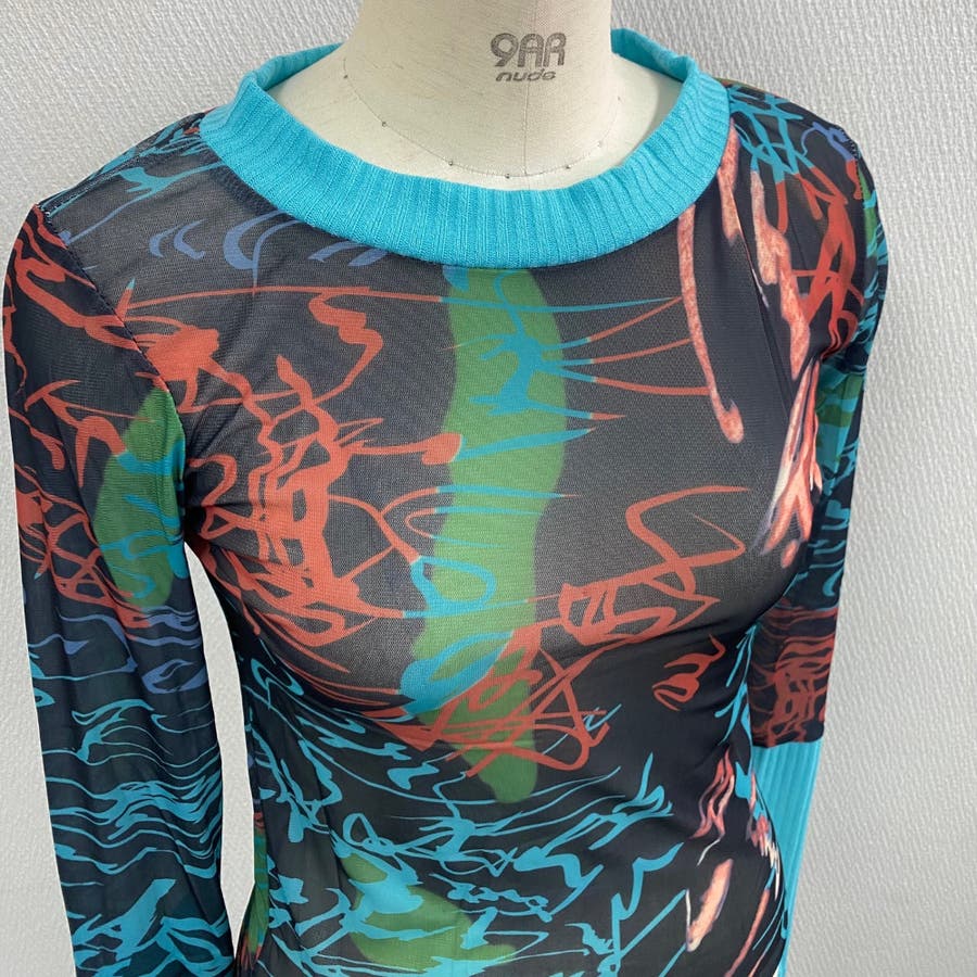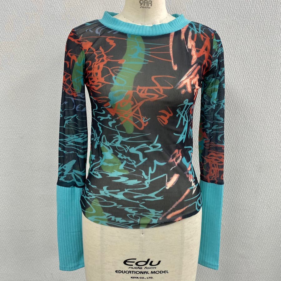 カラフルなアート風のプリントが目を引き、個性的でスタイリッシュな印象を与えます。