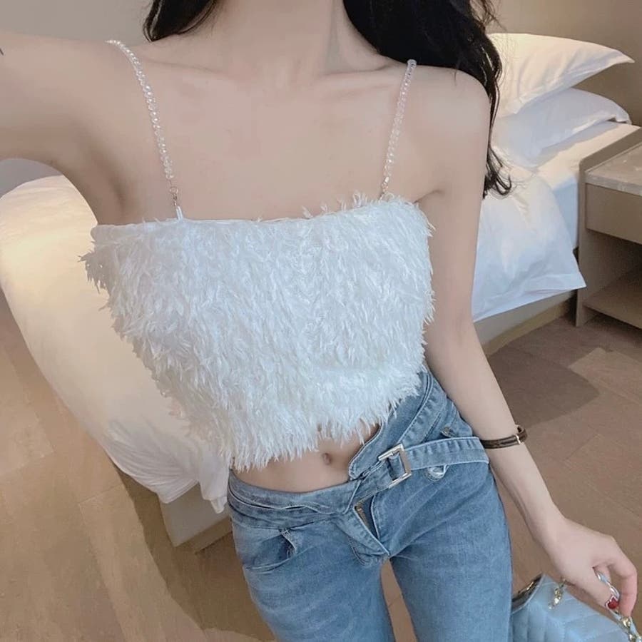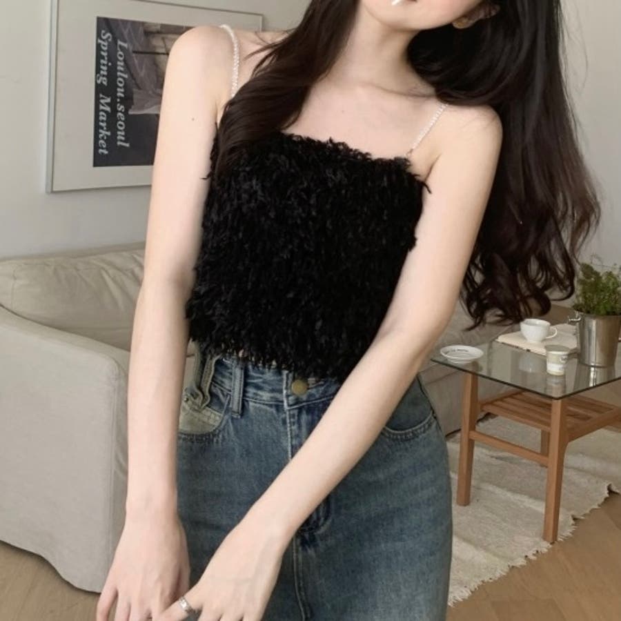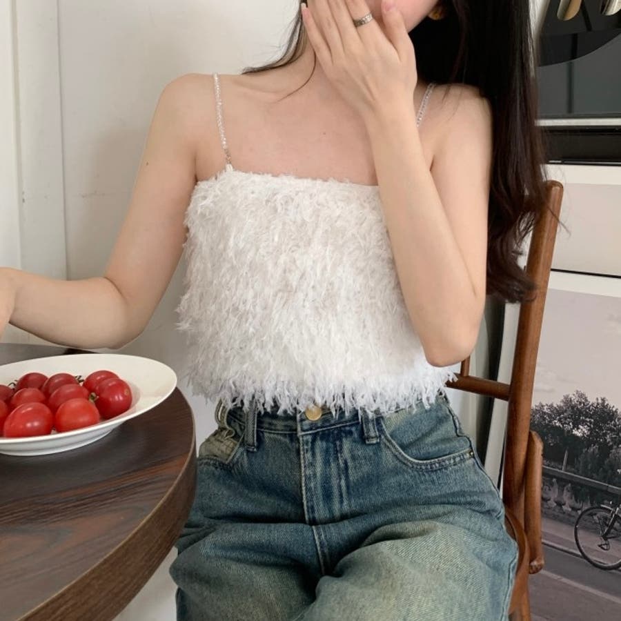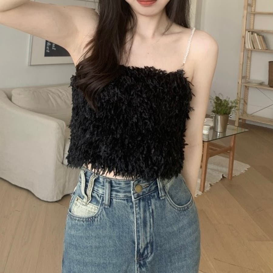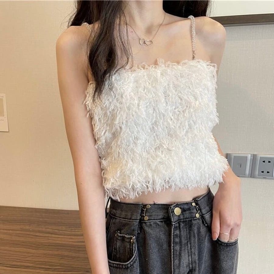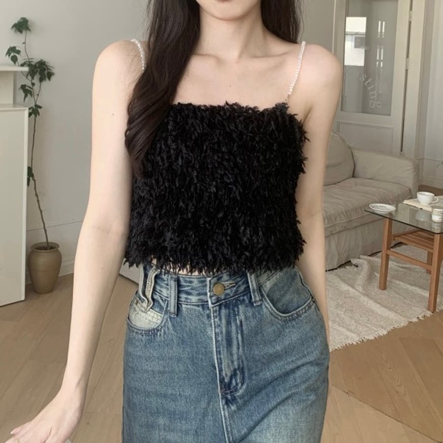 大人 カジュアル きれいめ 韓国ファッション 韓国コーデ Y2K キャミソール ベアトップ ふわふわ シャギー オフィスカジュアル 春服 夏服 秋服 10代 20代 30代 40代 春 夏 秋