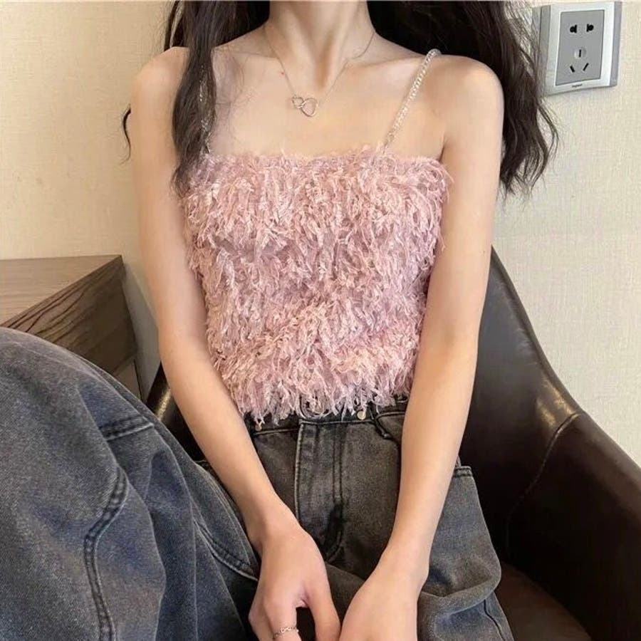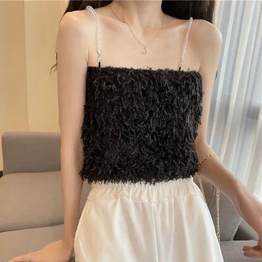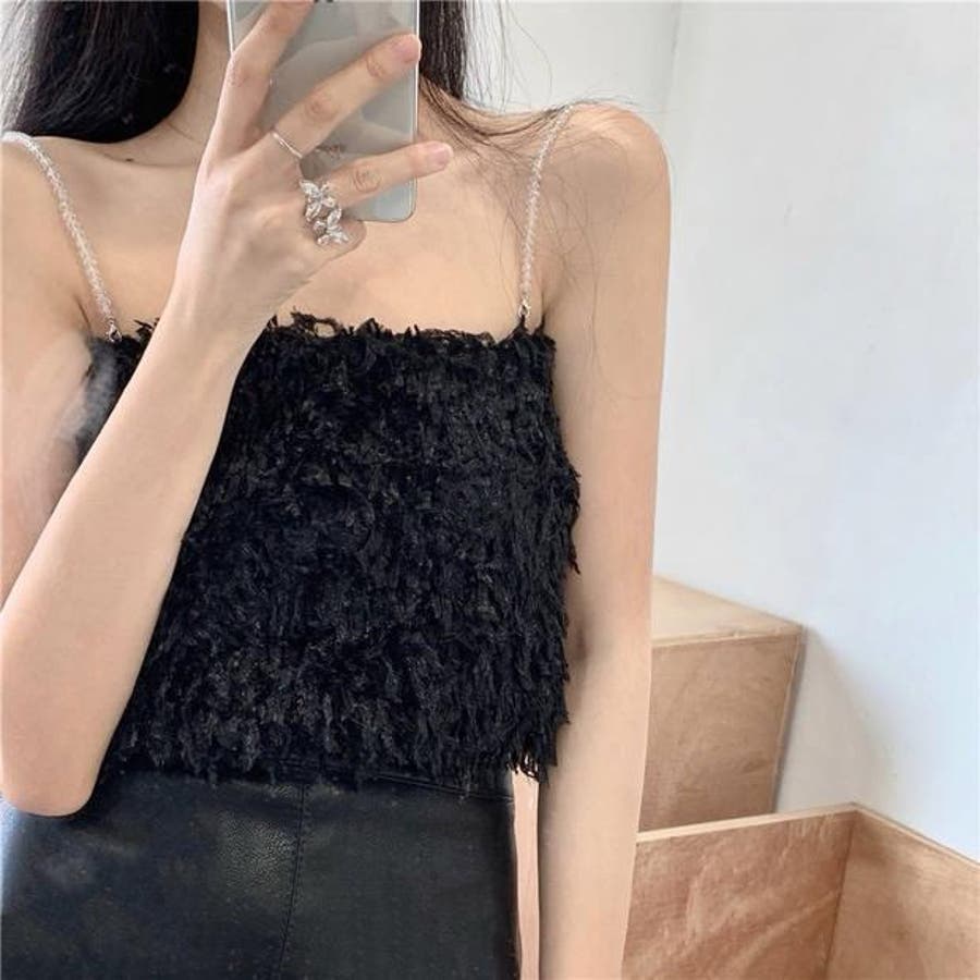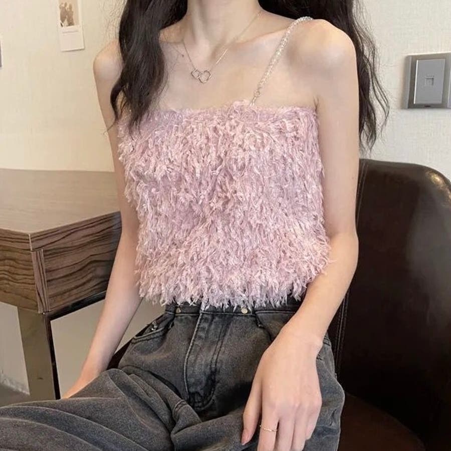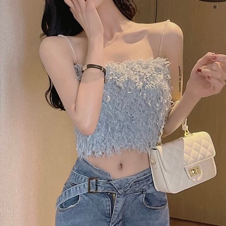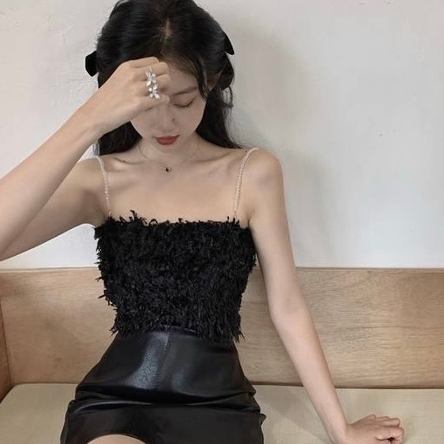 大人 カジュアル きれいめ 韓国ファッション 韓国コーデ Y2K キャミソール ベアトップ ふわふわ シャギー オフィスカジュアル 春服 夏服 秋服 10代 20代 30代 40代 春 夏 秋