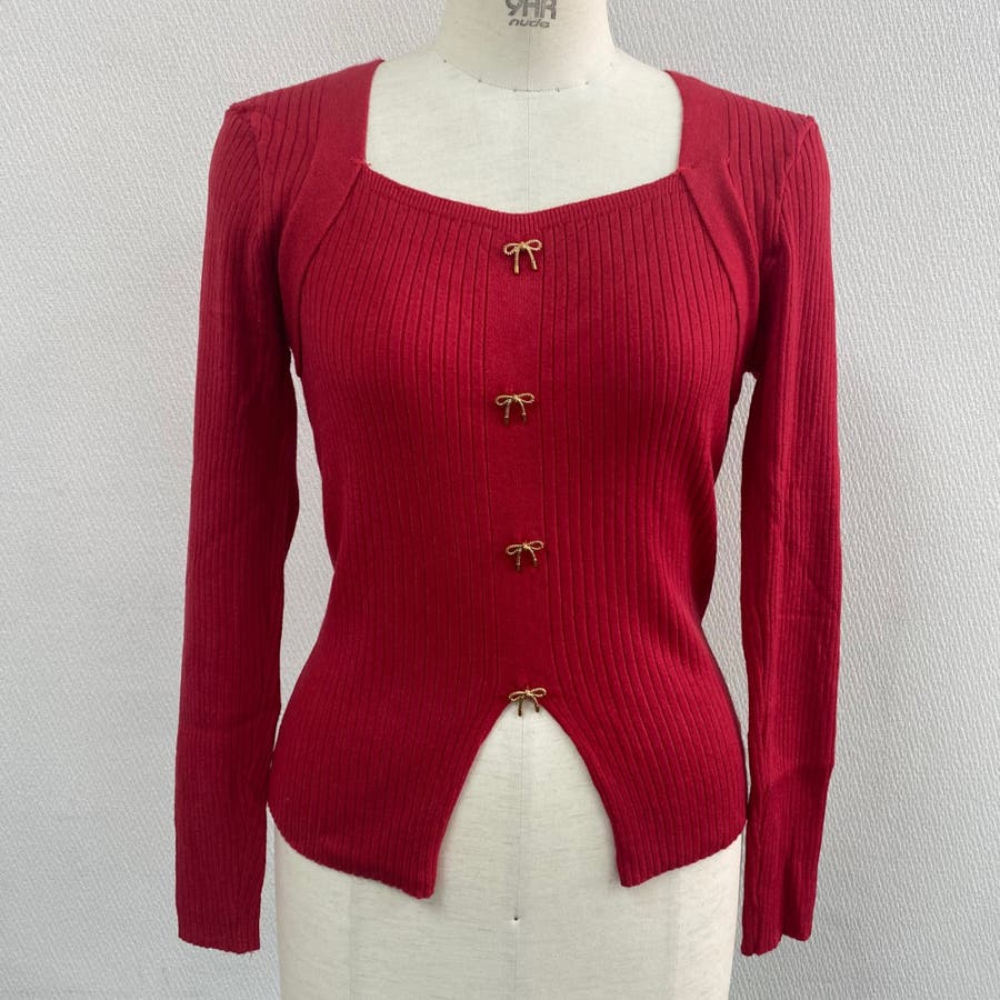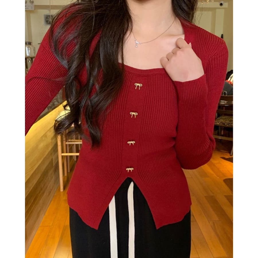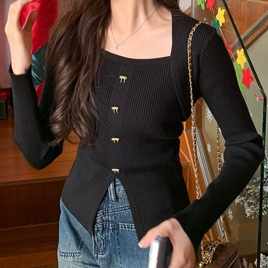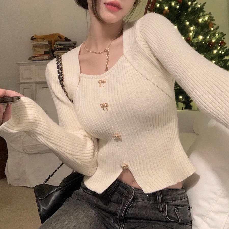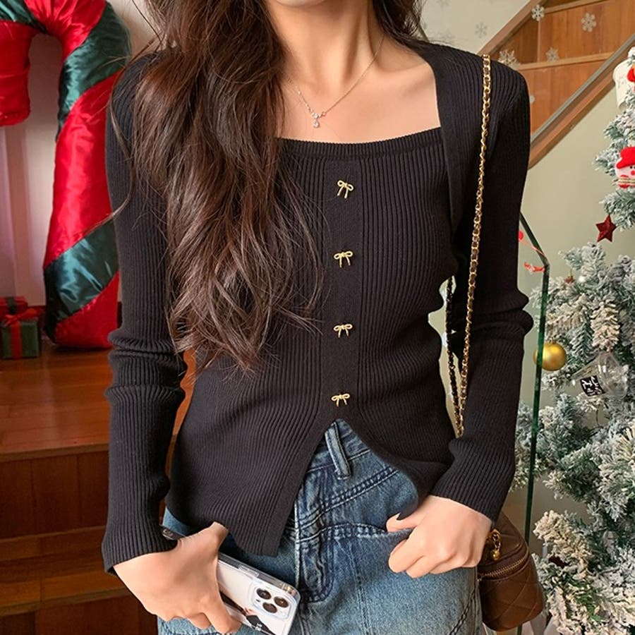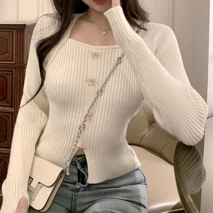 リボンボタンデコルテ空きリブニット