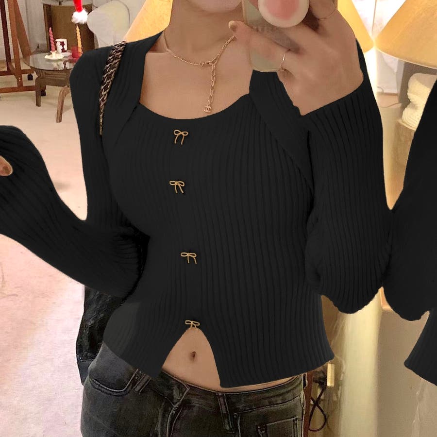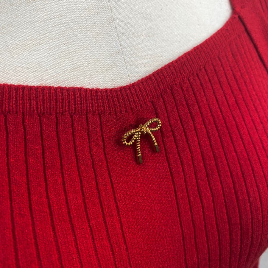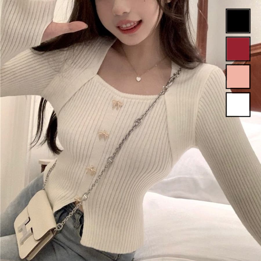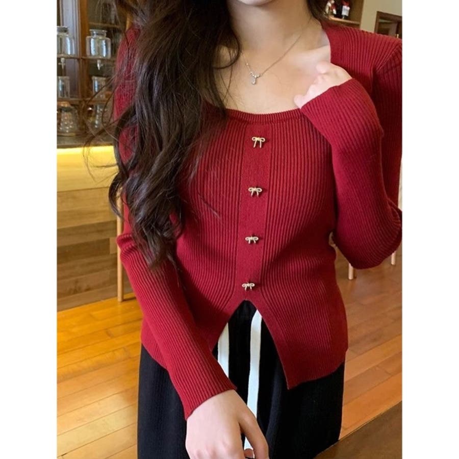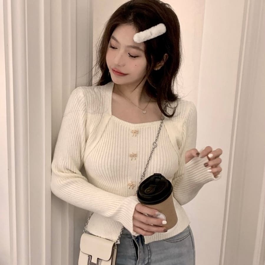 リボンボタンデコルテ空きリブニット