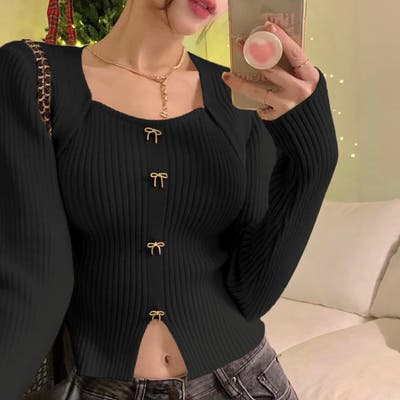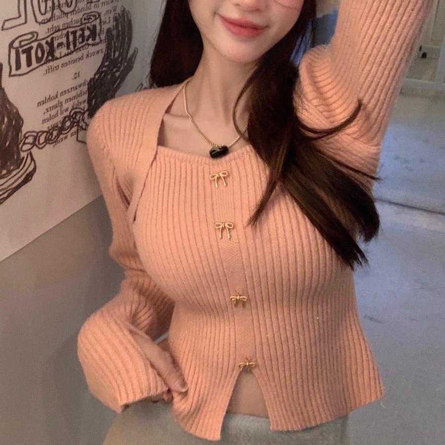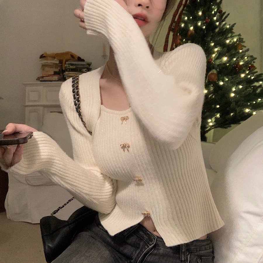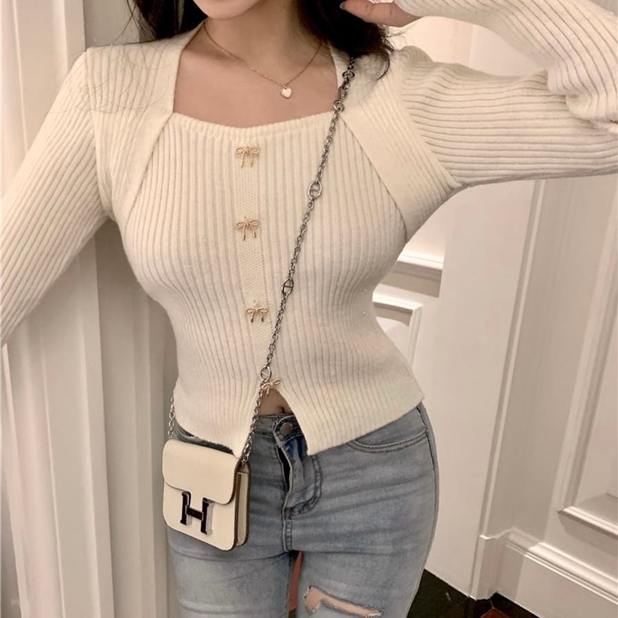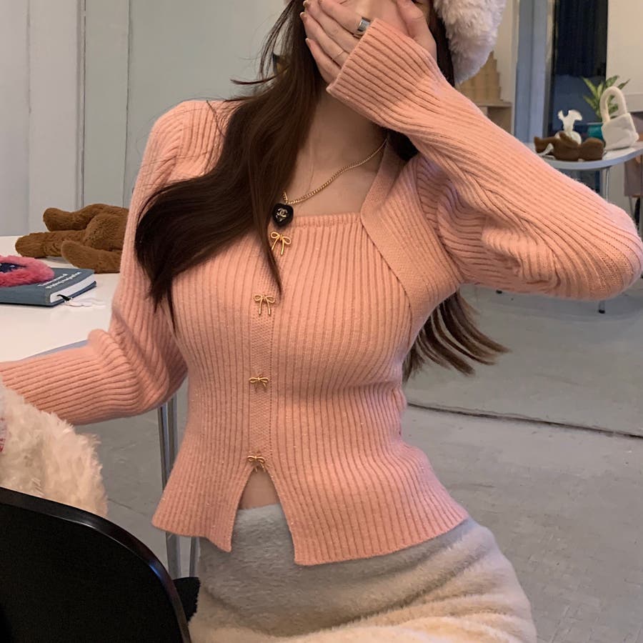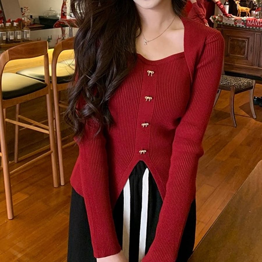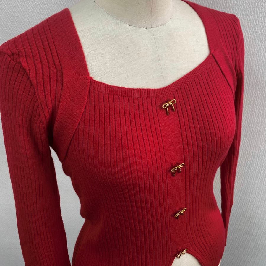 リボンボタンデコルテ空きリブニット
