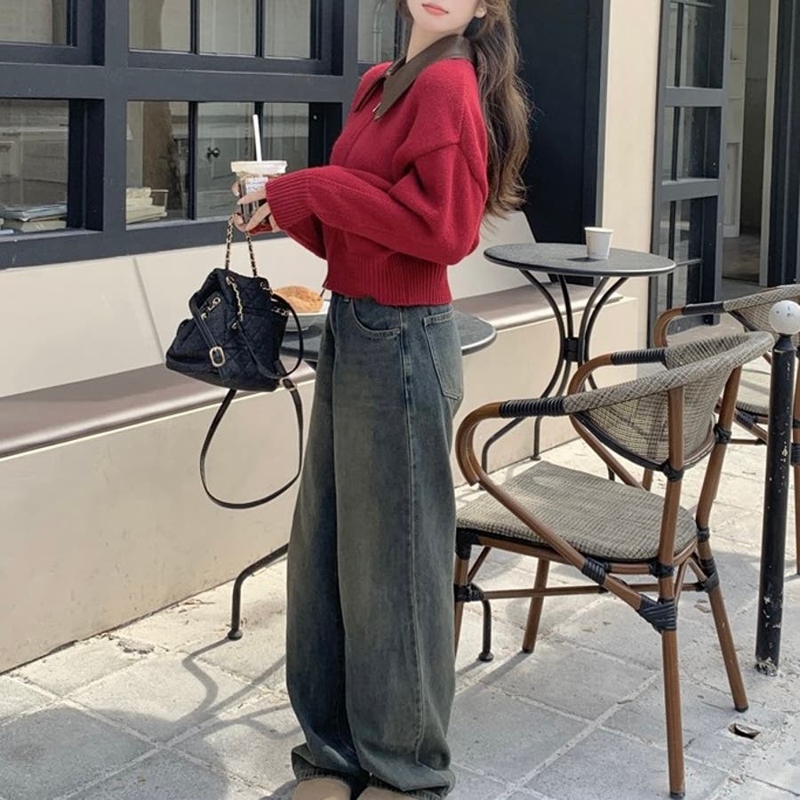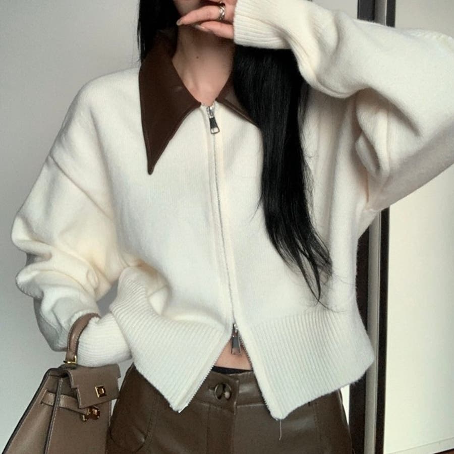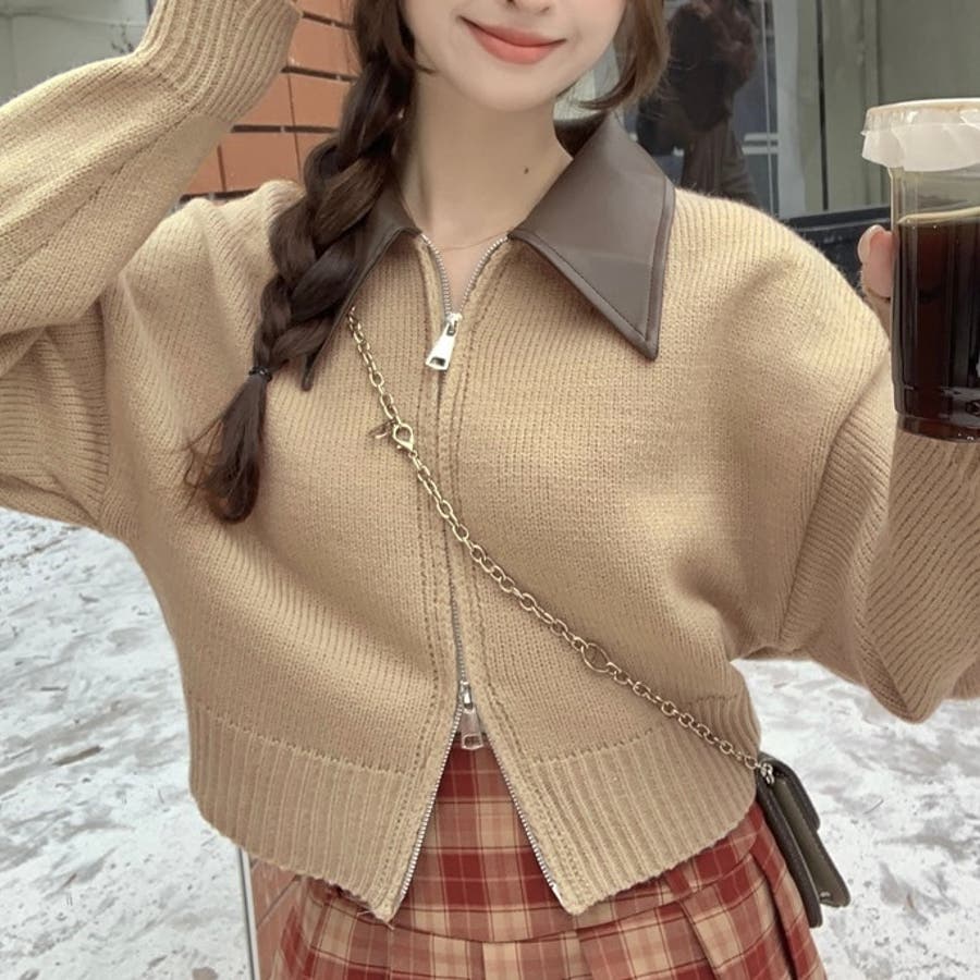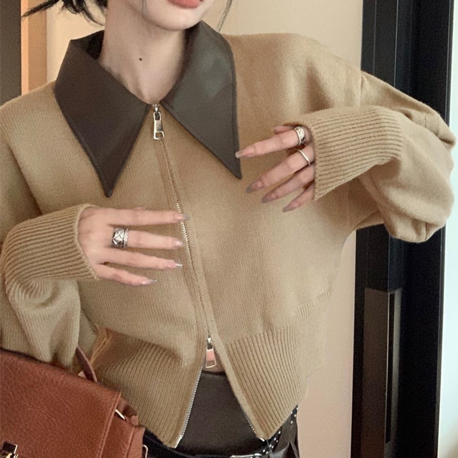 レザー調の襟がエレガントなアクセントを加え、カジュアルな着こなしにもモードな印象をプラスします。