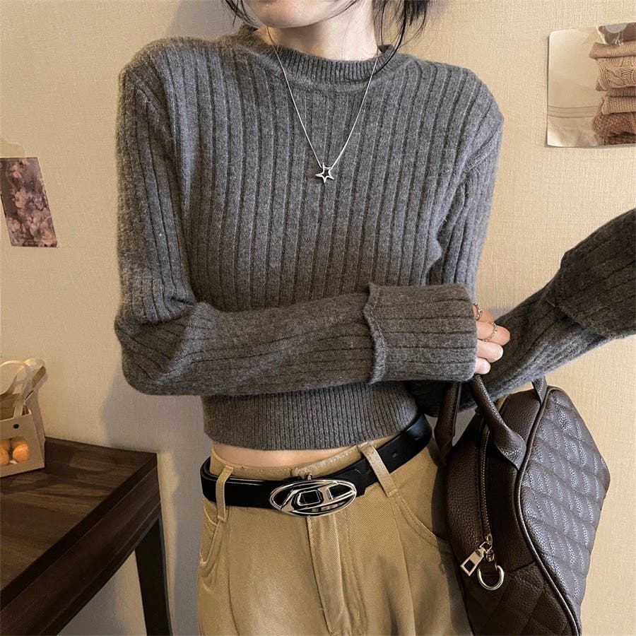 シンプルでスタイリッシュなデザインが魅力のクロップド丈リブニットトップス。