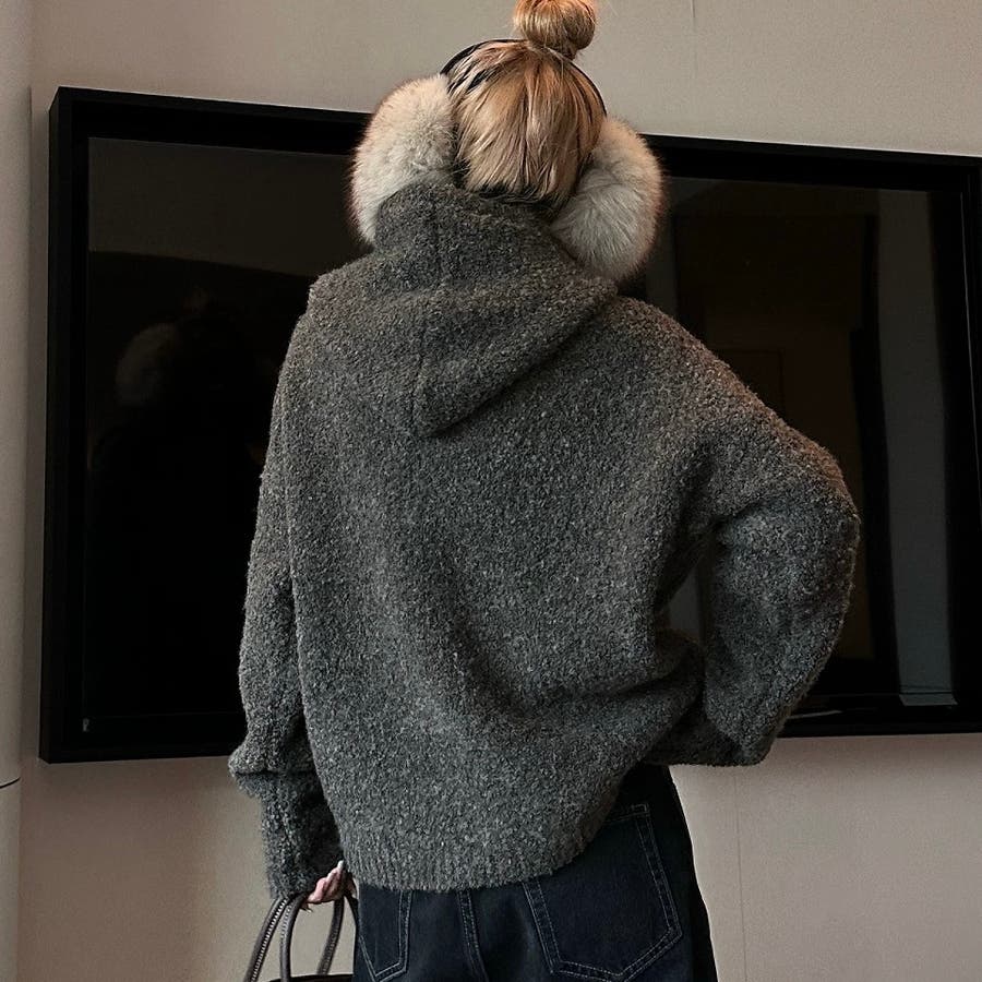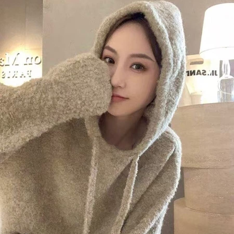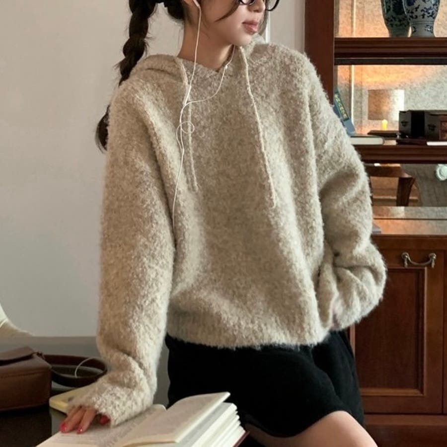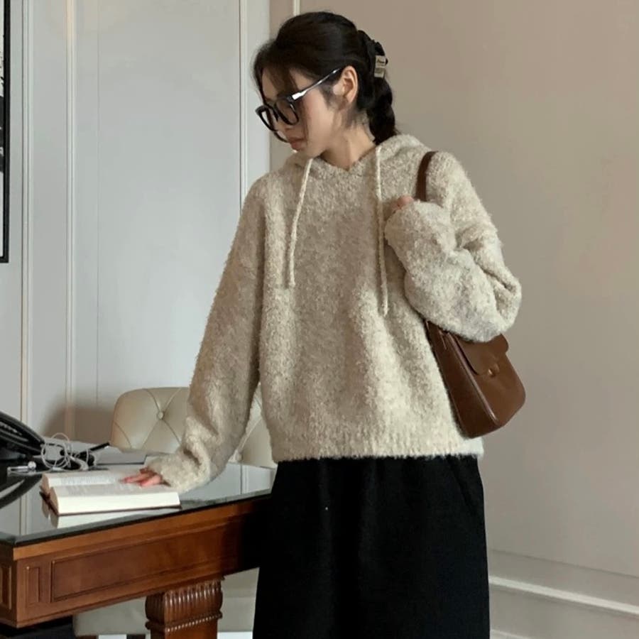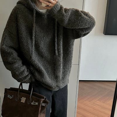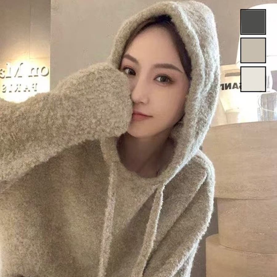 大人 カジュアル きれいめ 韓国ファッション 韓国コーデ Y2K オフィスカジュアル パーカー ゆったり 無地 パイル ボア フリース フード ニット トップス 春服 夏服 秋服 10代 20代 30代 40代 春 夏 秋