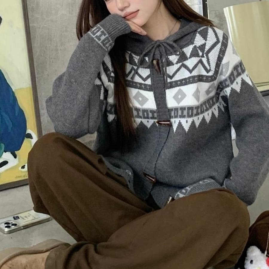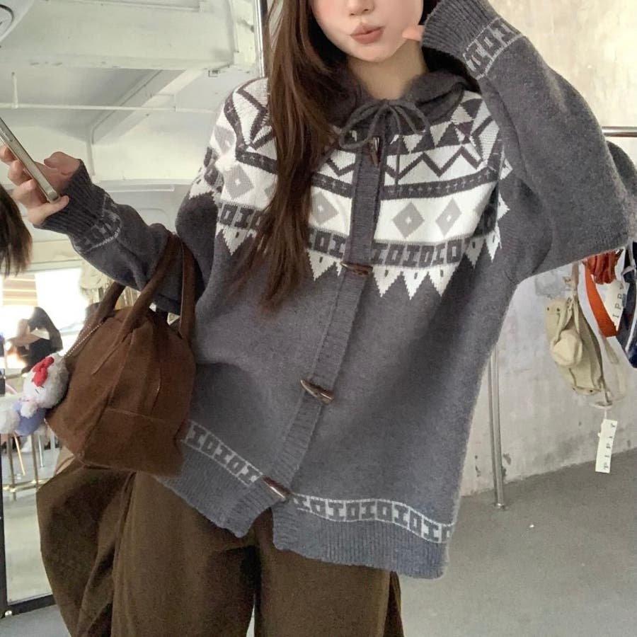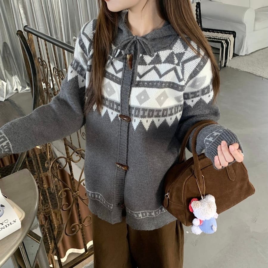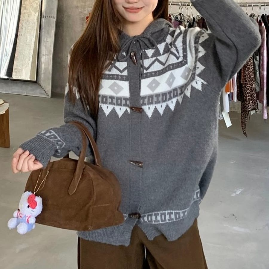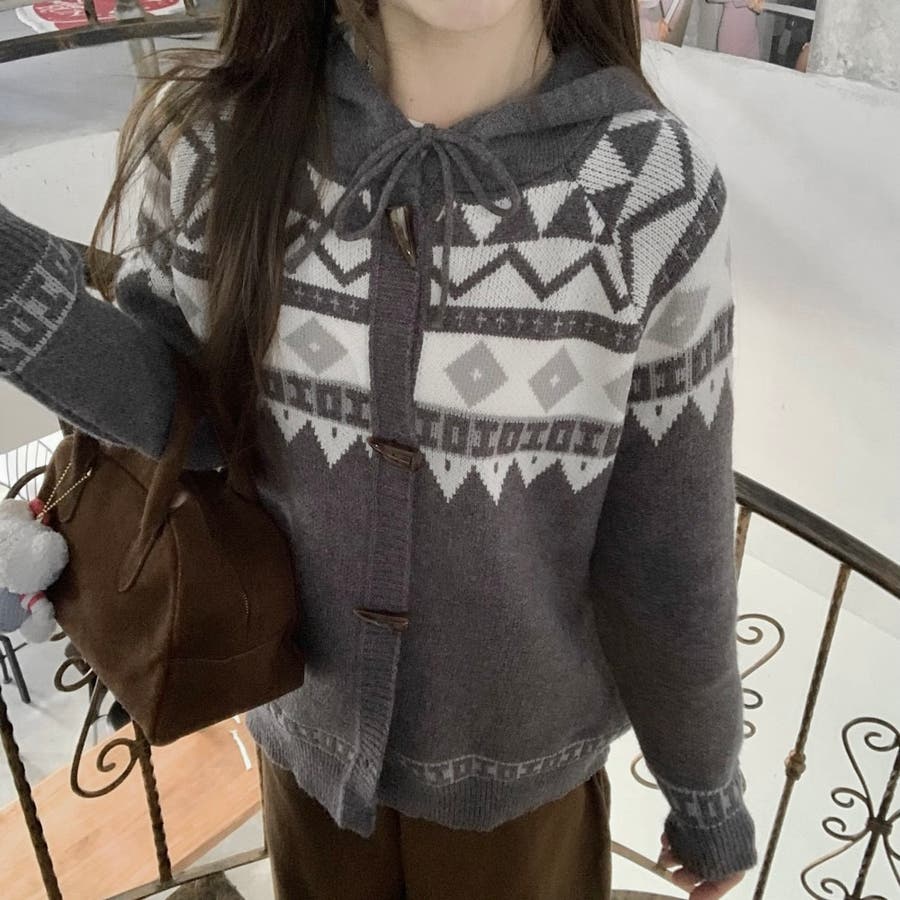 レトロな雰囲気漂うノルディック柄のフード付きカーディガンは、季節感をたっぷりと感じさせる暖かみのあるデザインが特徴です。