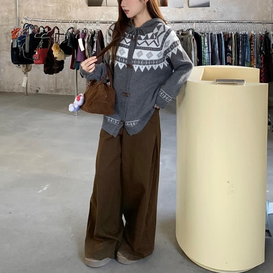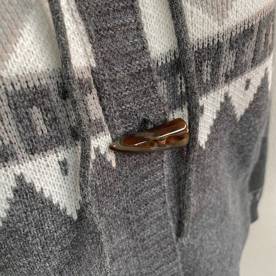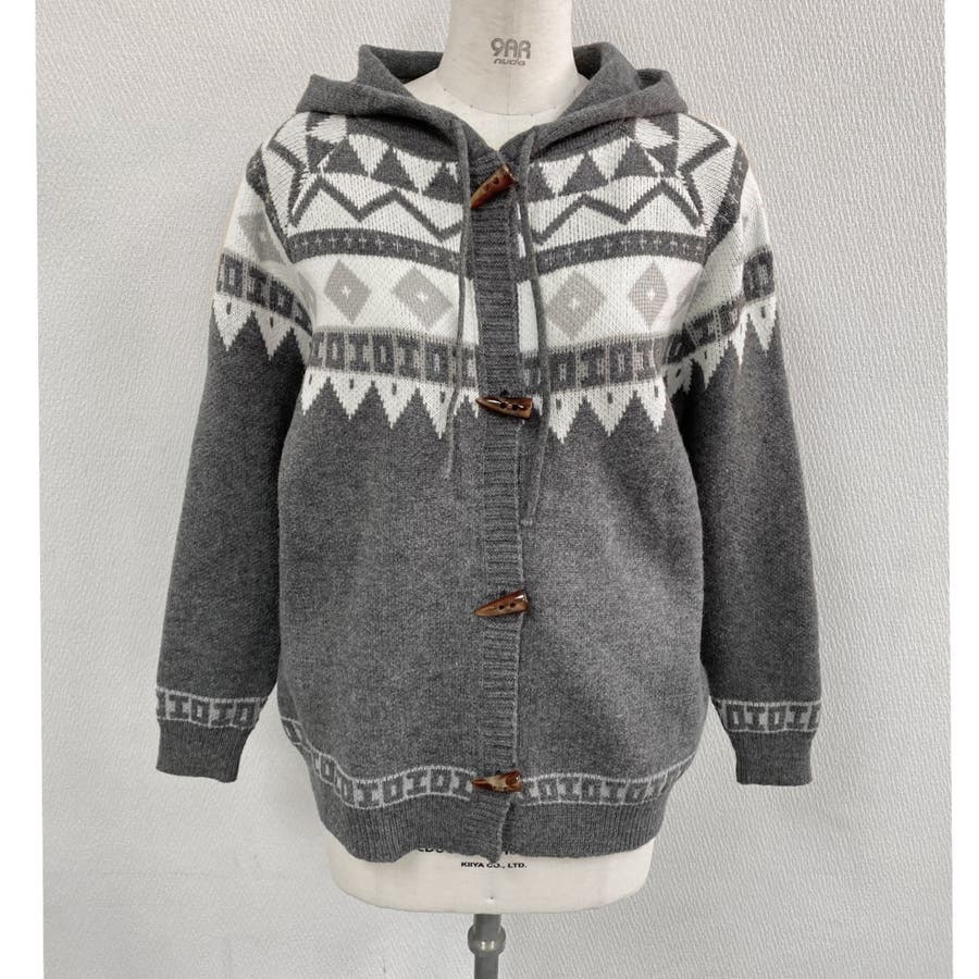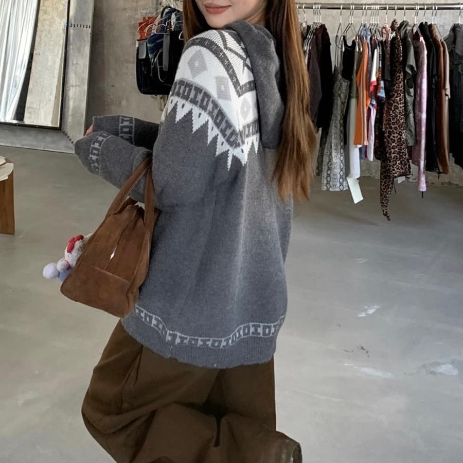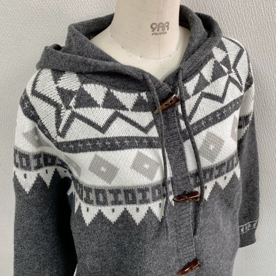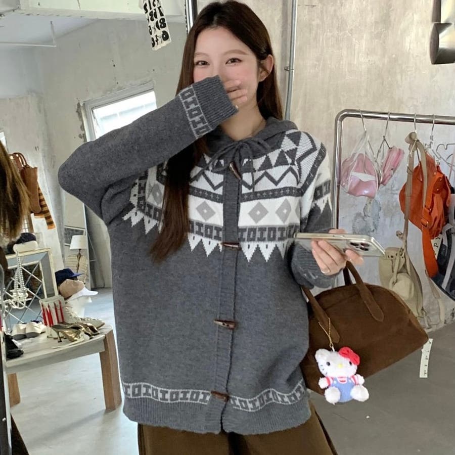 レトロな雰囲気漂うノルディック柄のフード付きカーディガンは、季節感をたっぷりと感じさせる暖かみのあるデザインが特徴です。