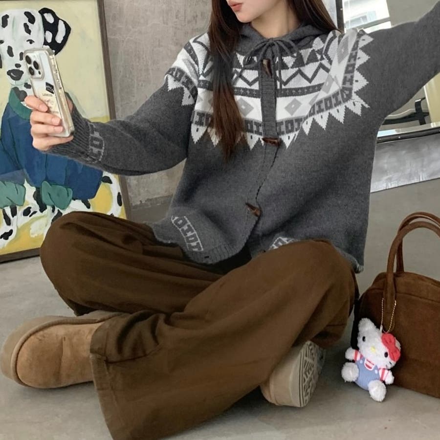 大人 カジュアル きれいめ 韓国ファッション 韓国コーデ Y2K オフィスカジュアル 雪柄 ニットパーカー フーディ 春服 夏服 秋服 10代 20代 30代 40代 春 夏 秋