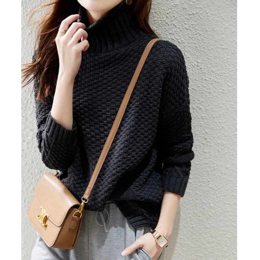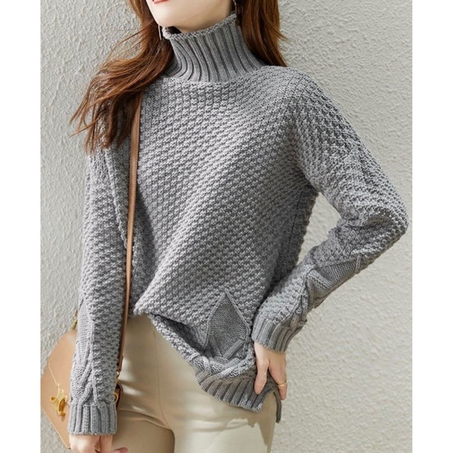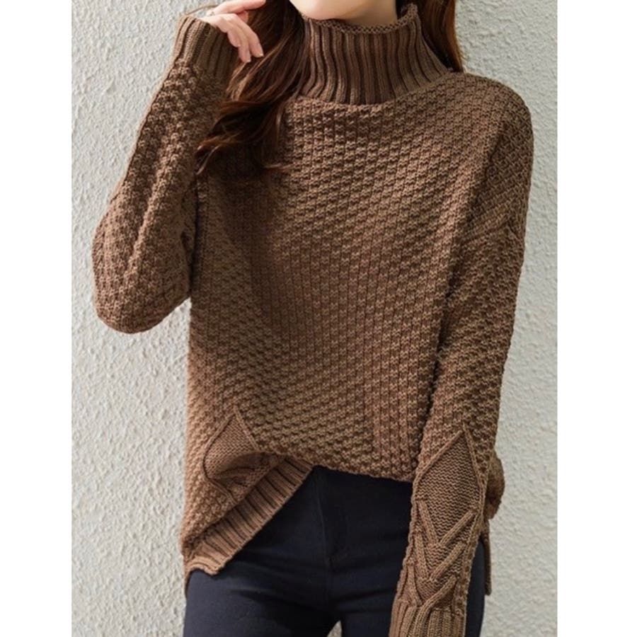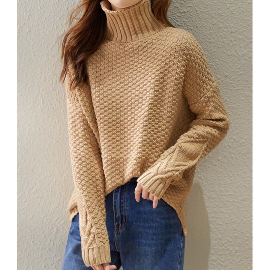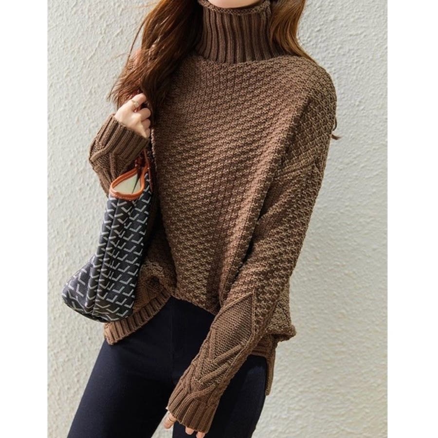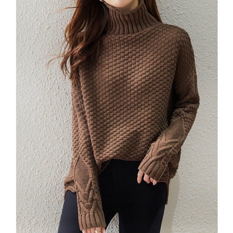こちらのざっくり編みタートルネックニットは、シンプルながらも存在感抜群のアイテムです。