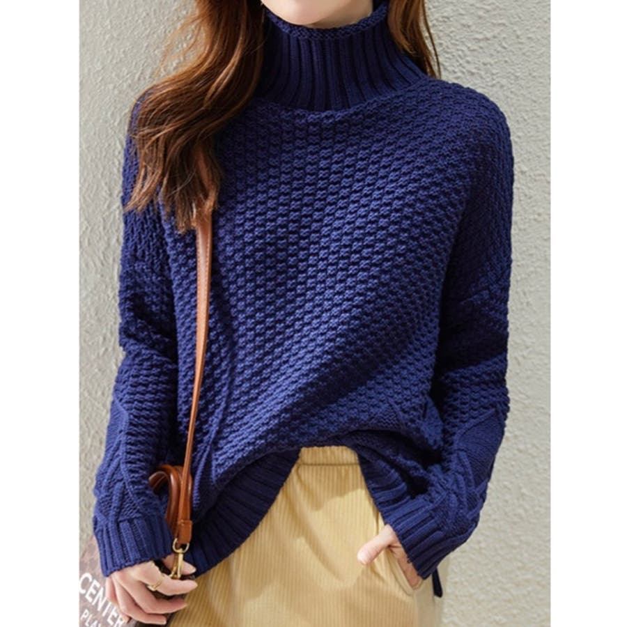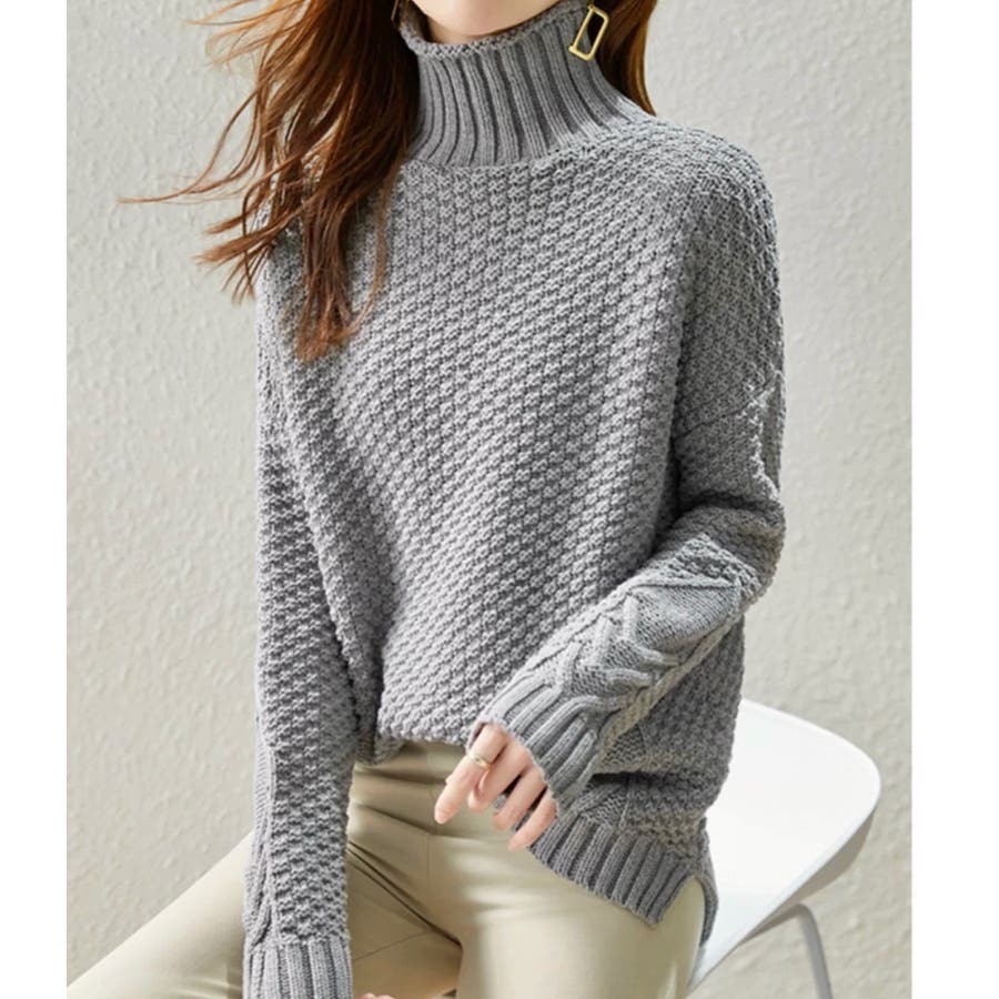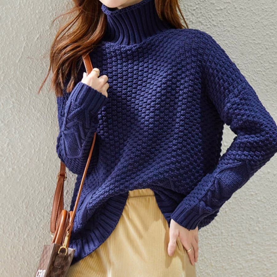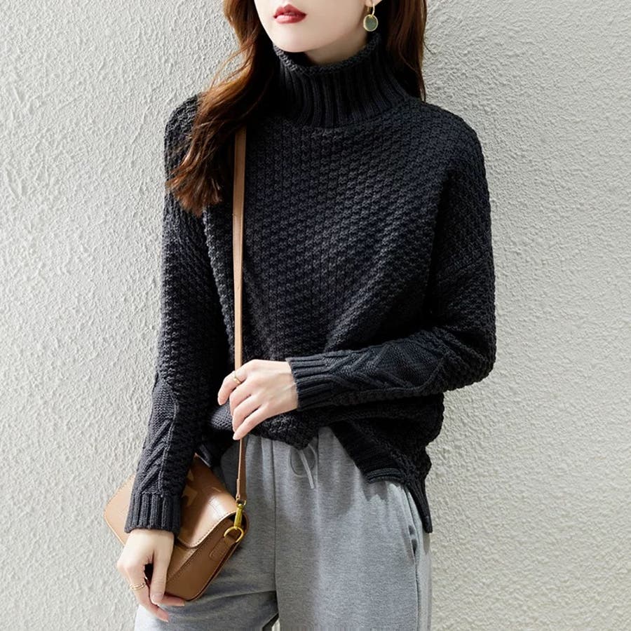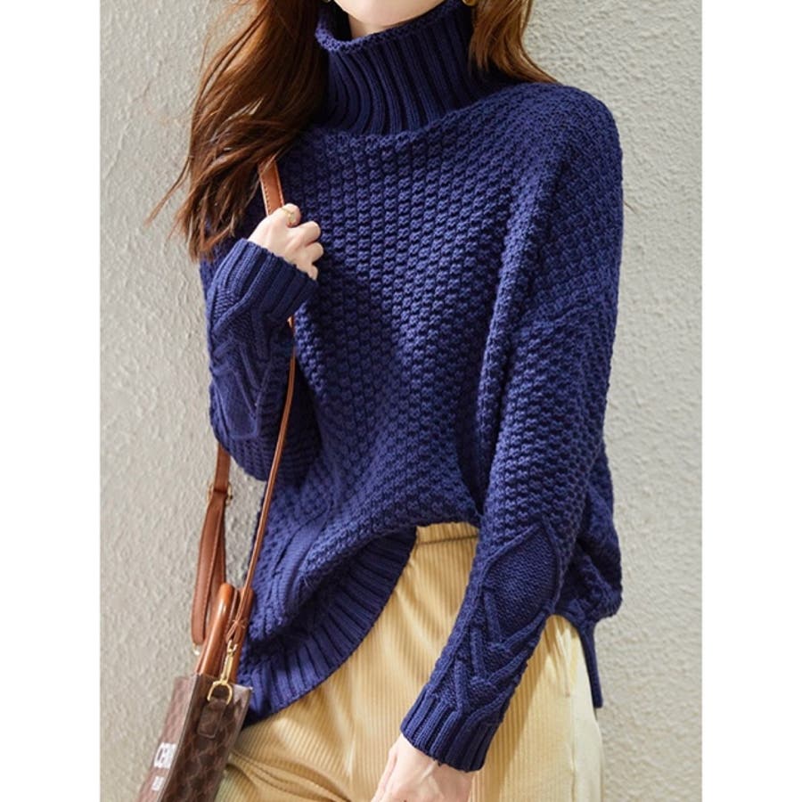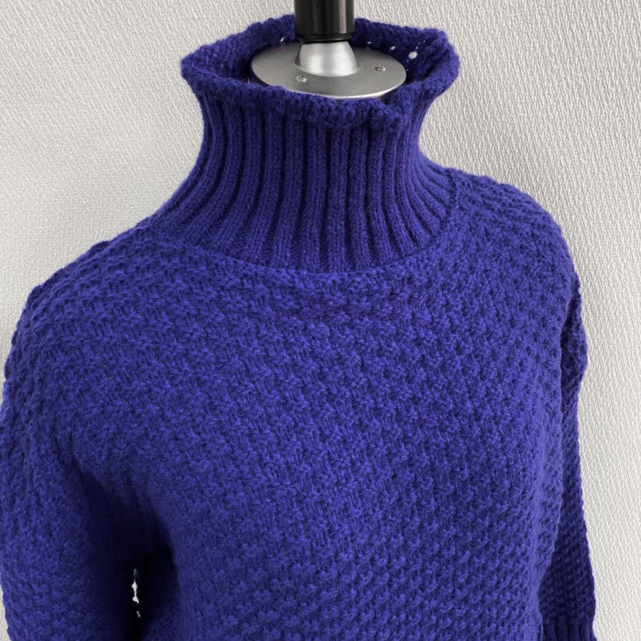 こちらのざっくり編みタートルネックニットは、シンプルながらも存在感抜群のアイテムです。