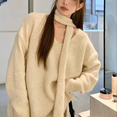大人 カジュアル きれいめ 韓国ファッション 韓国コーデ Y2K オフィスカジュアル 2点セット マフラー付き オーバーサイズ 無地 Vネック 春服 夏服 秋服 10代 20代 30代 40代 春 夏 秋