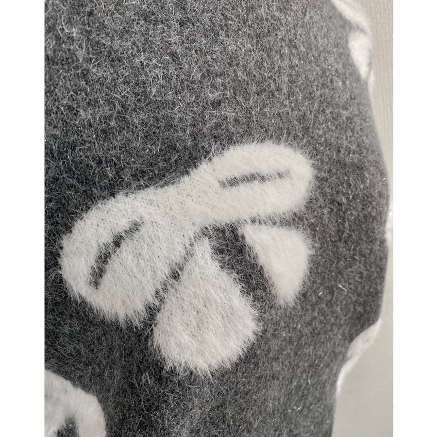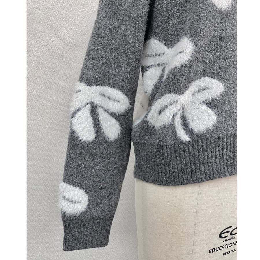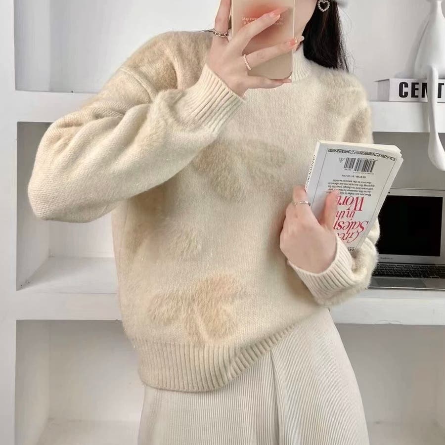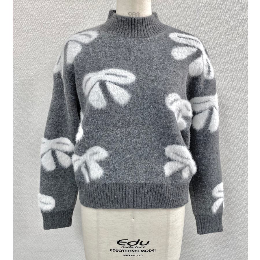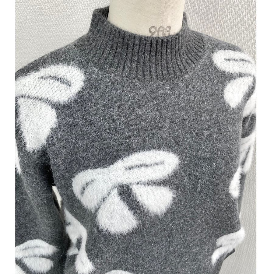 リボン柄モックネックニット