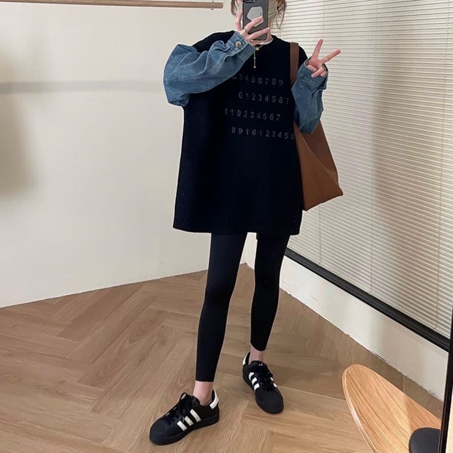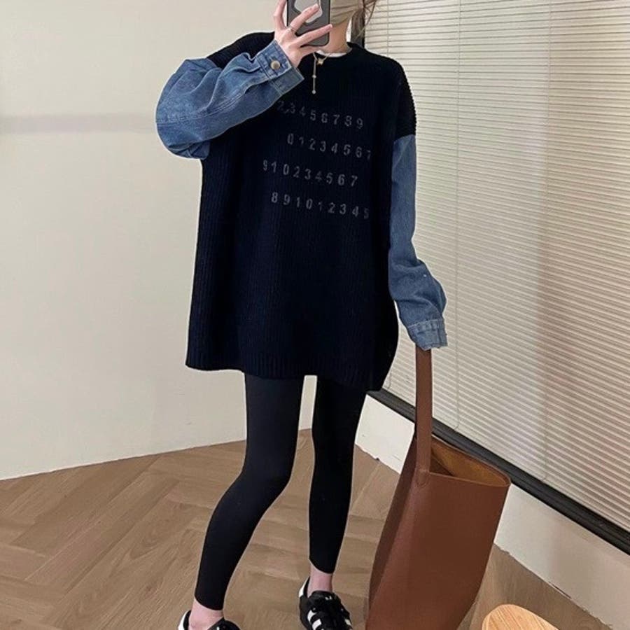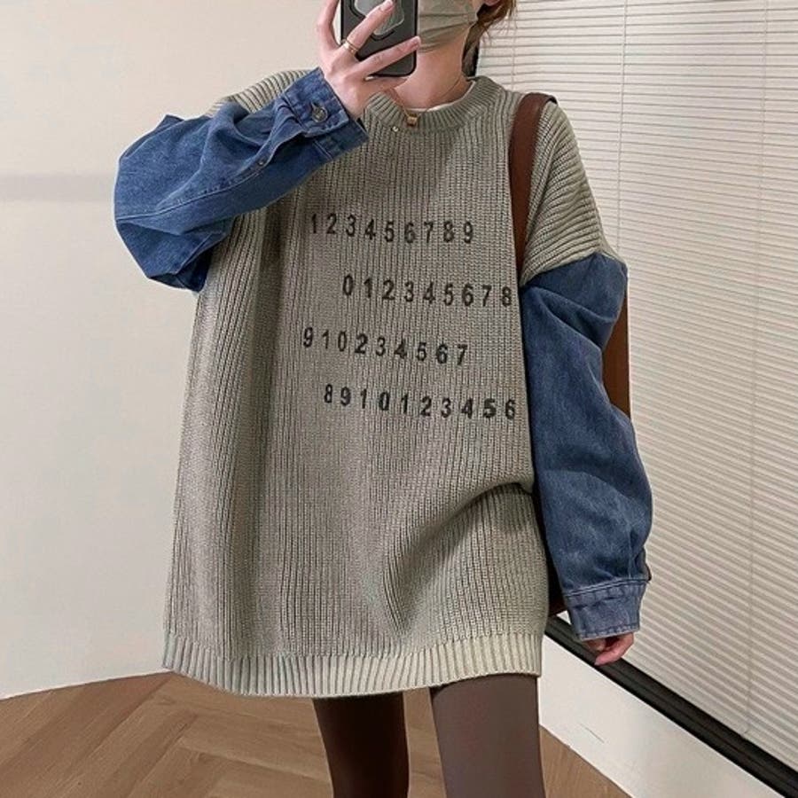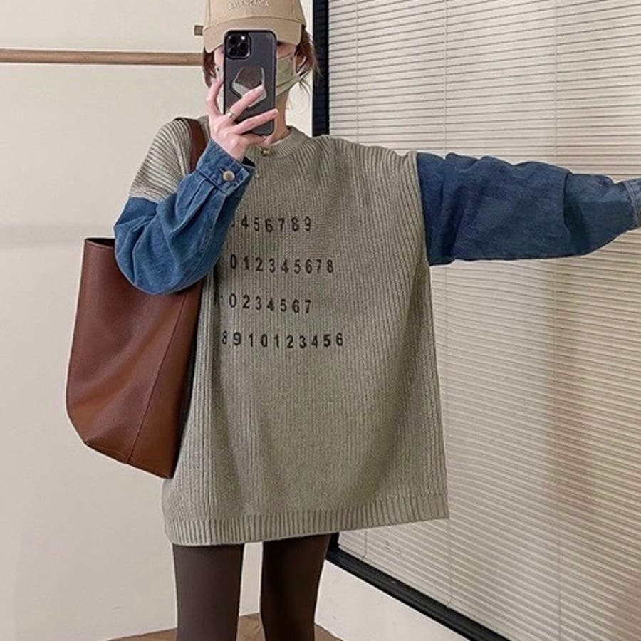 大人 カジュアル きれいめ 韓国ファッション 韓国コーデ Y2K 帽子 春服 冬服 秋服 異素材使い ダンガリー ニット 数字 長袖 10代 20代 30代 40代 春 冬 秋