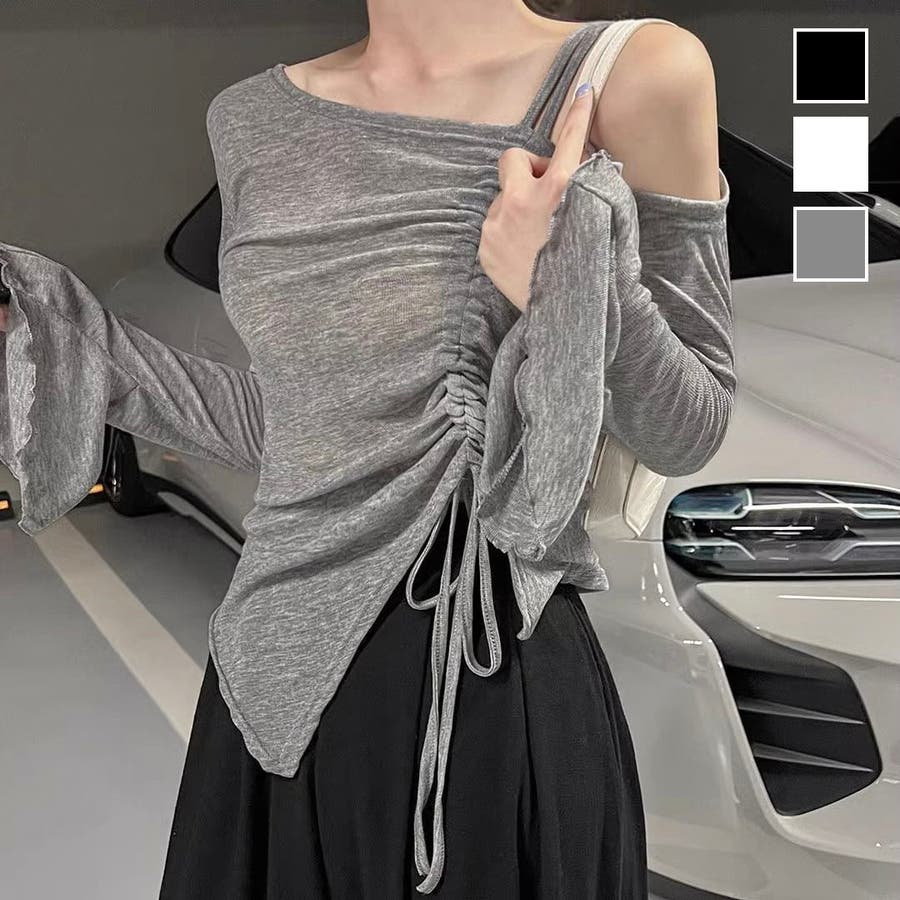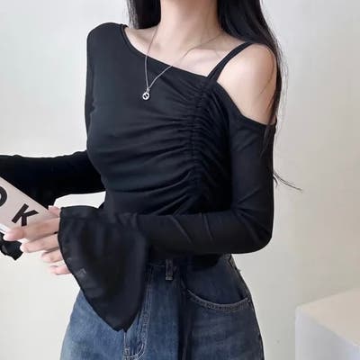 【グレー】【春夏新作】シャーリングワンショルダーアシンメトリートップス