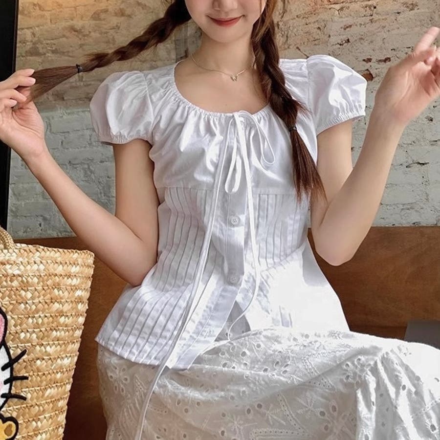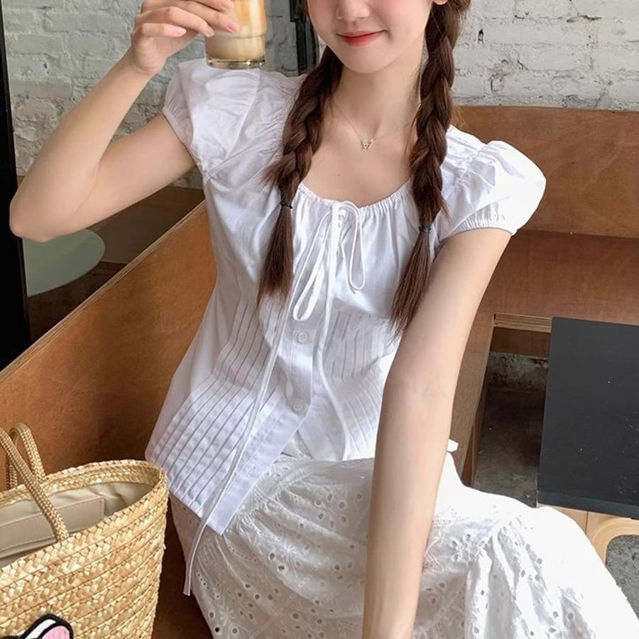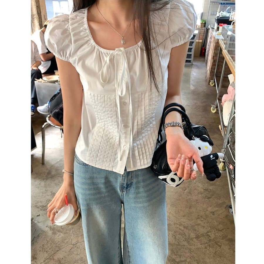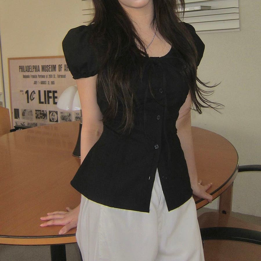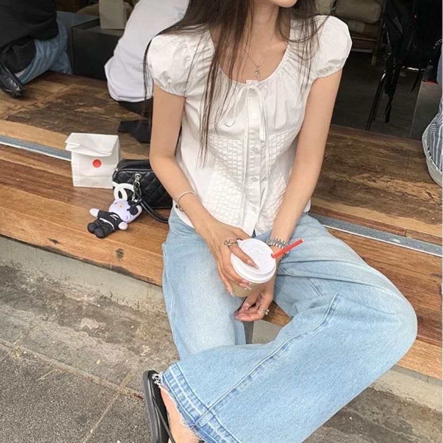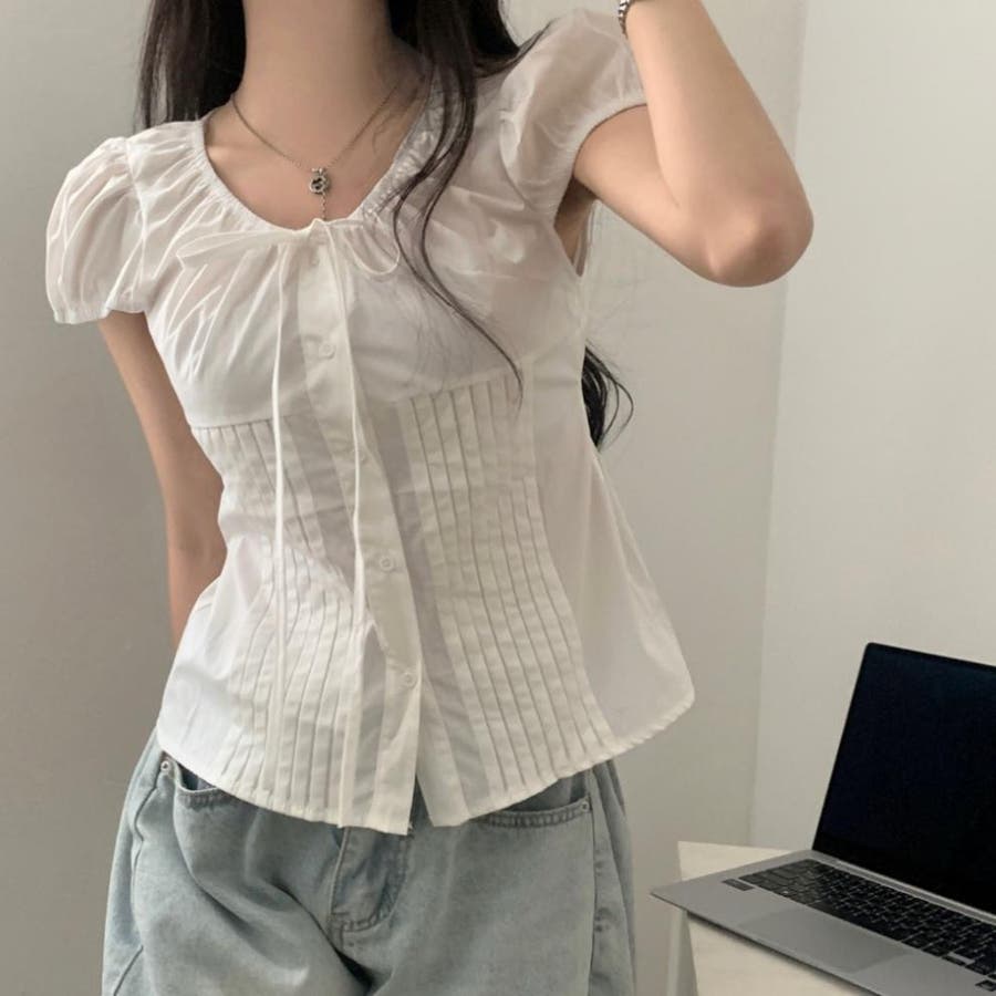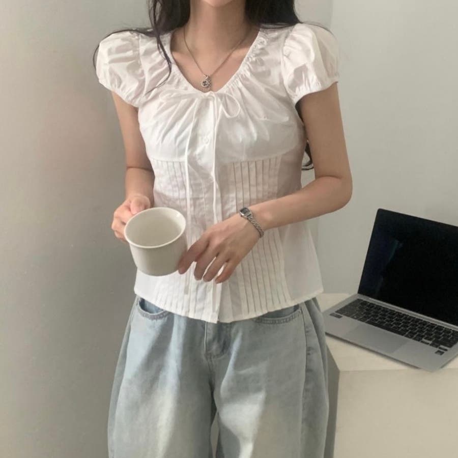 大人 カジュアル きれいめ シャツ ガーリー フェミニン フレンチスリーブ 半袖 通勤 通学 韓国ファッション 韓国コーデ Y2K オフィスカジュアル 春服 夏服 秋服 10代 20代 30代 40代 春 夏 秋