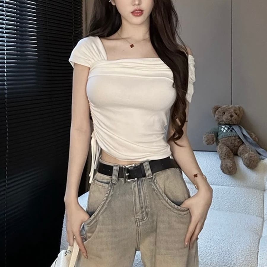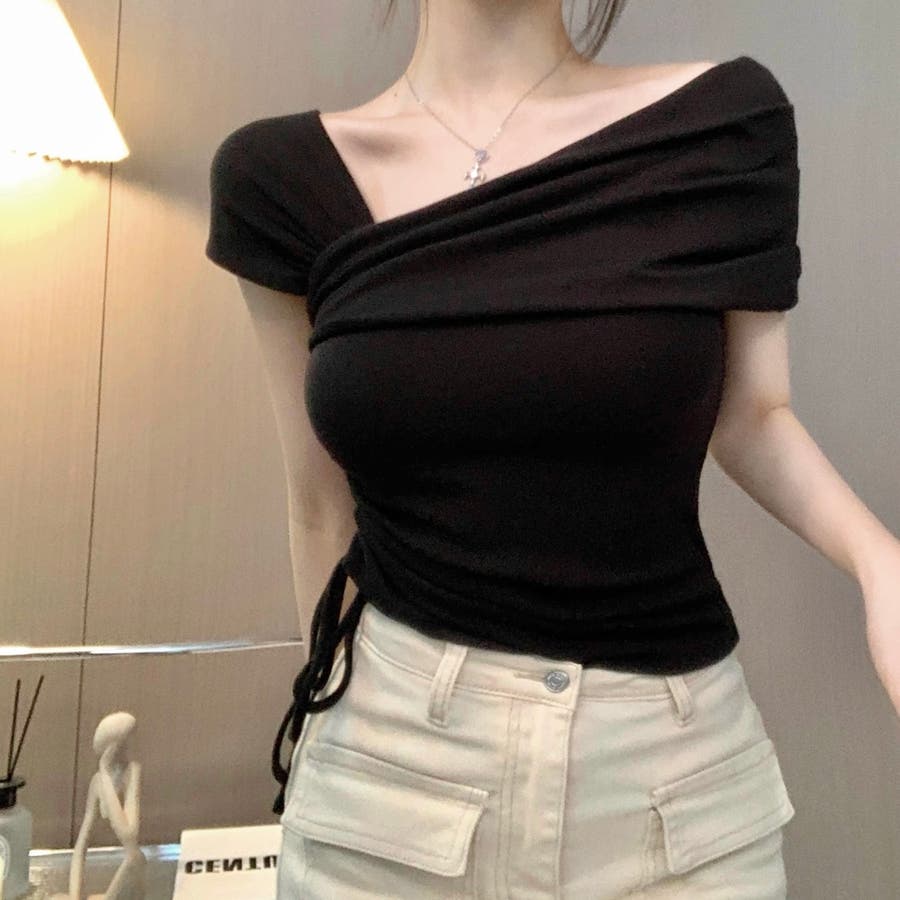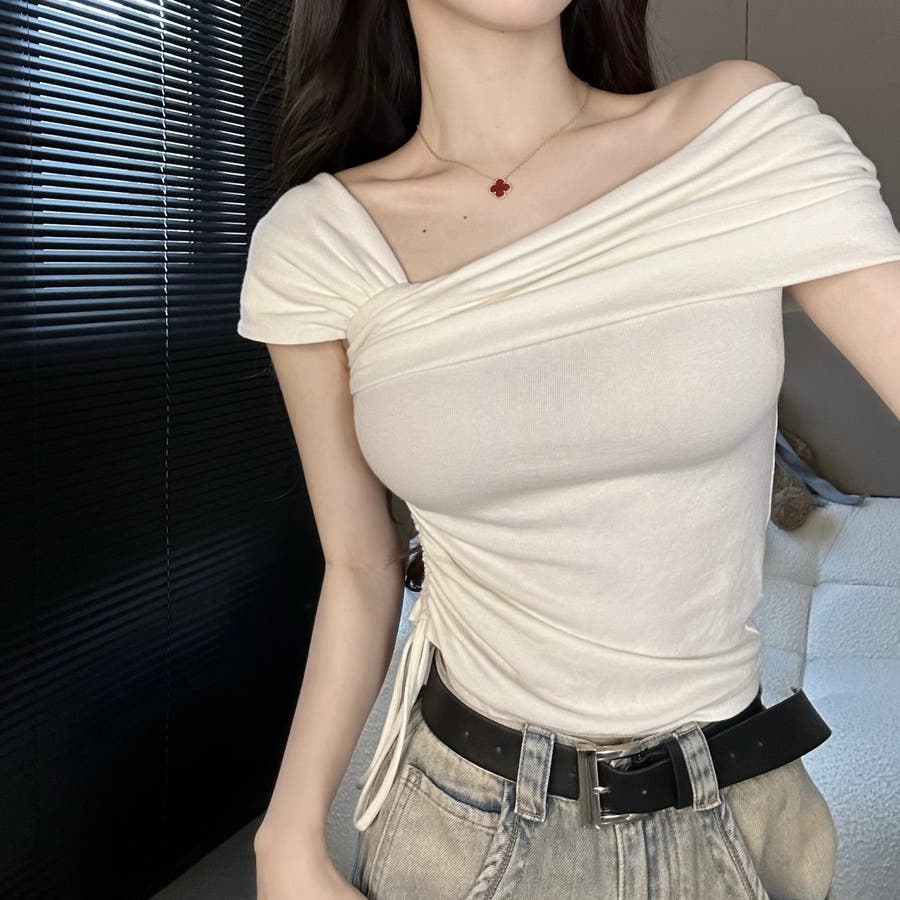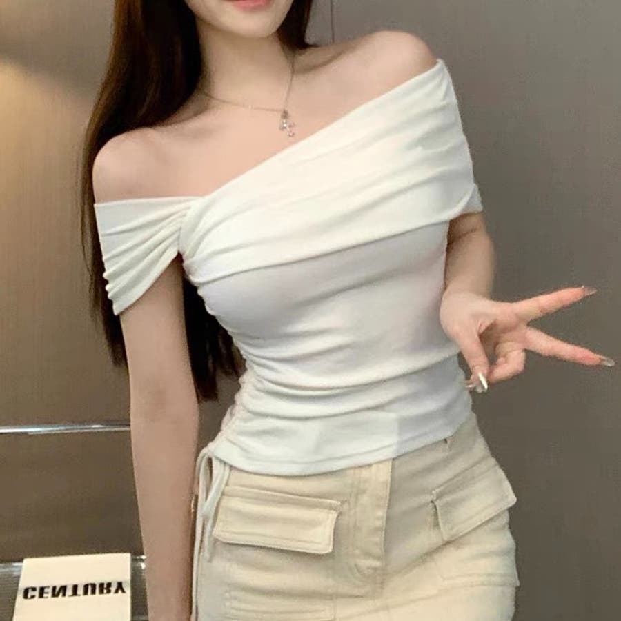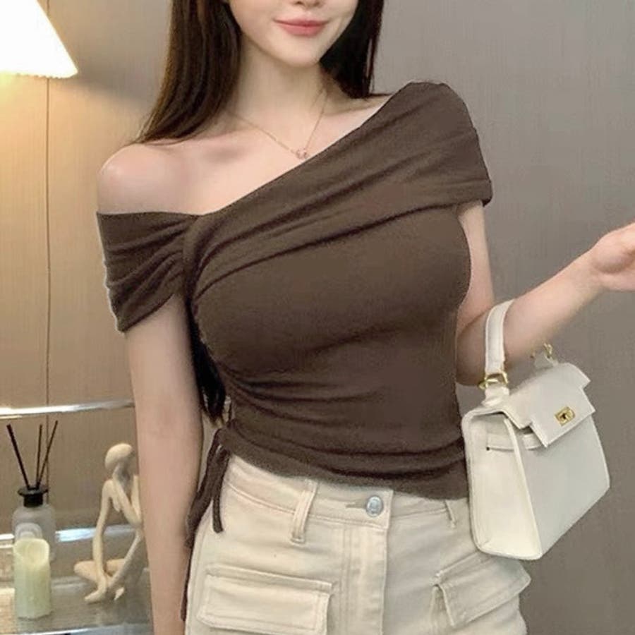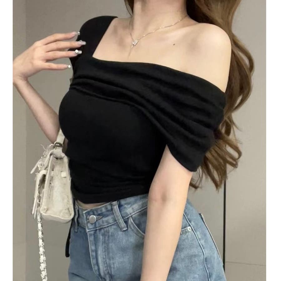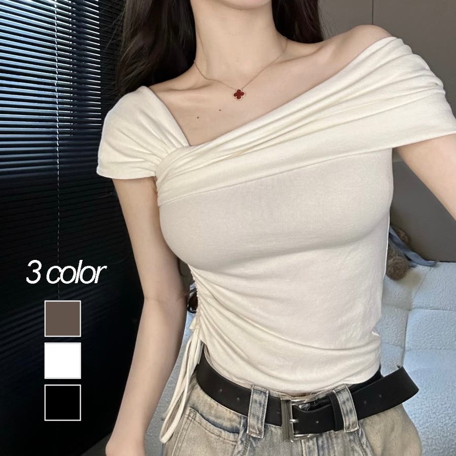 大人 カジュアル きれいめ 韓国ファッション 韓国コーデ Y2K オフィスカジュアル 半袖 肌見せ オフショルダー 肩見せ 肩出し セクシー シャーリング 春服 夏服 秋服 10代 20代 30代 40代 春 夏 秋