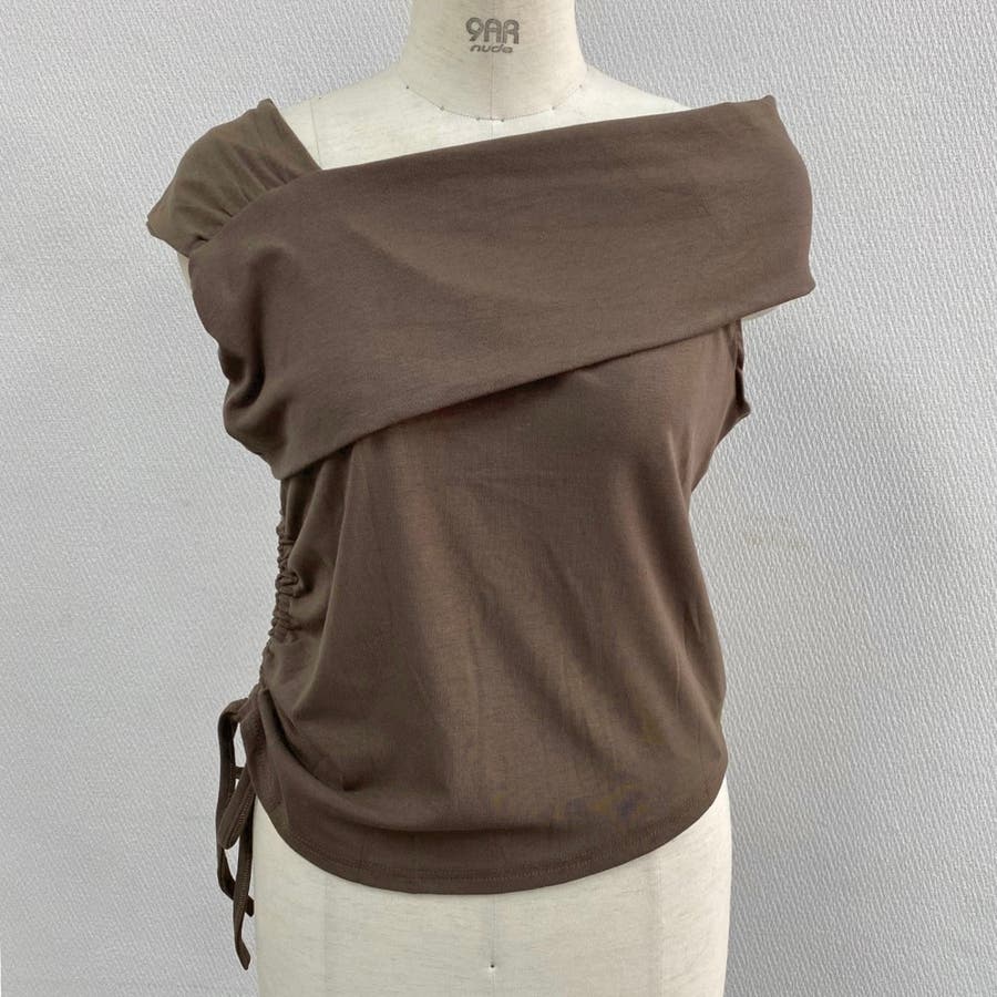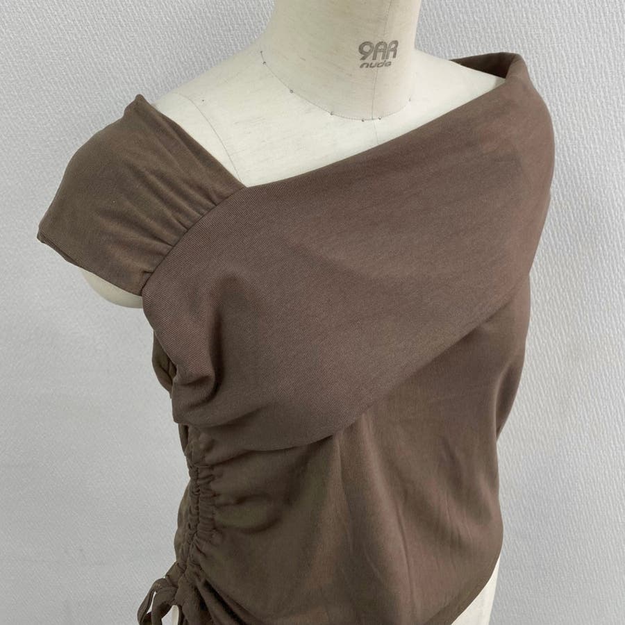 デコルテを美しく演出するアシンメトリーなオフショルデザインが魅力のトップス。
