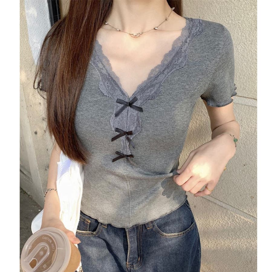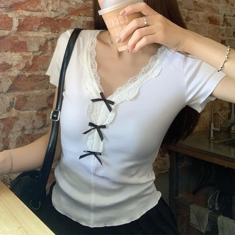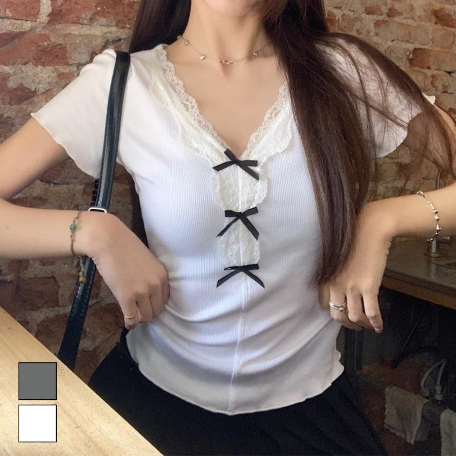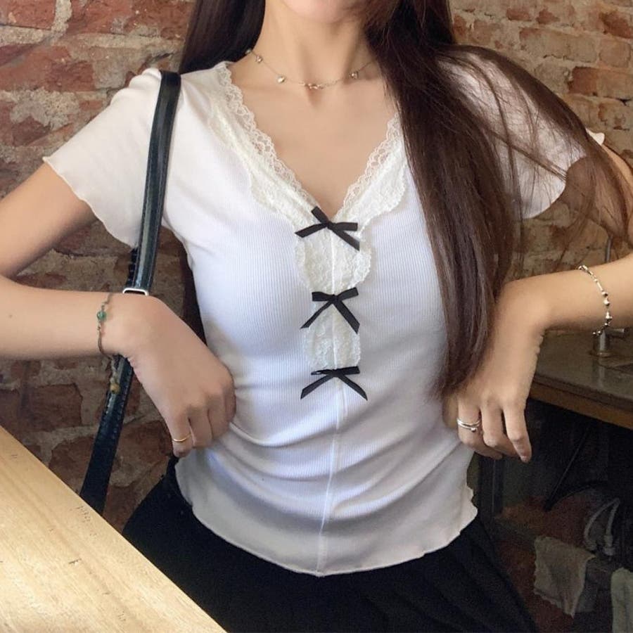 【春夏新作】リボンレースV開きトップス
