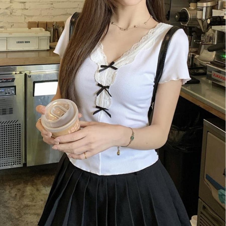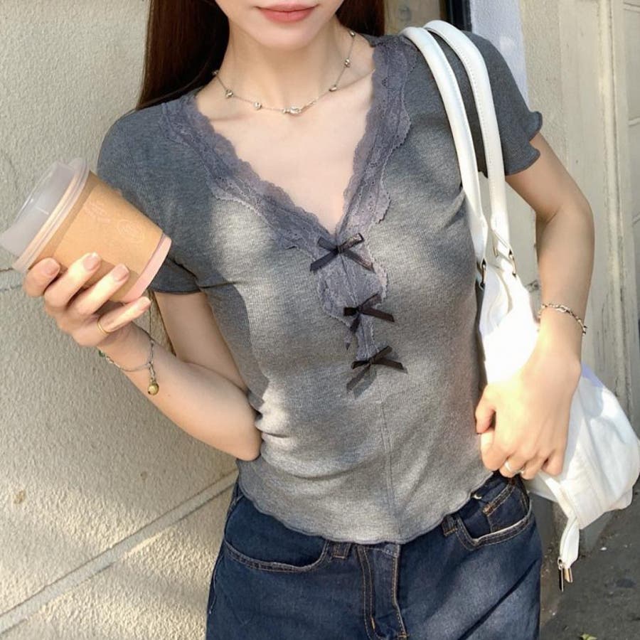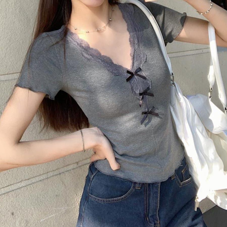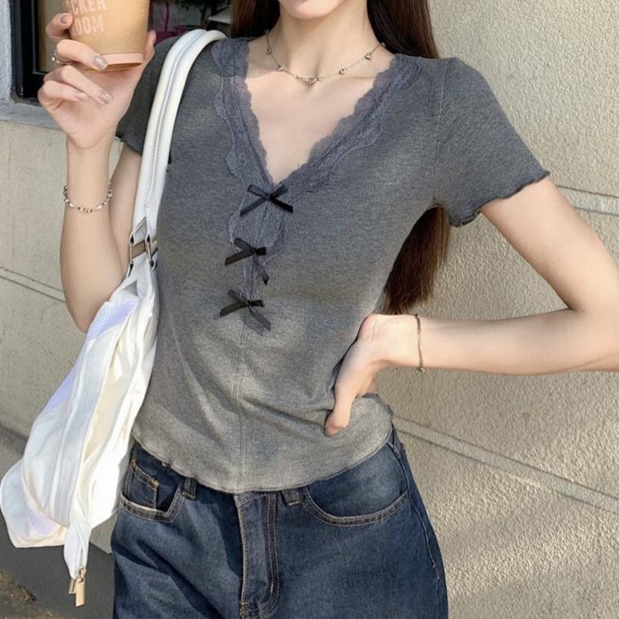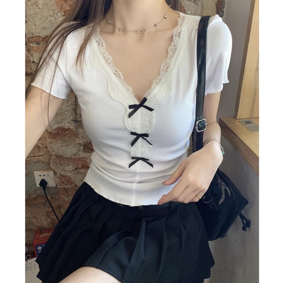 【春夏新作】リボンレースV開きトップス