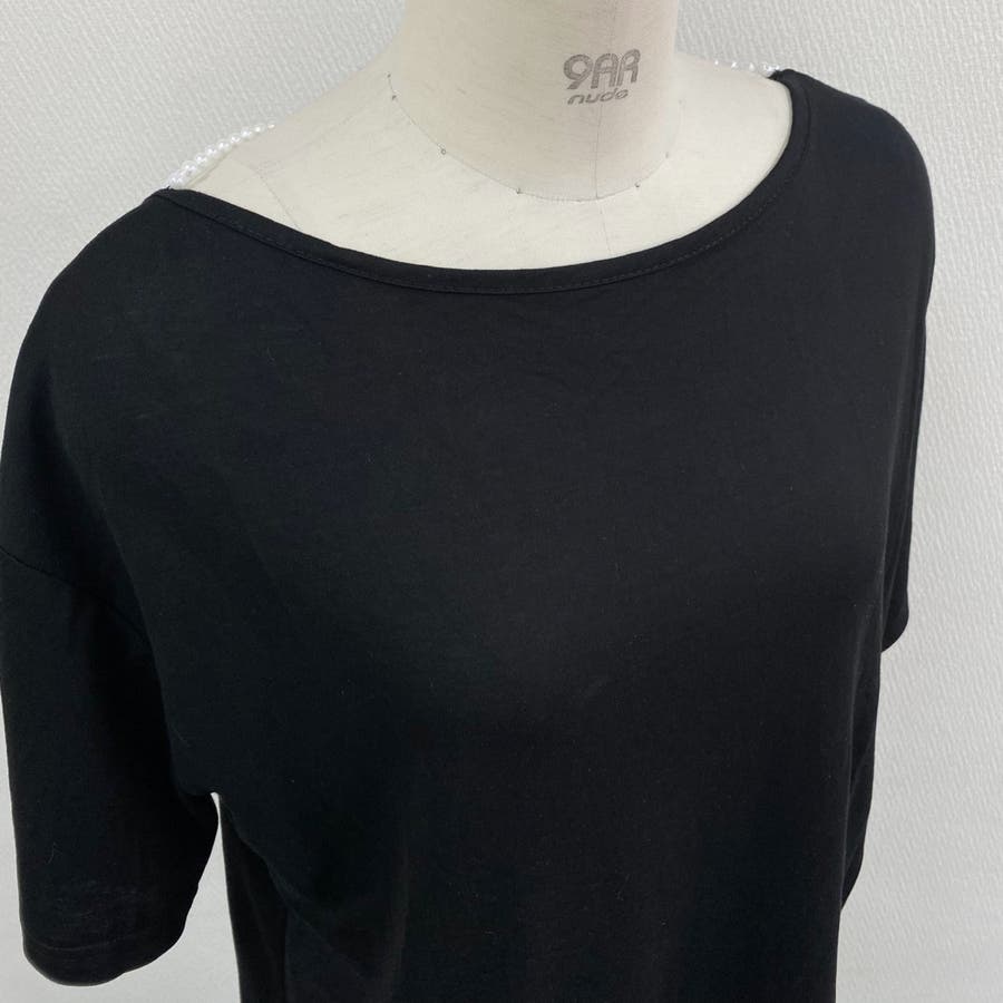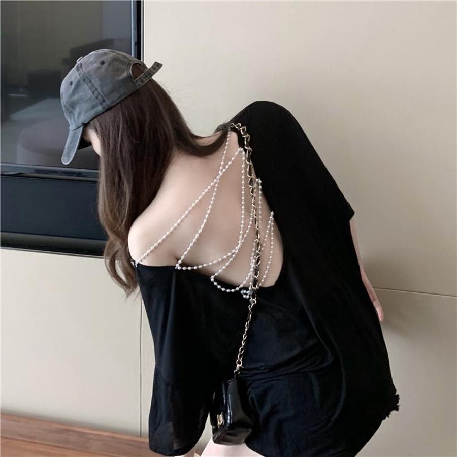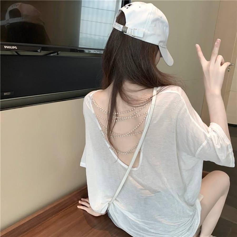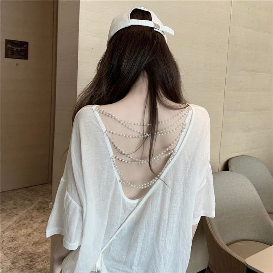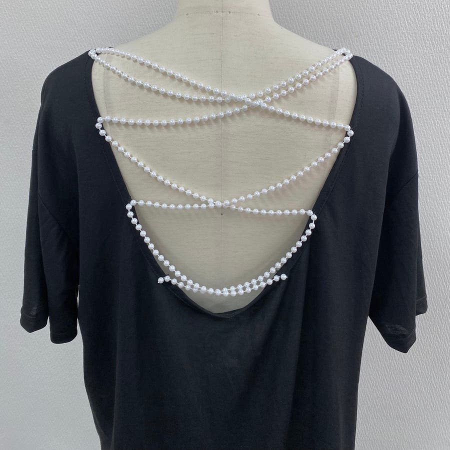 背中にあしらわれたパールチェーンが上品なアクセントになった、大人の魅力溢れるTシャツトップスです。