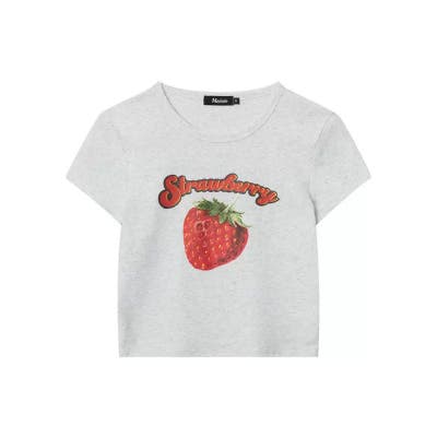 キュートなストロベリープリントが目を惹くクロップド丈Tシャツが登場。