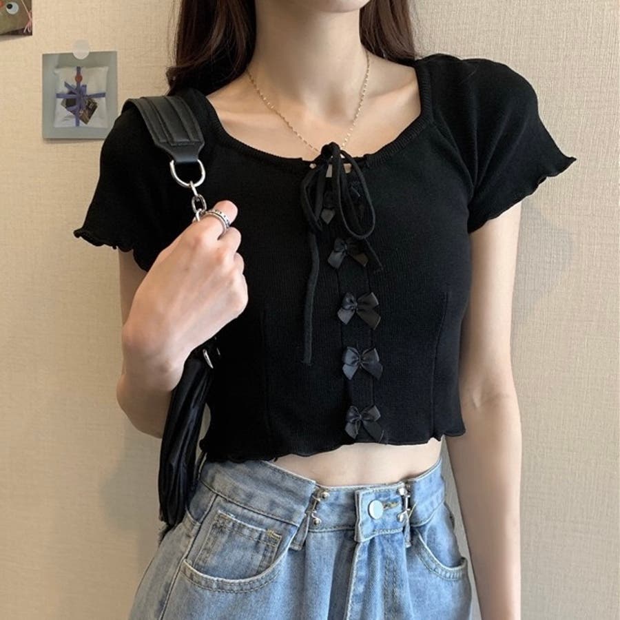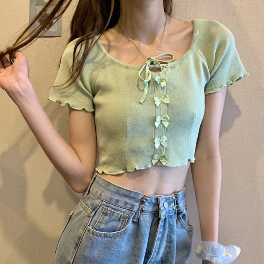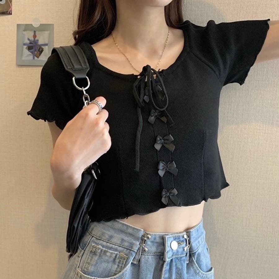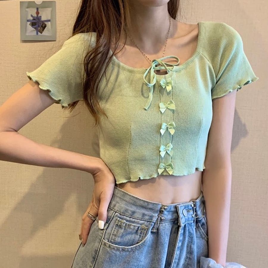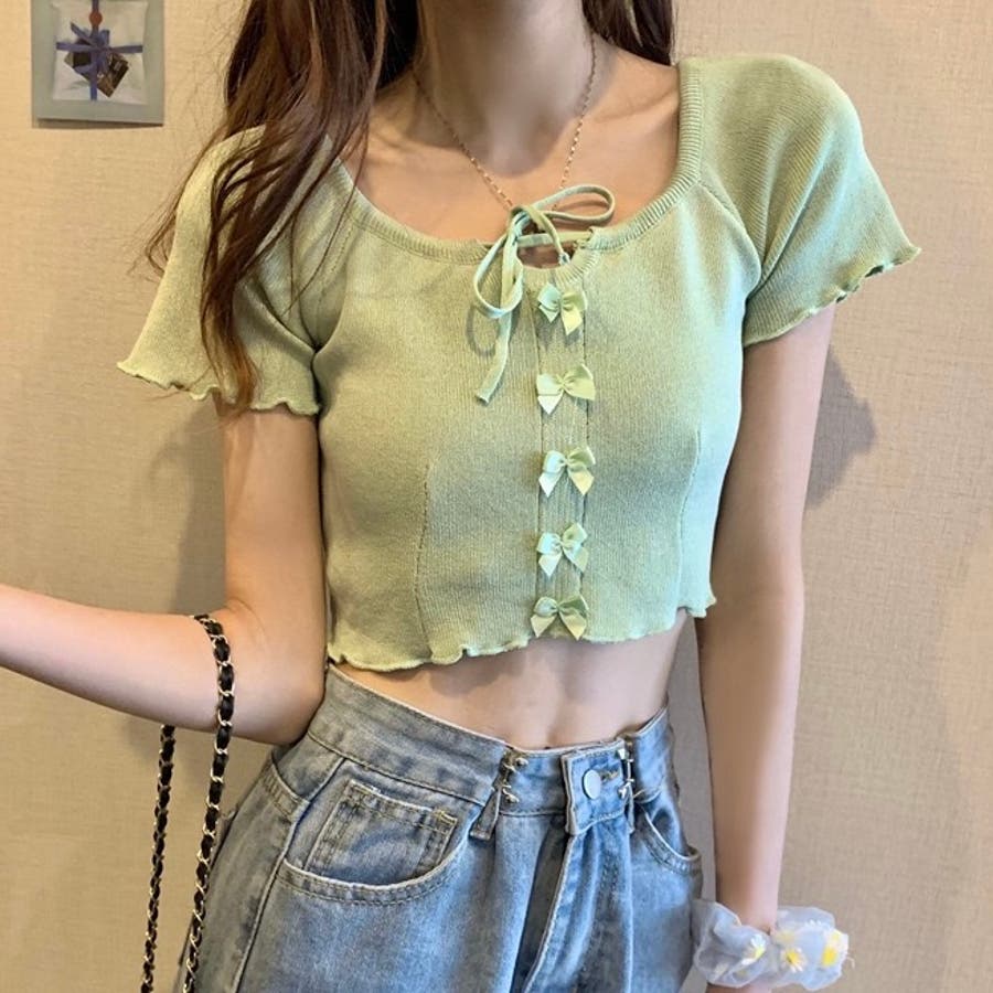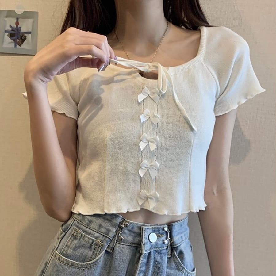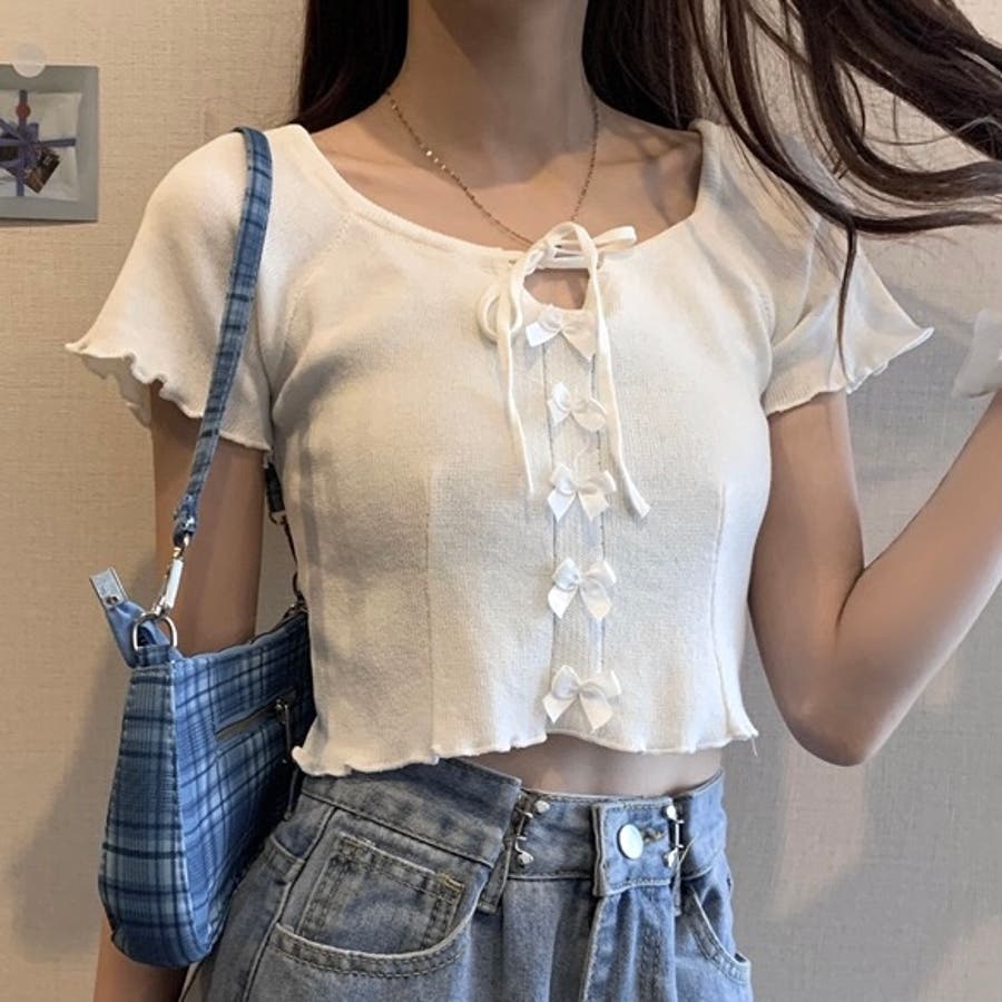 こちらのクロップド丈トップスは、フロントに並んだ小さなサテンリボンディテールが魅力のガーリースタイルアイテム。