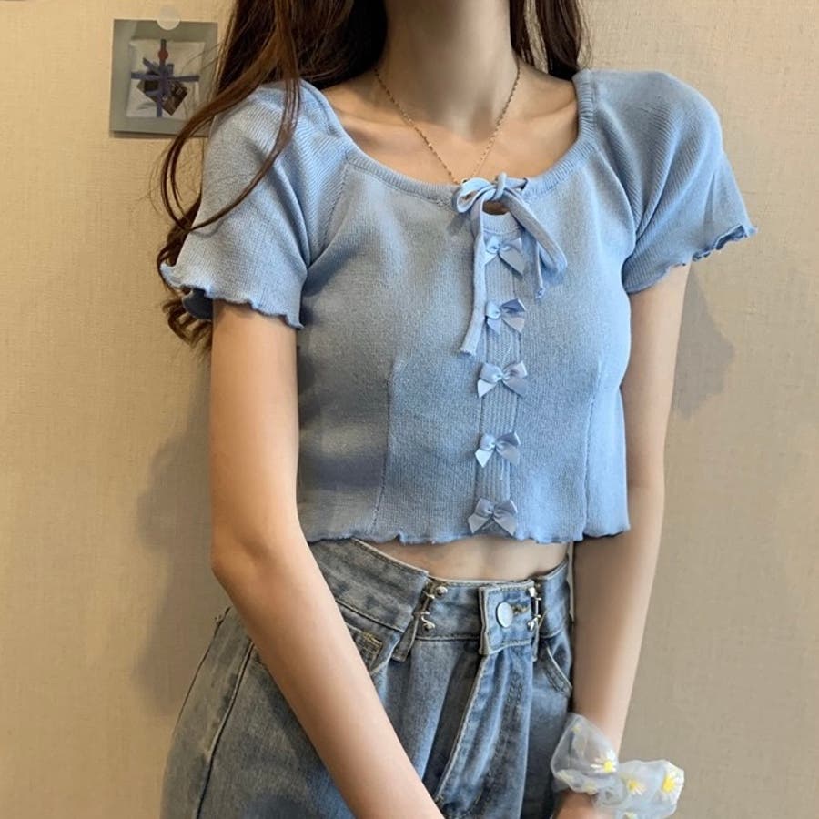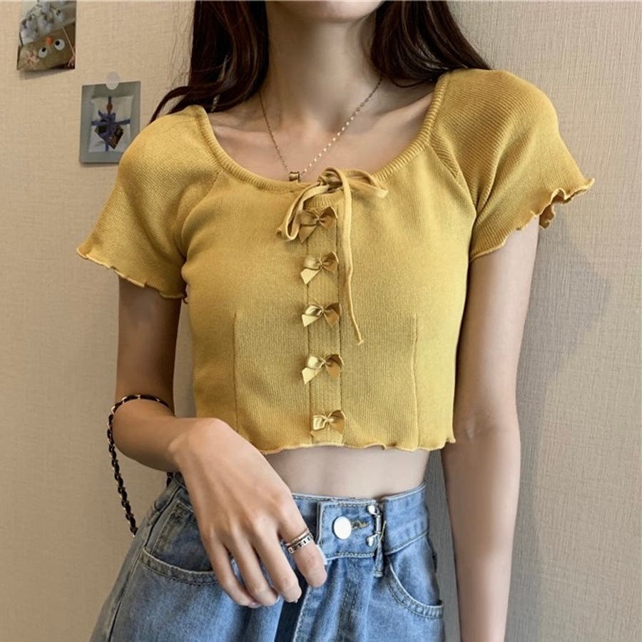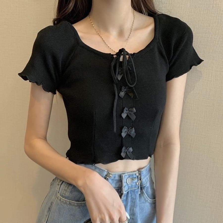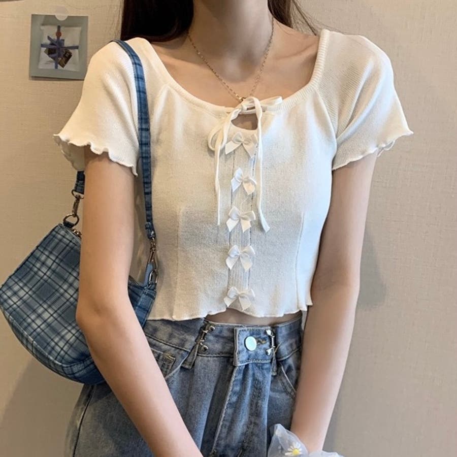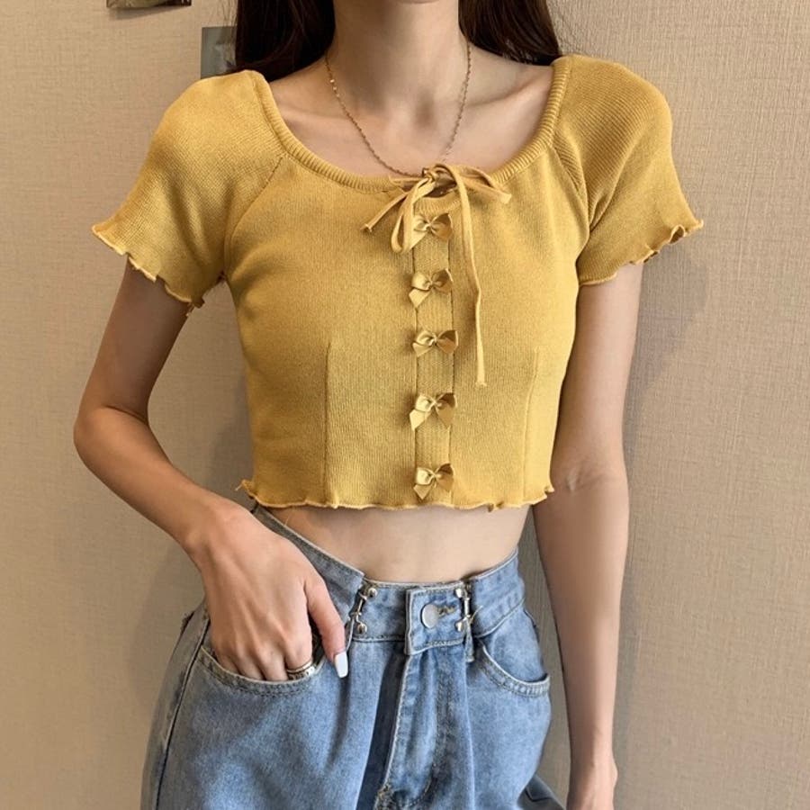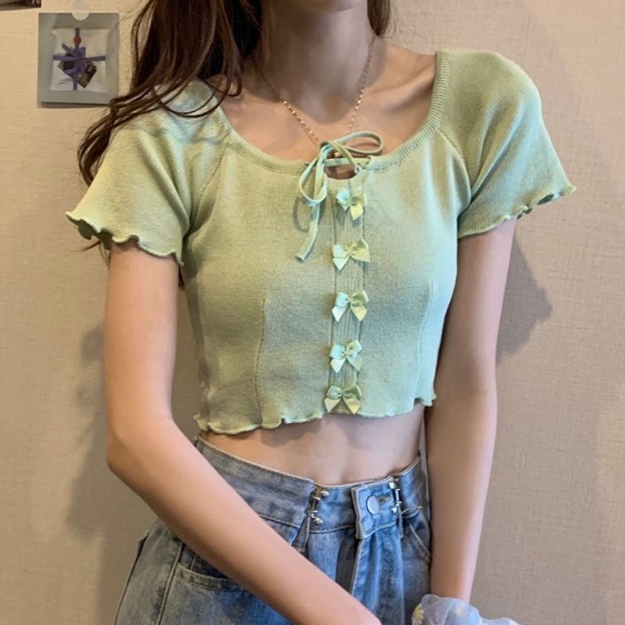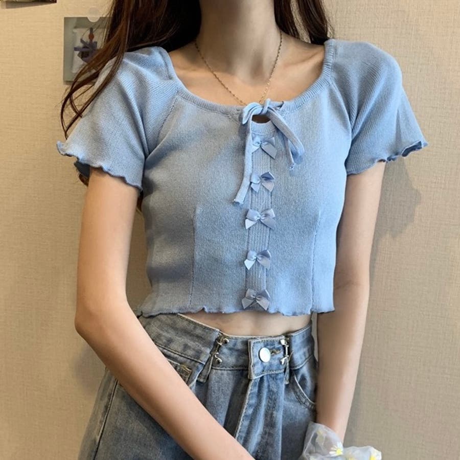 こちらのクロップド丈トップスは、フロントに並んだ小さなサテンリボンディテールが魅力のガーリースタイルアイテム。