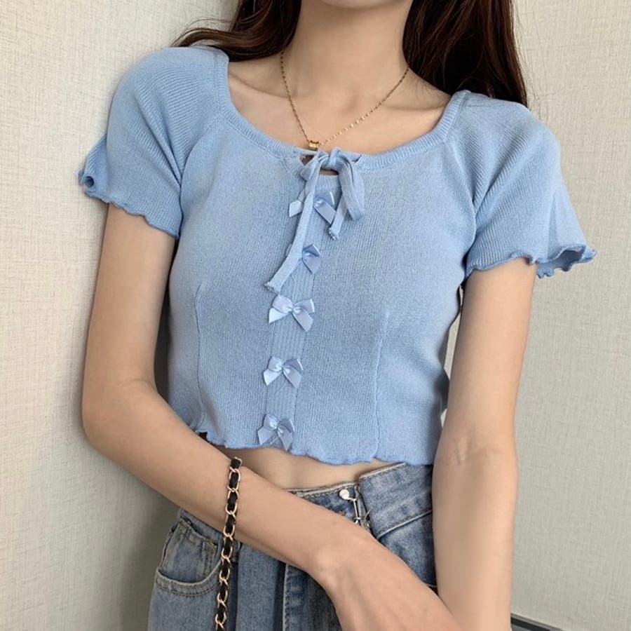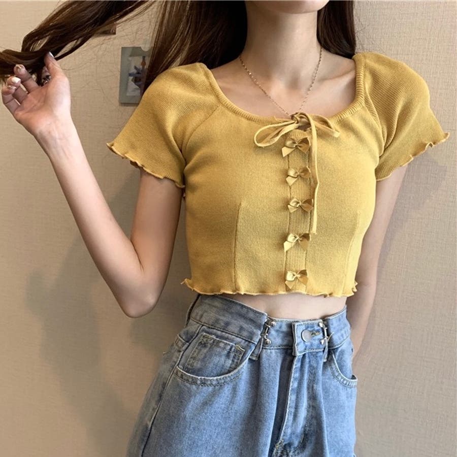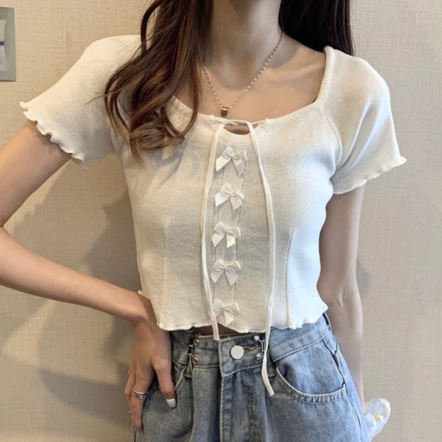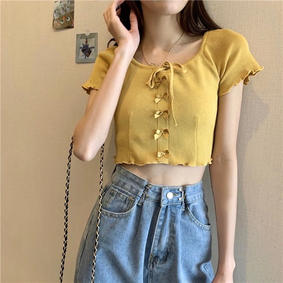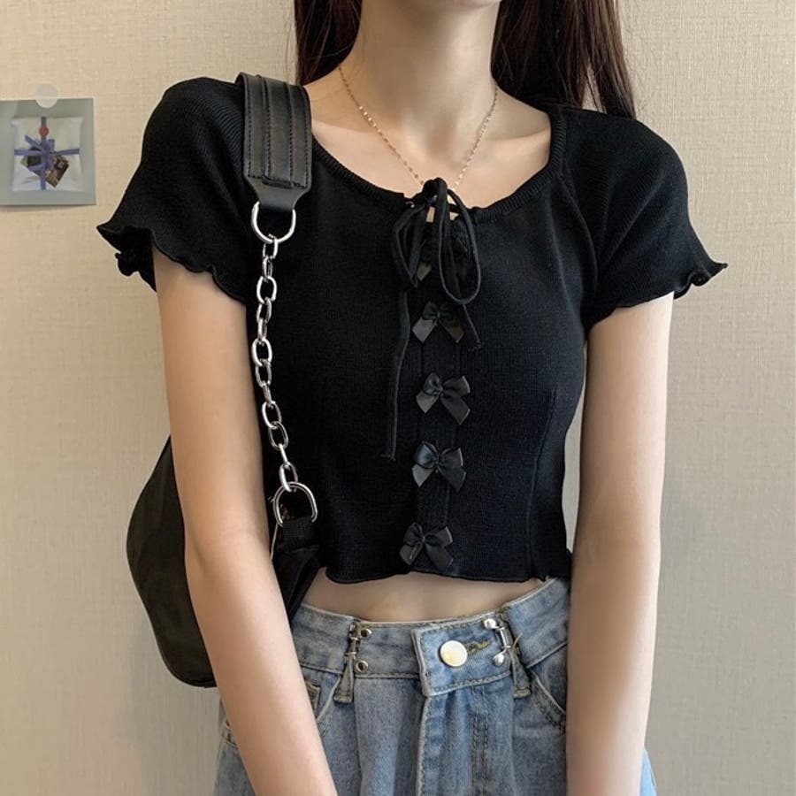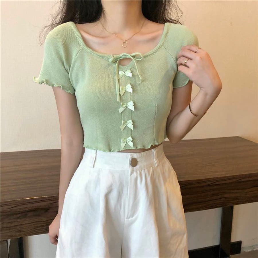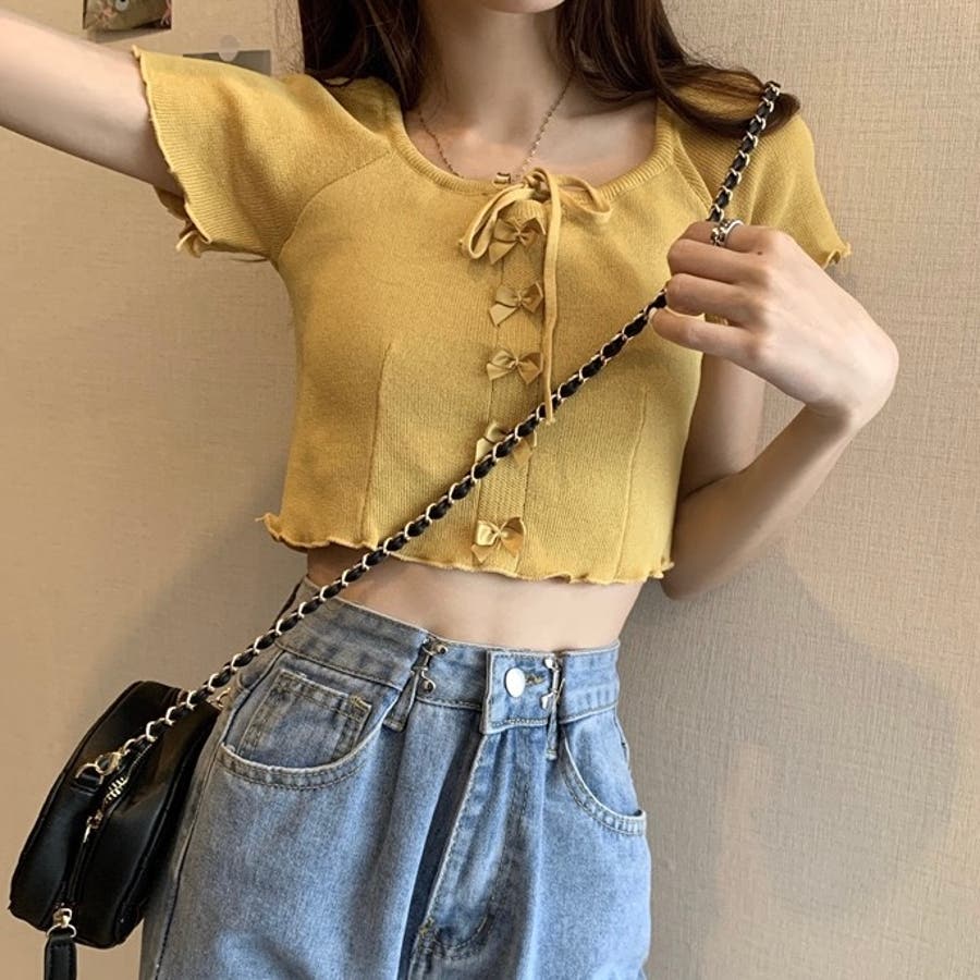 こちらのクロップド丈トップスは、フロントに並んだ小さなサテンリボンディテールが魅力のガーリースタイルアイテム。