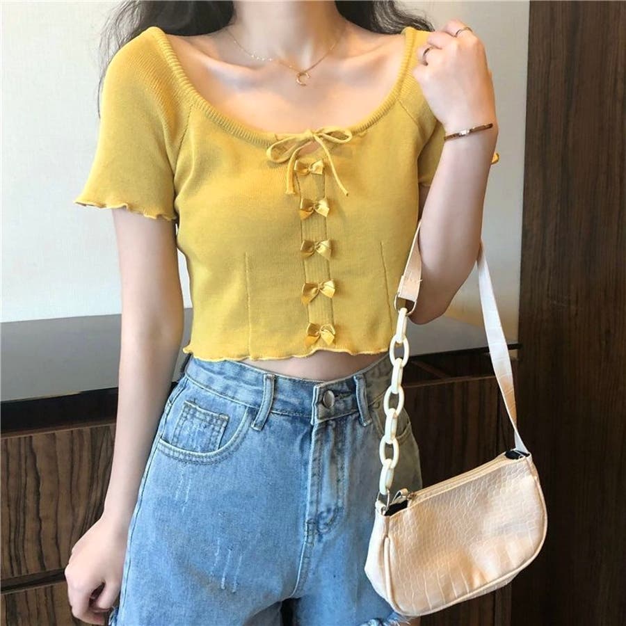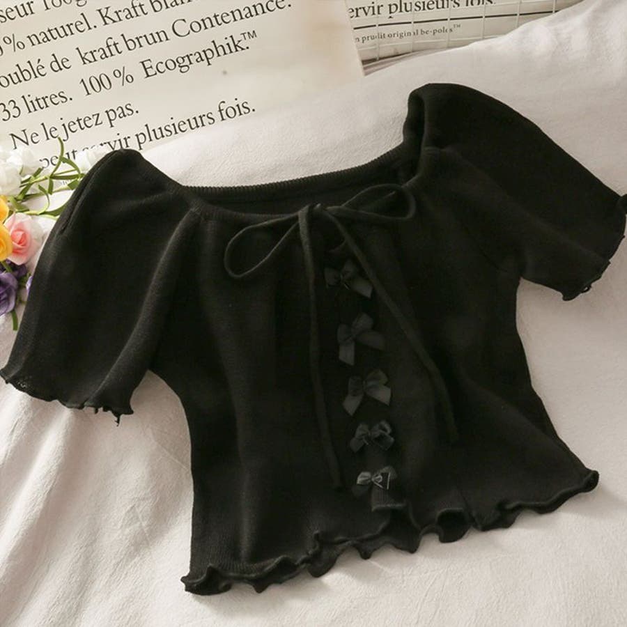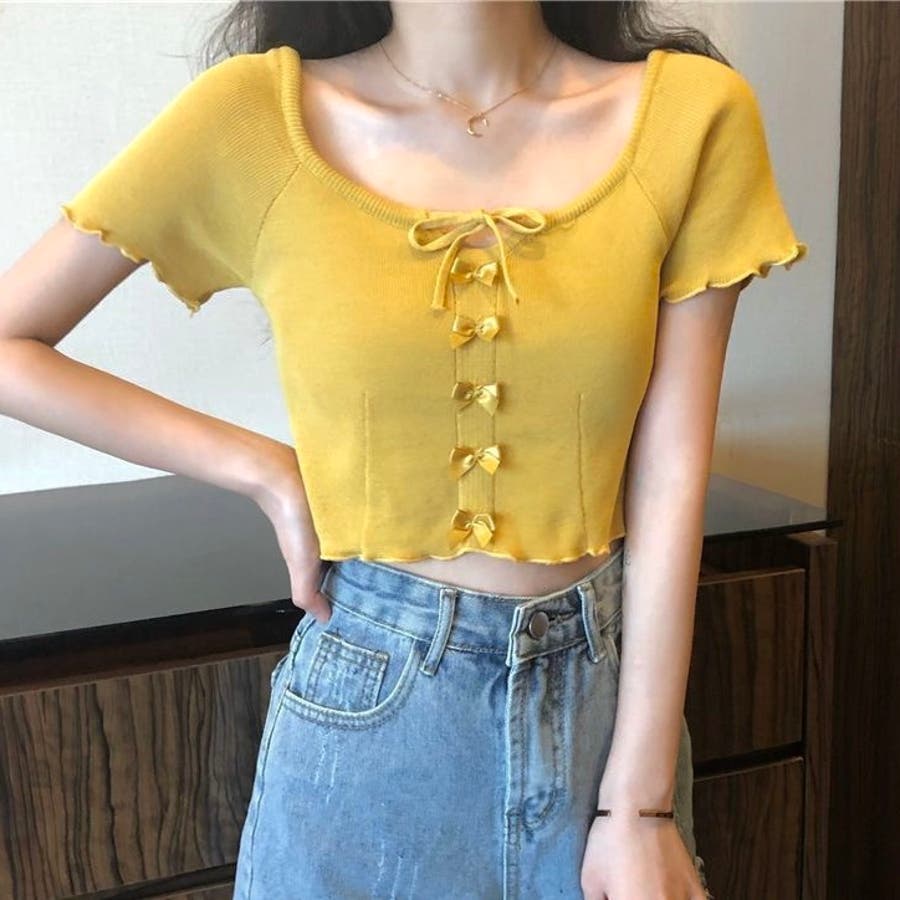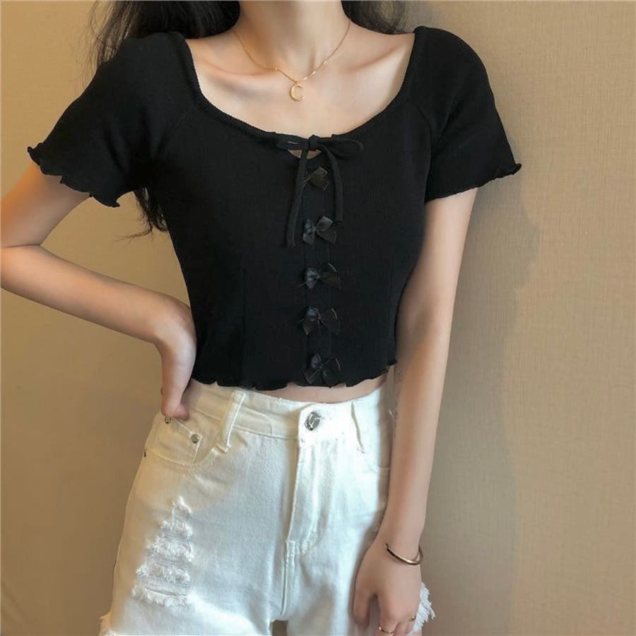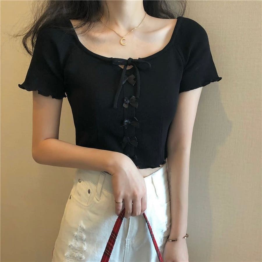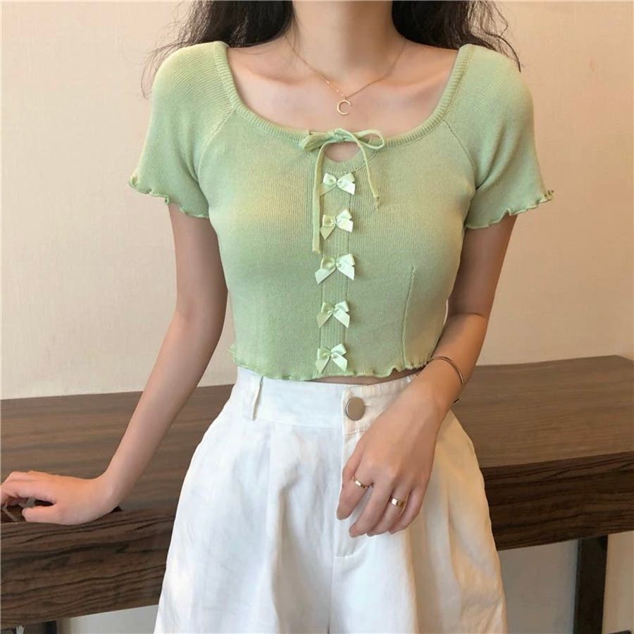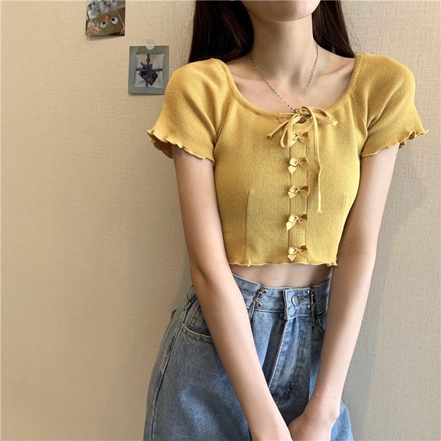 こちらのクロップド丈トップスは、フロントに並んだ小さなサテンリボンディテールが魅力のガーリースタイルアイテム。