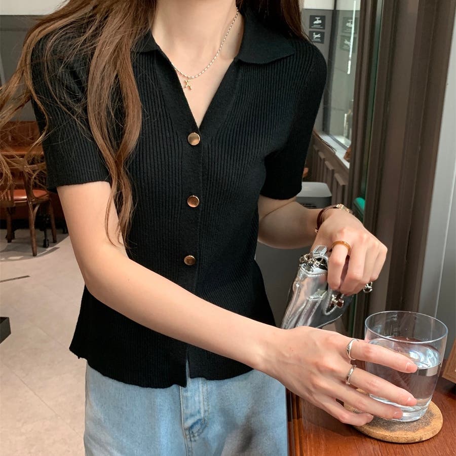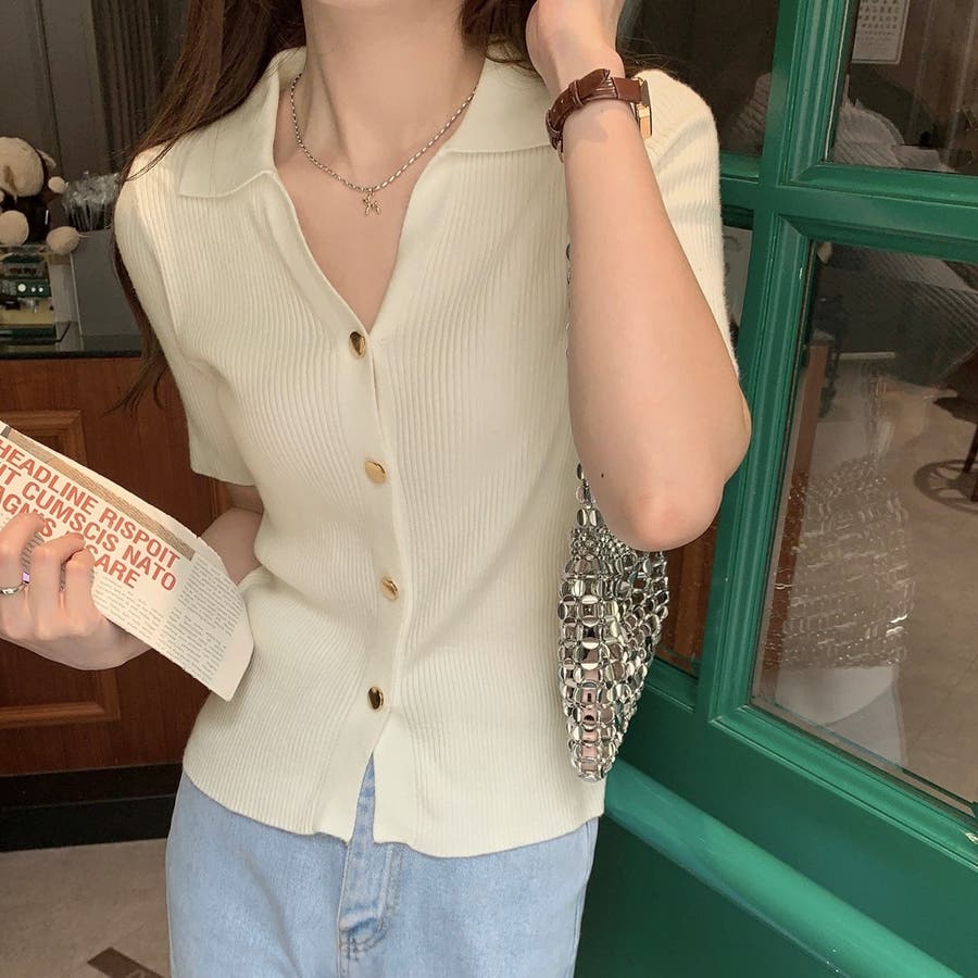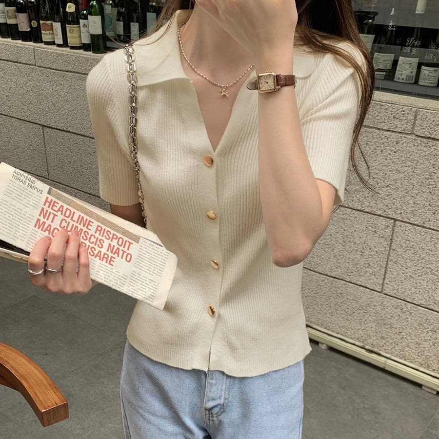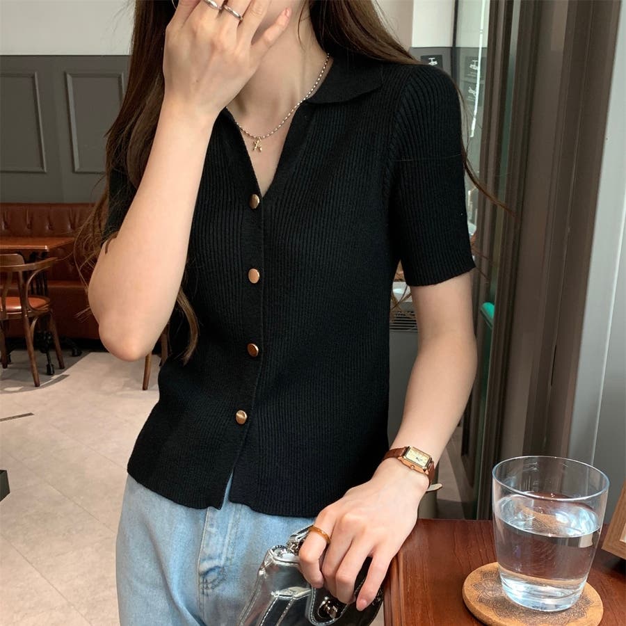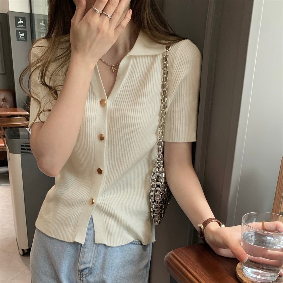 【春夏新作】ゴールド釦襟付き半袖リブニット