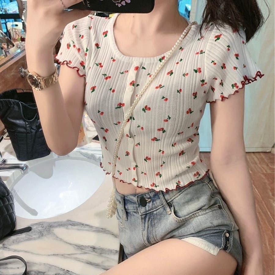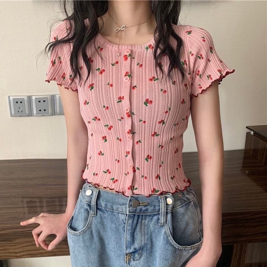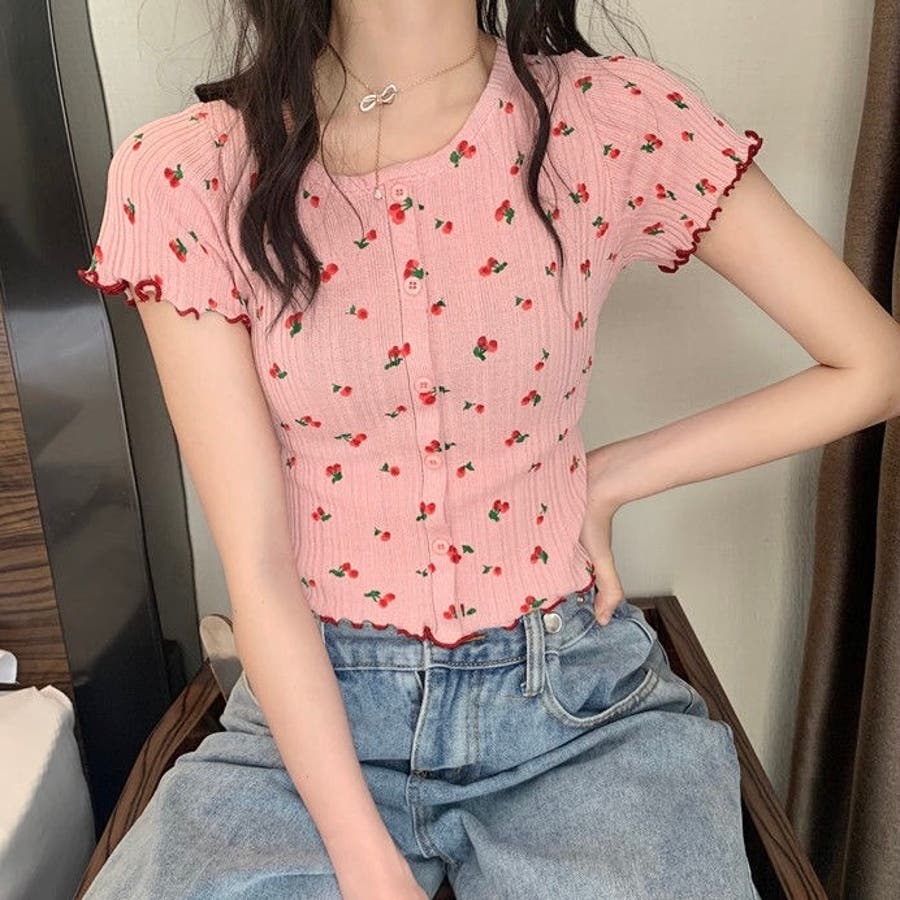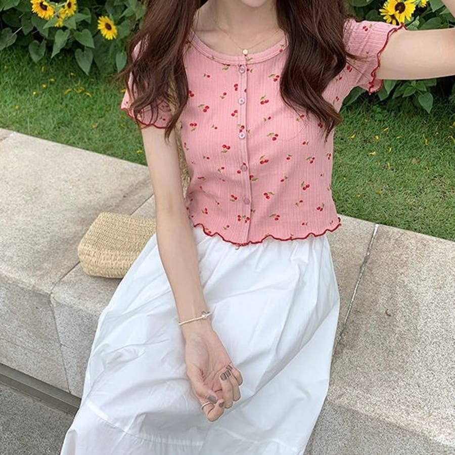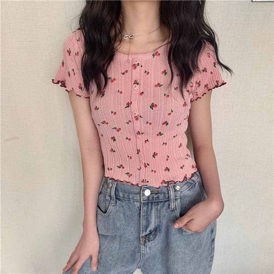 大人 カジュアル きれいめ 韓国ファッション 韓国コーデ Y2K オフィスカジュアル 春服 夏服 秋服 半袖 ニット サマーニット Tシャツ フェミニン ガーリー キュート さくらんぼ 10代 20代 30代 40代 春 夏 秋